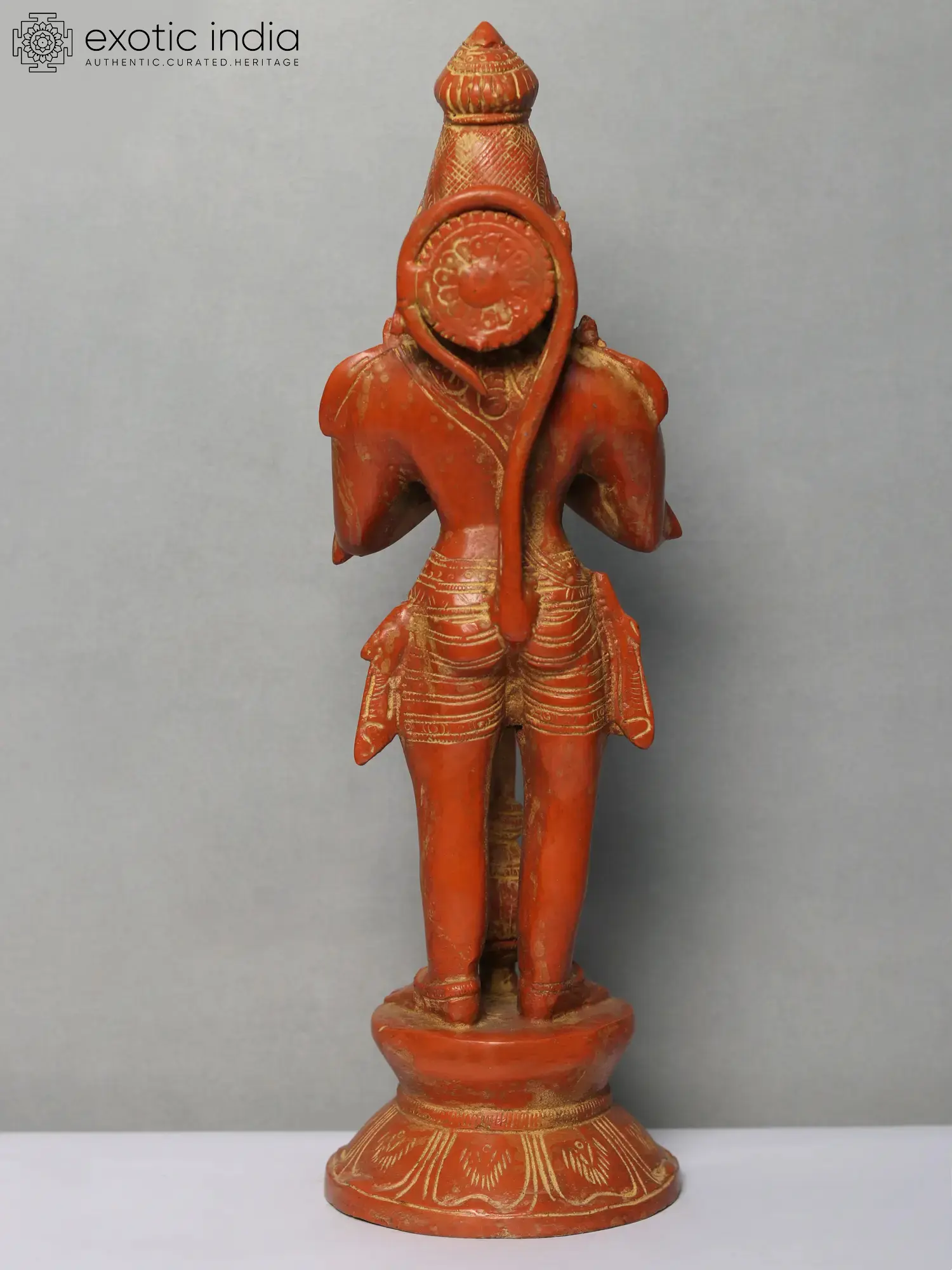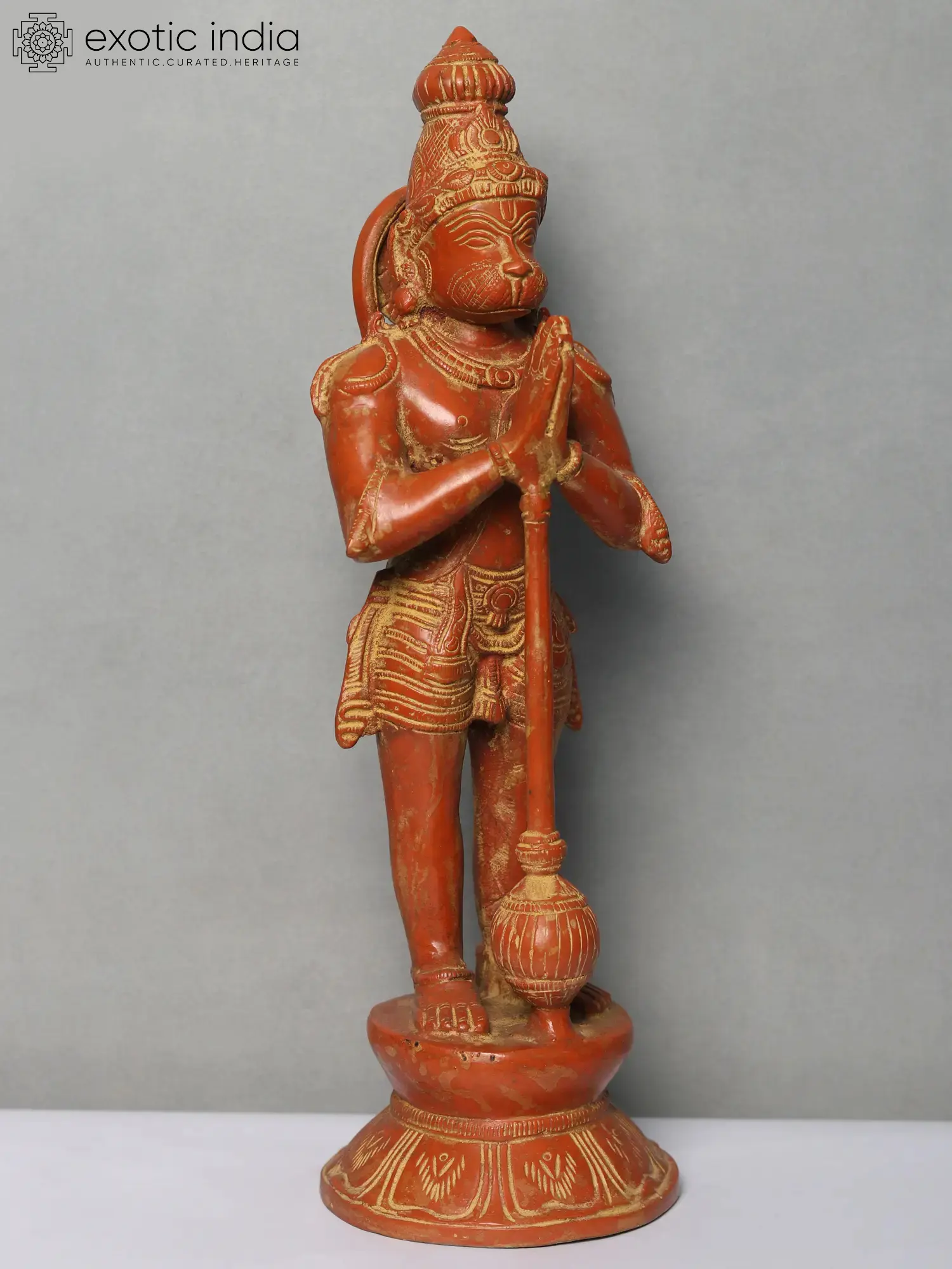 Cast by skilled artisans, this brass sculpture showcases their mastery in capturing the essence of Hanuman’ss divine form - every intricate detail, from his finely sculpted muscular physique to his devotional facial features, reflects the artisan's deep reverence. The red embodies strength and passion, enhancing the sculpture's presence, and imbuing it with an energetic aura that captivates the beholder. As the divine messenger of Lord Rama, Hanuman is revered for his unwavering devotion and selfless service. In this standing posture, Hanuman stands tall and proud, embodying the spirit of loyalty and the unwavering commitment to righteousness. His presence serves as a reminder to devotees to emulate his virtues of devotion, courage, and selflessness in their own lives.
