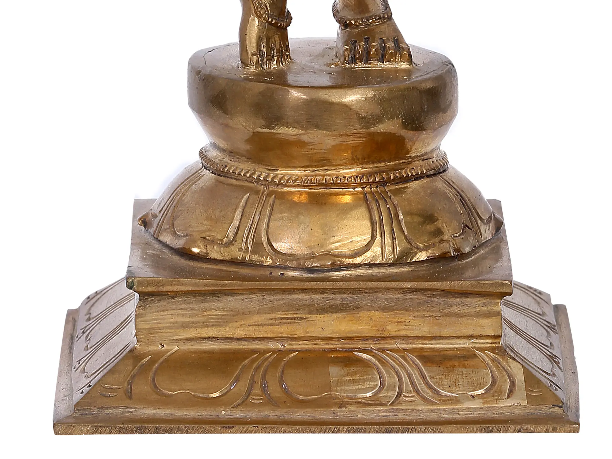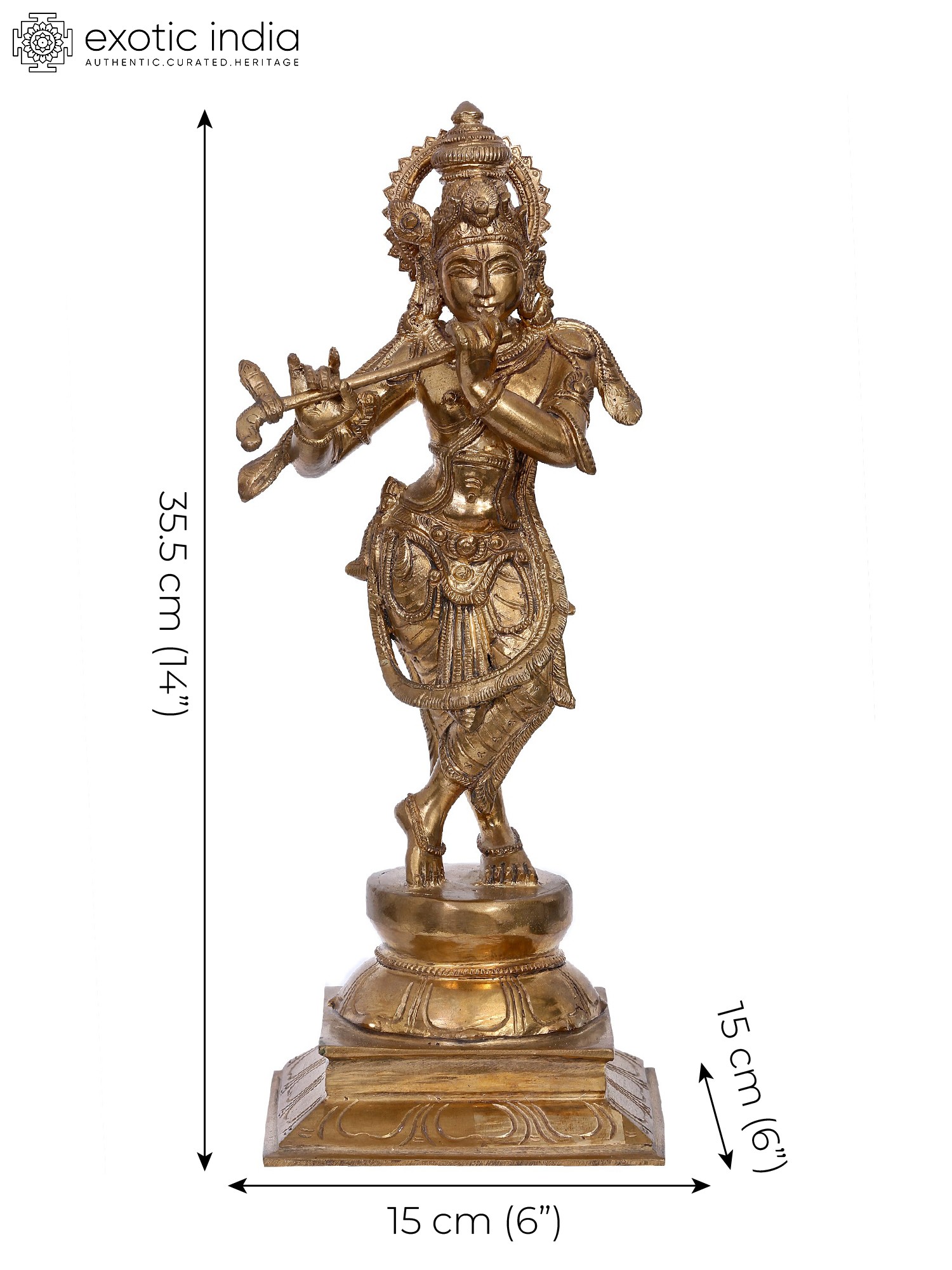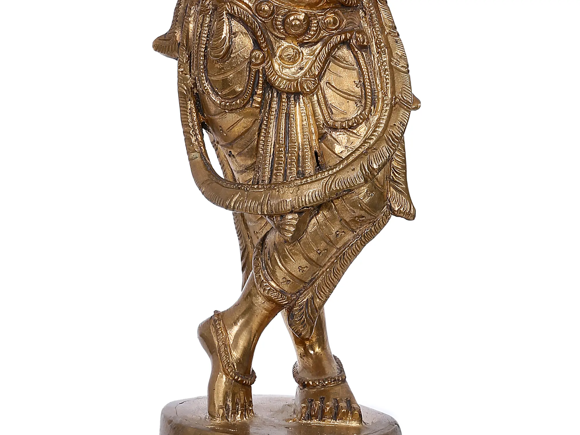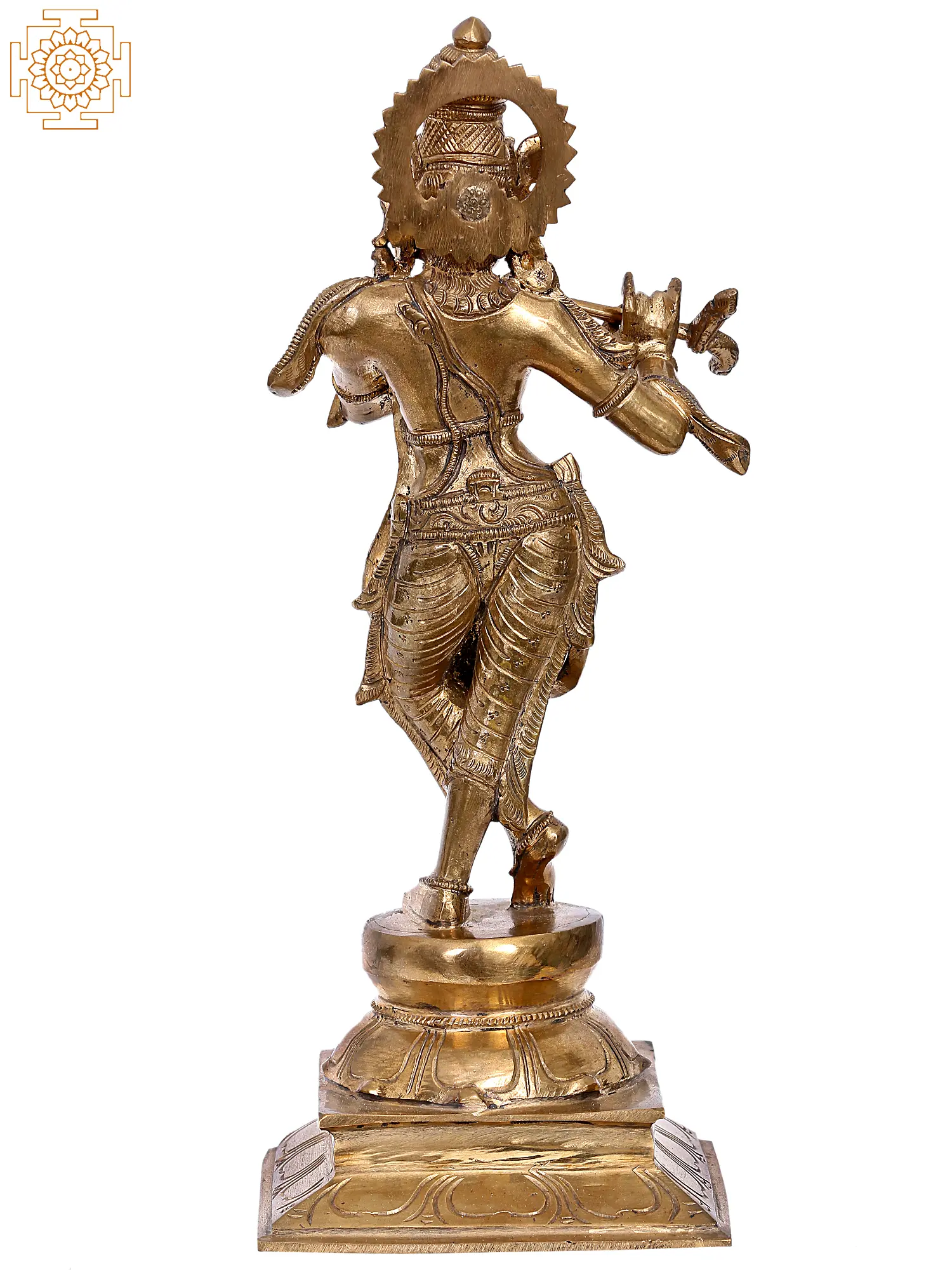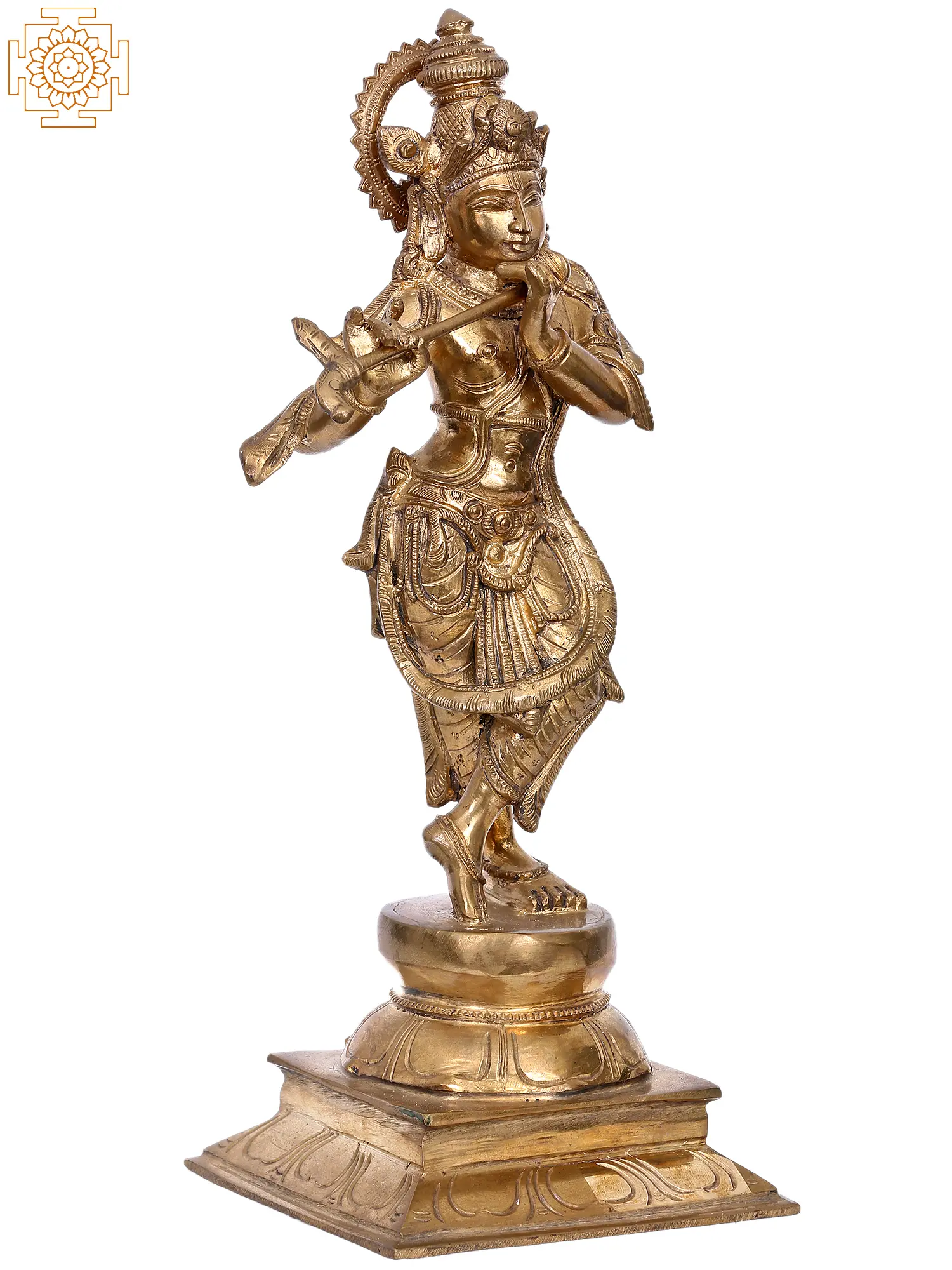 Standing in the graceful Tribhanga or triple bent posture, this aspect of Sri Krishna is popularly known as Venugopala and Murli-Manohara, highlighting the beauty of the Lord as he blows sweet tunes in his Venu or Murli- his divine flute. In this bronze icon which glows with a golden aura, Krishna is adorned regally, with Mukuta, Makara-kundala or earrings (Makara motif is a symbol of divinity and royalty), Yajnopavita, and a girdle that clasps around his dhoti. In this Roopa, Krishna is revered in most Hindu homes, as the source of supreme bliss and divine grace, that is felt like the sweetness of his flute.