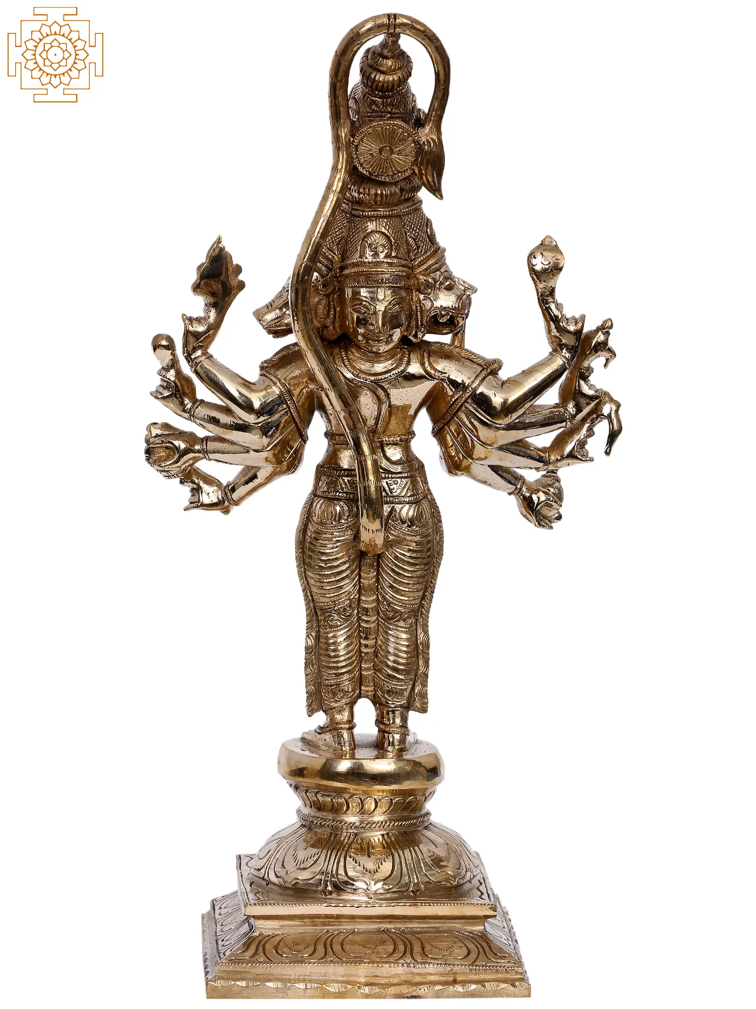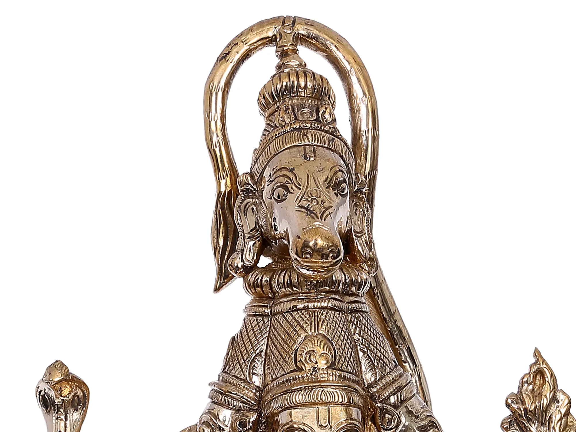The Bronze Standing Panchamukhi Hanuman is a remarkable depiction of Lord Hanuman in the form of Panchamukha (five-faced). This Lusturous Statue is crafted from panchaloha bronze radiating strength and divine energy. With ten hands carrying various symbols and weapons, Panchamukhi Hanuman symbolizes valor and protection. Each face represents different aspects of Hanuman's divine presence, encompassing wisdom, courage, and devotion. This statue holds immense significance in Hindu mythology, believed to bring auspiciousness and safeguard devotees from negative forces.
