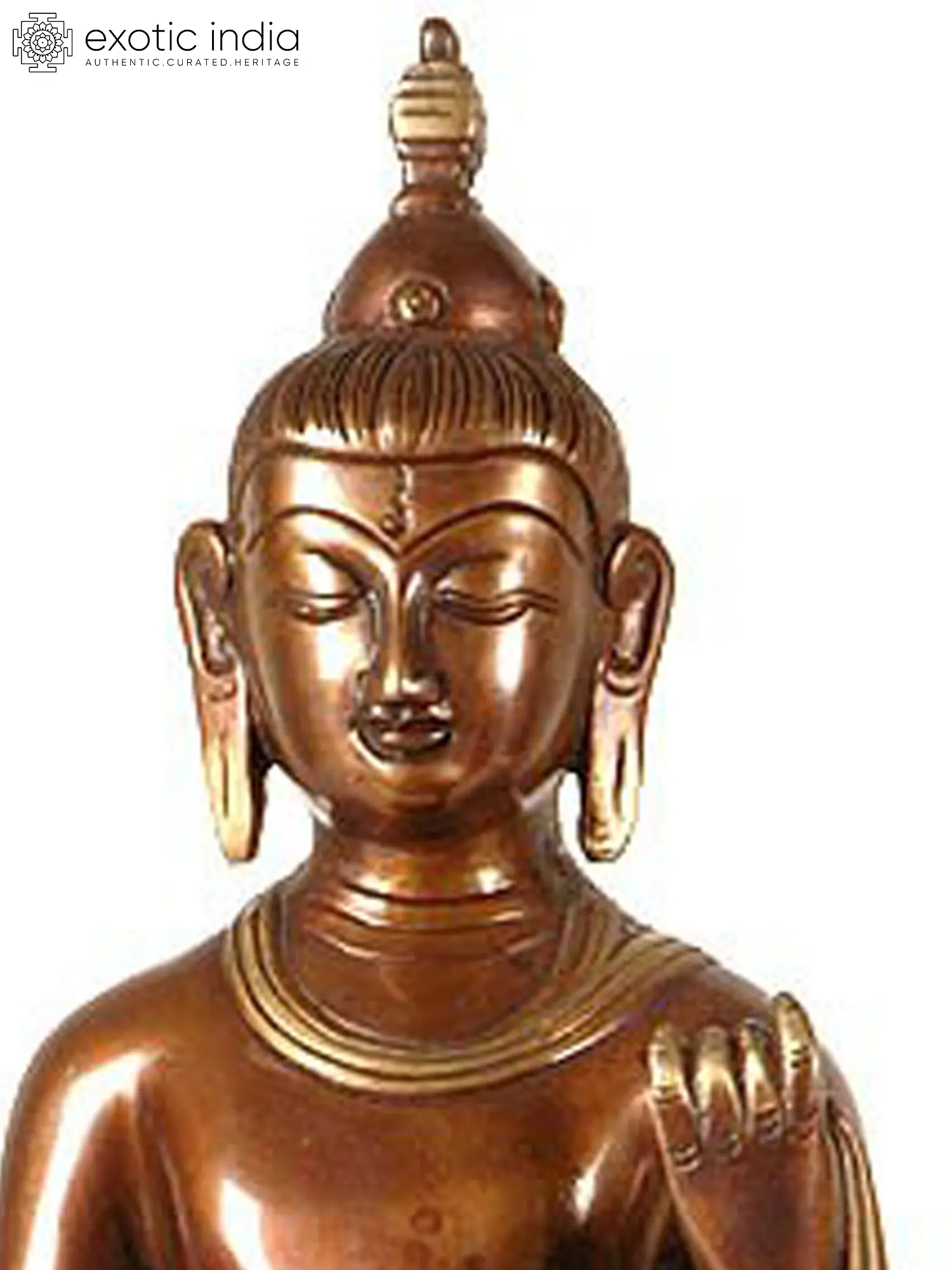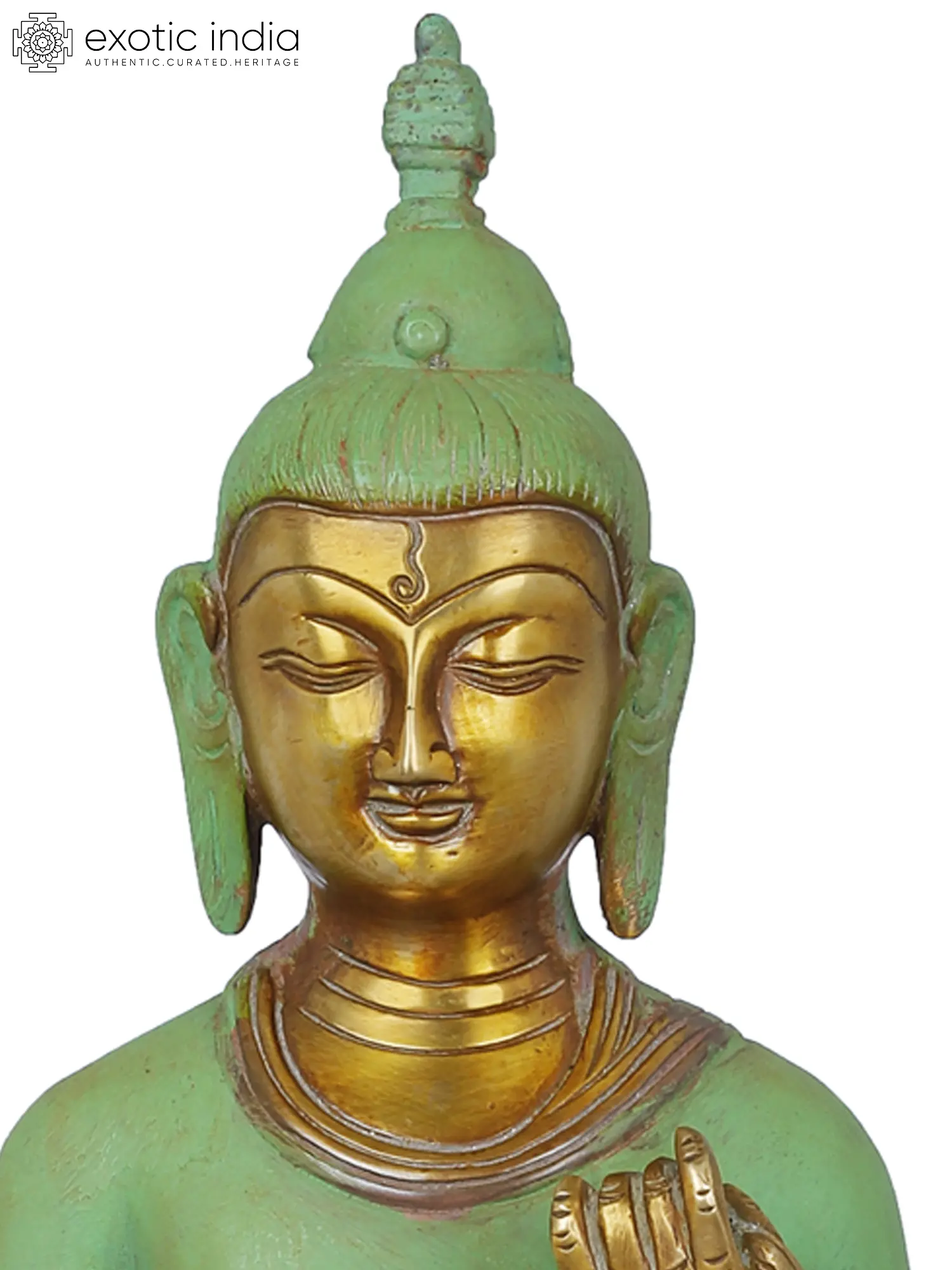 Crafted by skilled artisans in India, this brass sculpture is more than just a decorative piece; it is a testament to generations of artistic tradition and deep devotional practice. The meticulous attention to detail, from the urna on the forehead, symbolizing spiritual insight, to the ushnisha, a cranial protuberance representing his awakened mind, speaks of a profound understanding of Buddhist iconography. The cool, earthy tones of the robe contrast beautifully with the golden sheen of the face and hands, creating a visual harmony that is both striking and calming. Each sculpture is a unique work of art, carrying with it the spirit and dedication of its maker, and offering a tangible connection to the spiritual heritage of India. ––––––––––