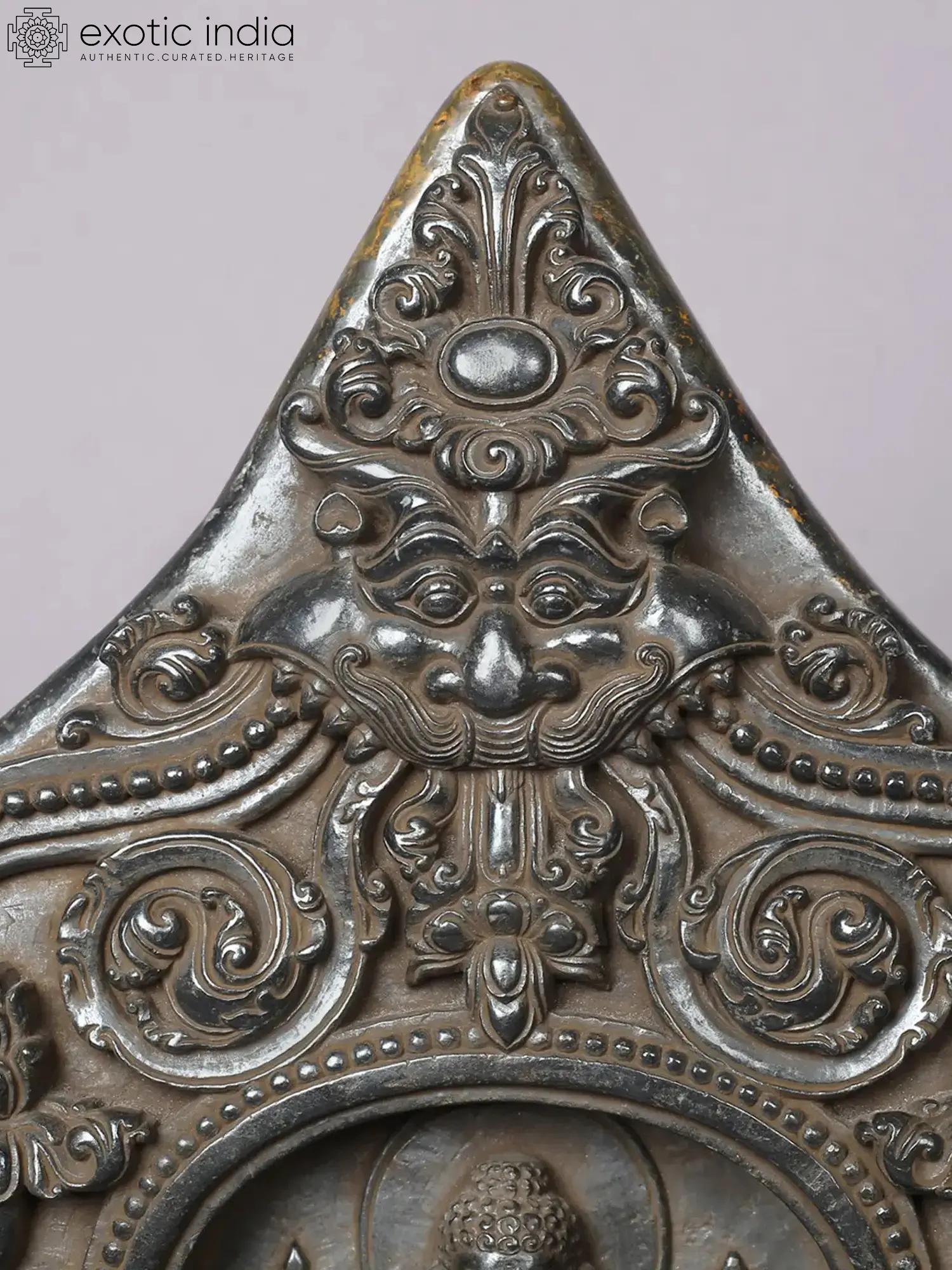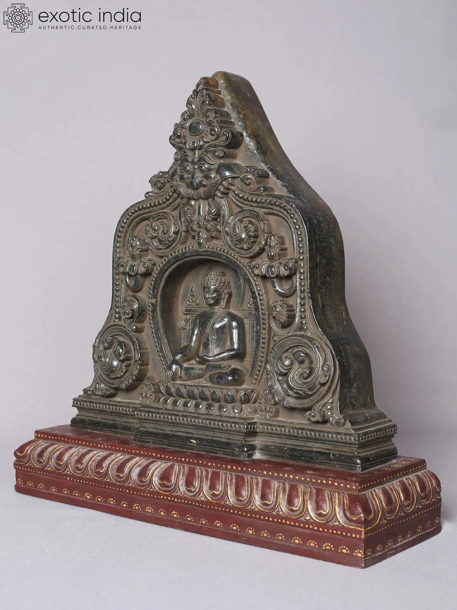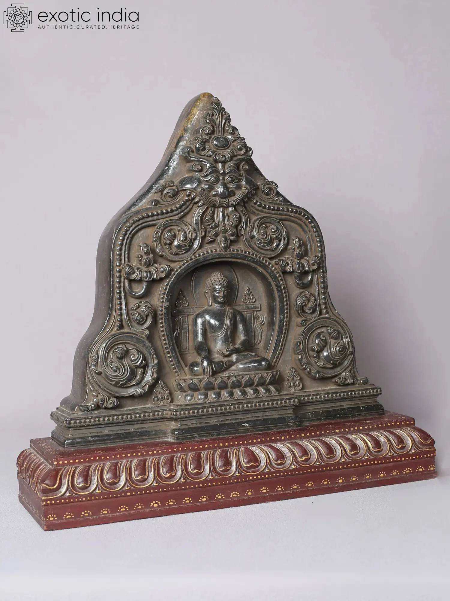 The perfection of a Buddha shrine for home, this superfine Nepalese Shakyamuni Buddha statue is made from a striking black stone slab, reminding us of the earliest sculptural depictions of the Enlightened One. Buddha sits in the center of the composition, on a lotus seat. His glorious form is encircled by a majestic aura, with the Kirtimukha or face of glory on the top, with a fragrant floral pattern unfurling from its mouth. Curving creepers are also inscribed on the aureole, in this dual-tone stone masterpiece.