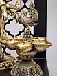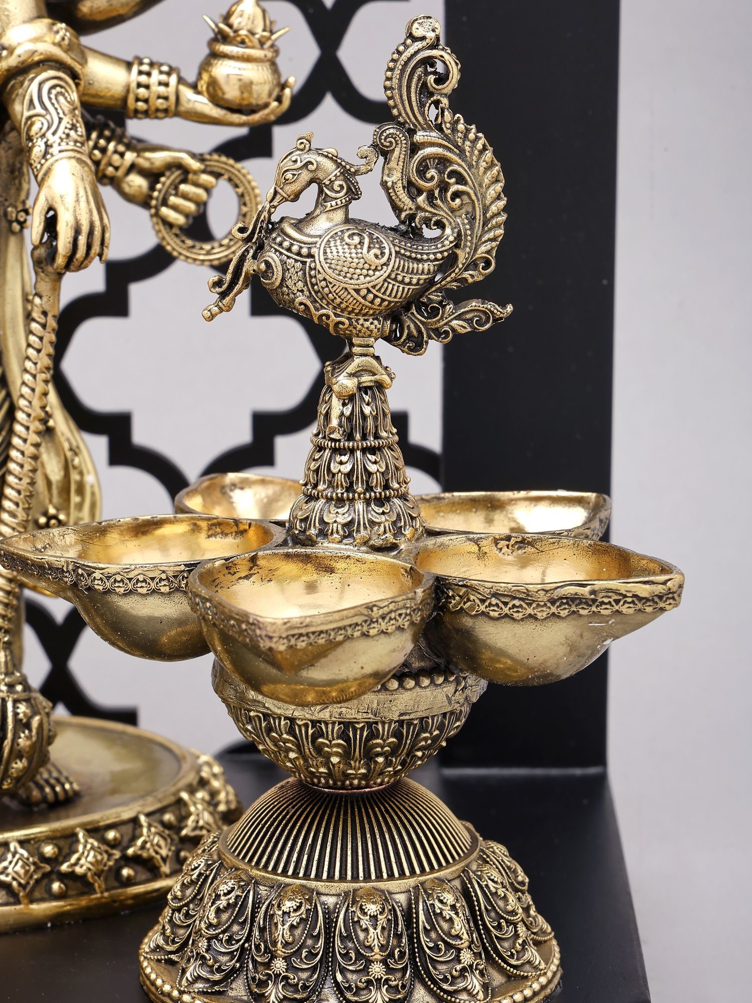 The statue is adorned with ornate peacock-shaped lamps, symbolizing auspiciousness and beauty.