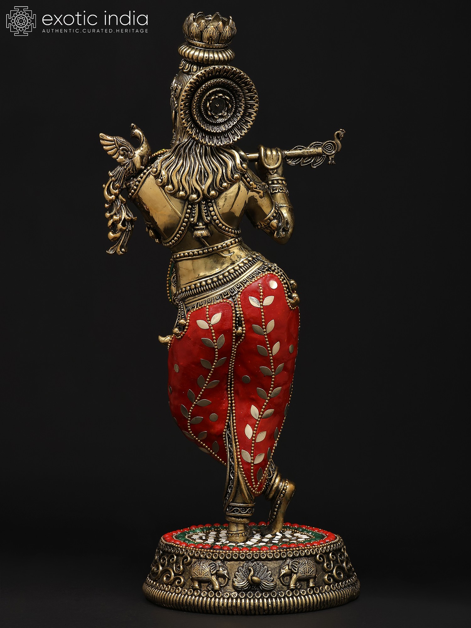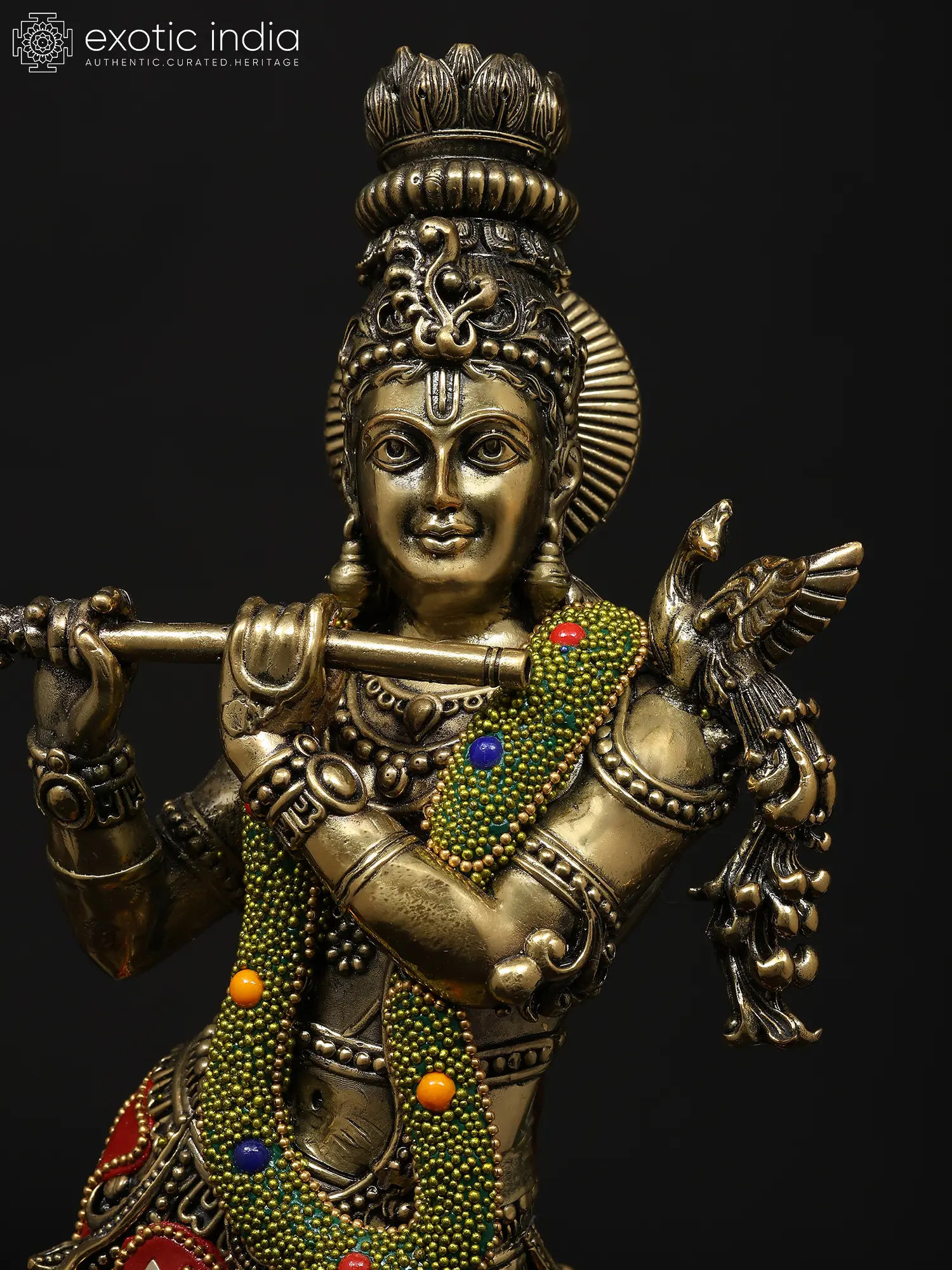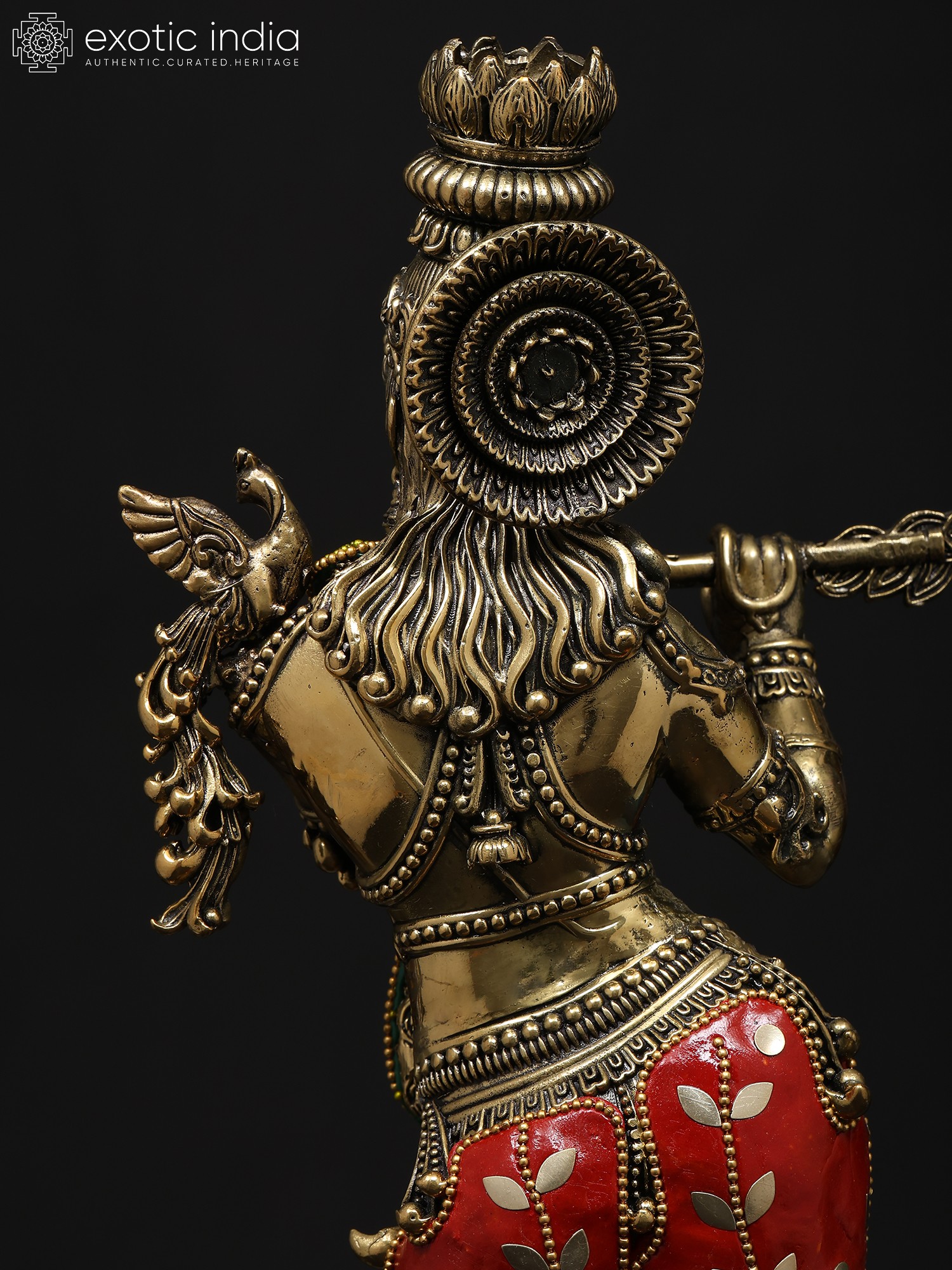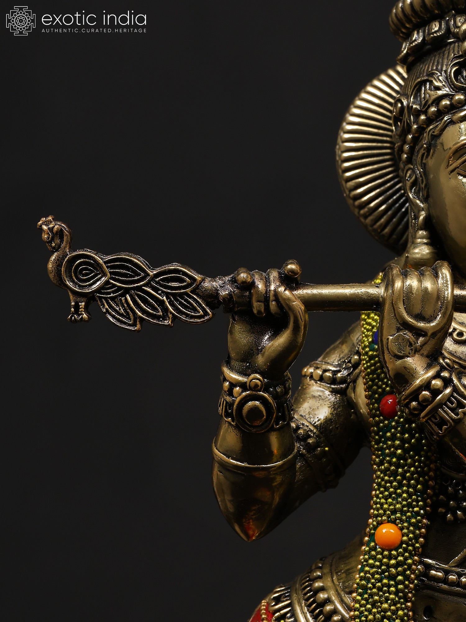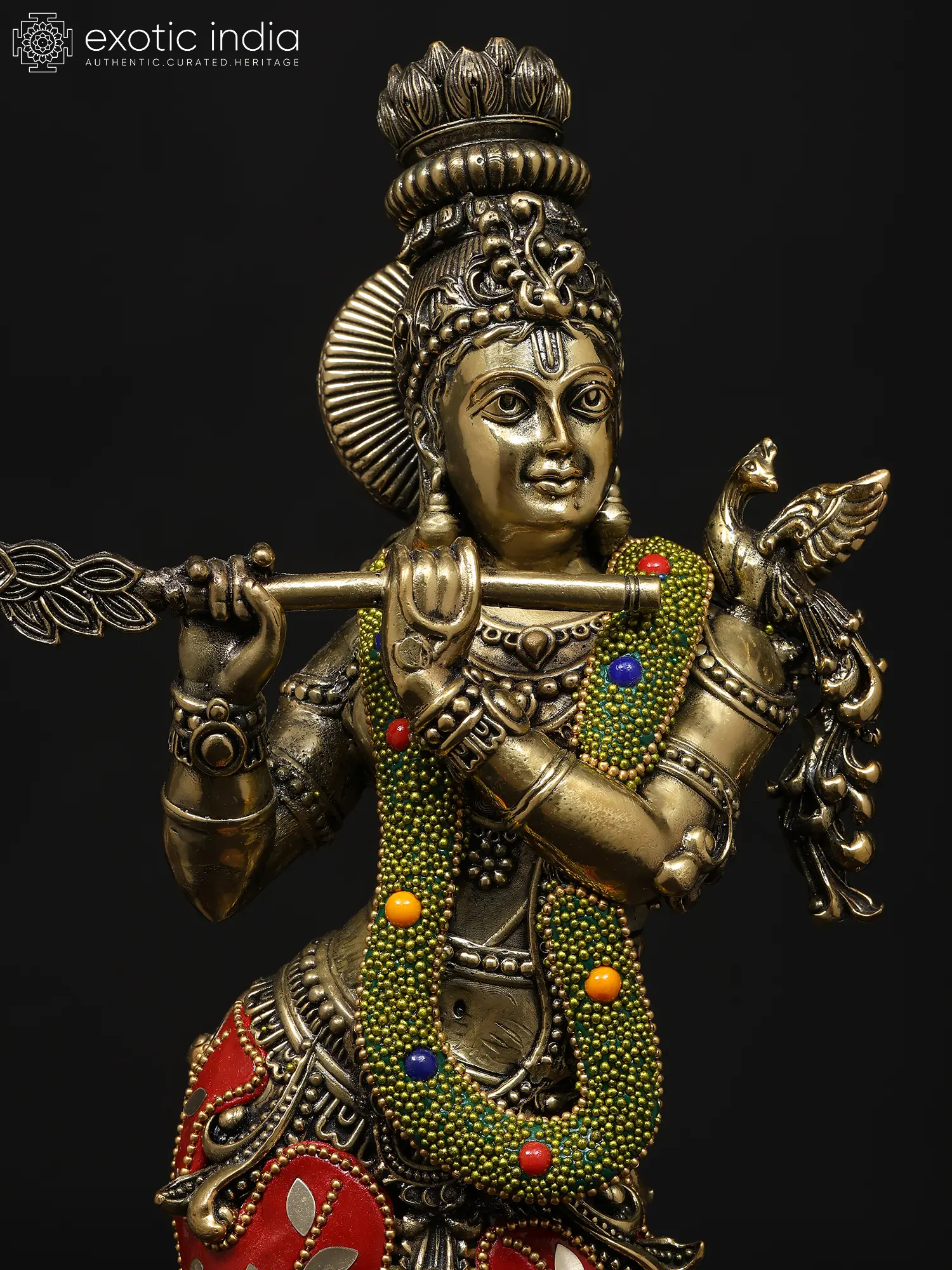 17" Brass Lord Krishna Playing Flute on Lotus Pedestal