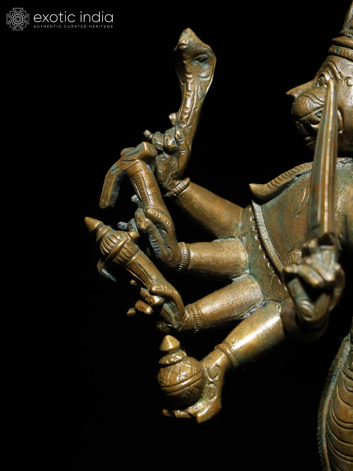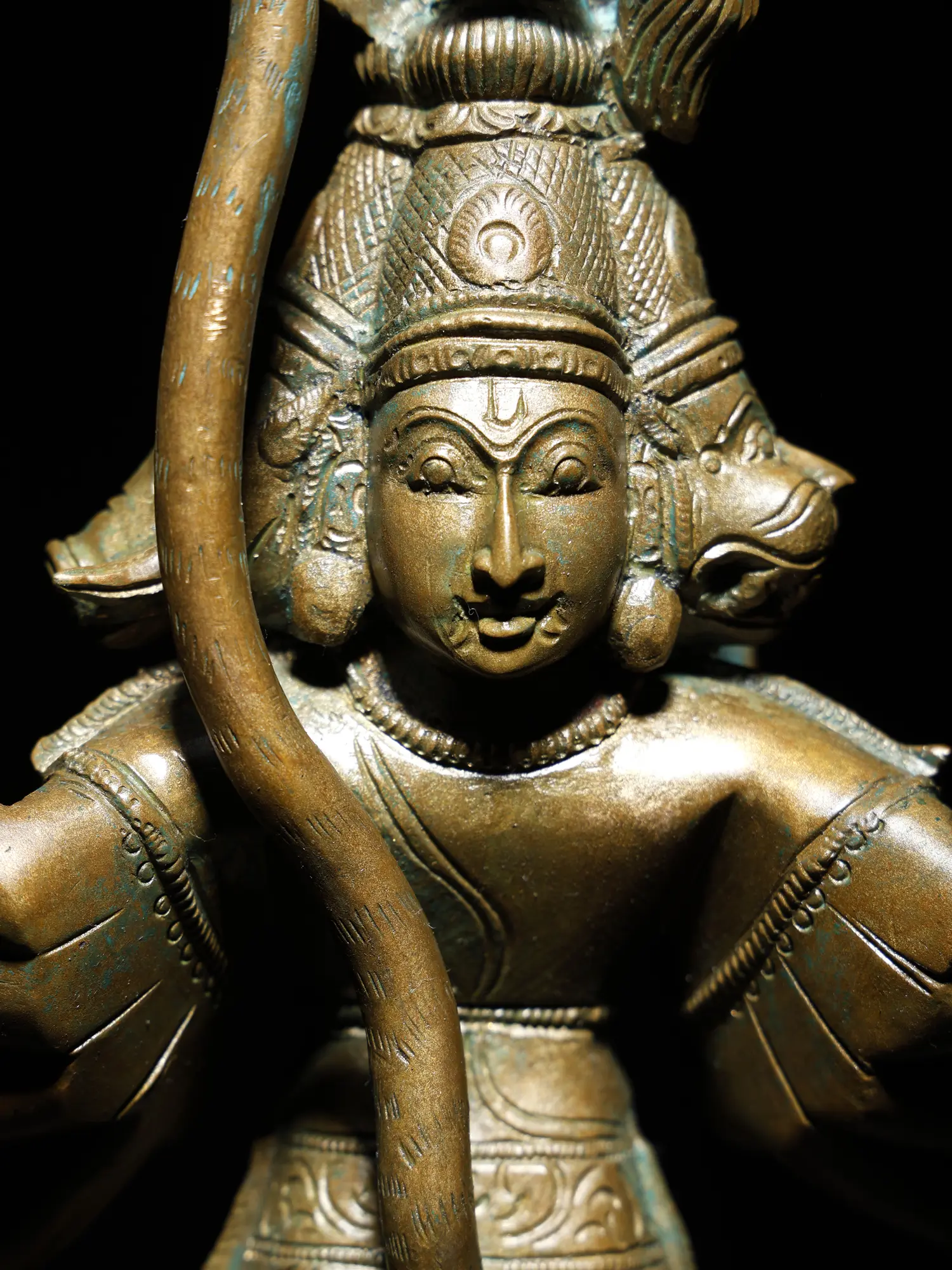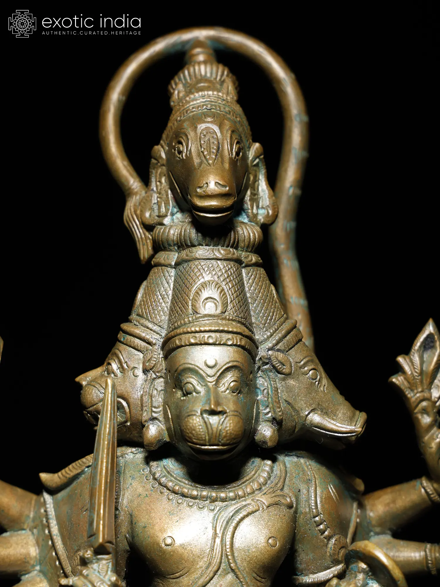 A potent aspect of Hanuman popular in Vaishnava temples of South India, Panchamukhi Anjaneya appears with the heads of Jambavanta (a bear), Varaha (boar), Hayagriva (horse), and Garuda (on the reverse) as Dashabhuja or ten-arm divine, an aspect associated with supreme forms of Hindu gods and goddesses.