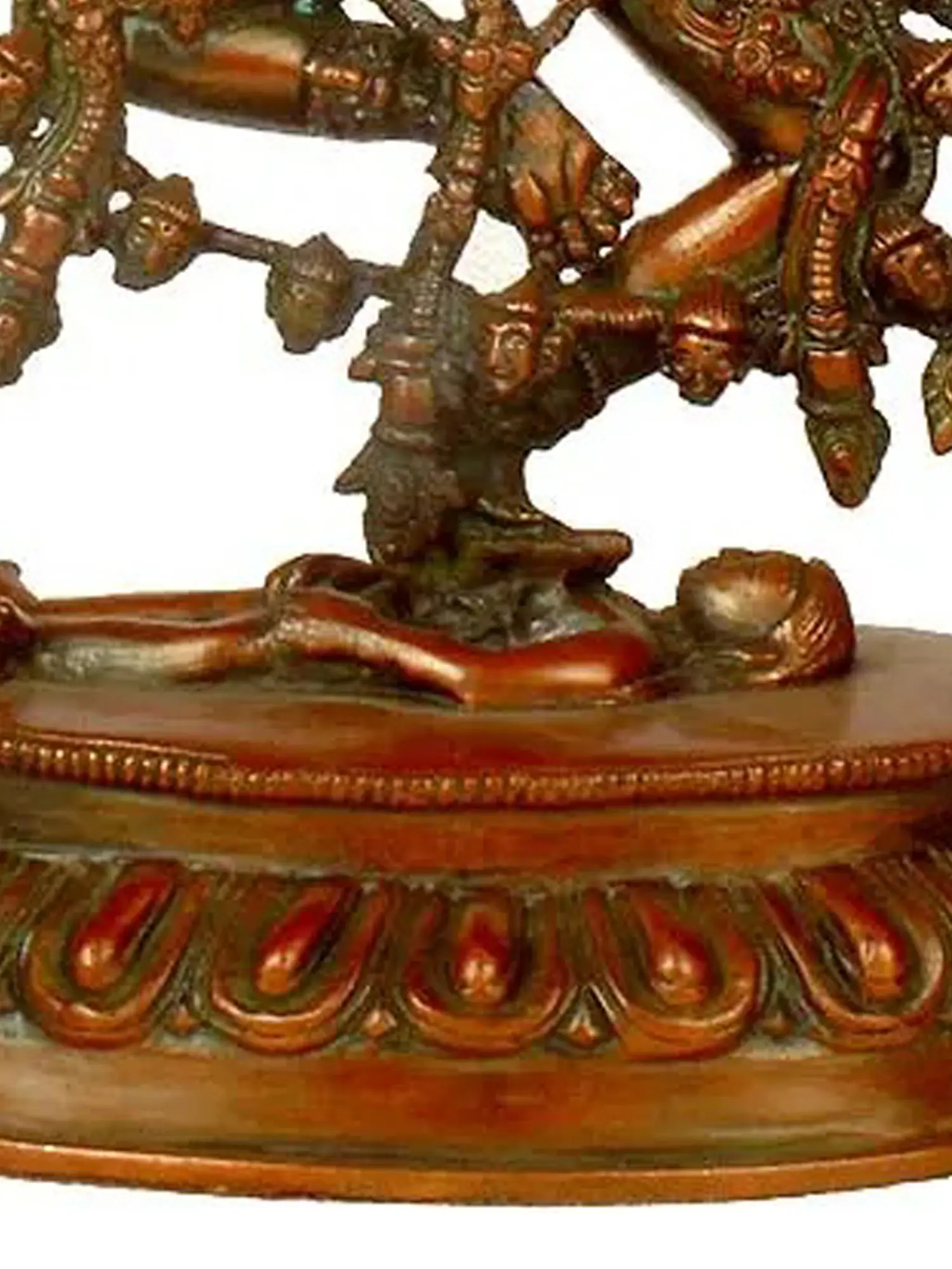 Dakinis are often depicted as sky-dancing beings, messengers of the enlightened mind, and protectors of the dharma. They are also seen as embodiments of wisdom and intuition, guiding practitioners on their spiritual path. In some traditions, they are associated with tantric practices, where they assist in the dissolution of ego and the realization of ultimate truth. The posture of the Dakini in this sculpture, with one leg raised and the other pressed down, signifies the triumph over obstacles and the transcendence of worldly limitations. The figure's energetic stance is a visual metaphor for overcoming ignorance and achieving liberation. The small figures adorning her, perhaps representing conquered demons or liberated beings, further emphasize her power and dominion over the dualities of existence.