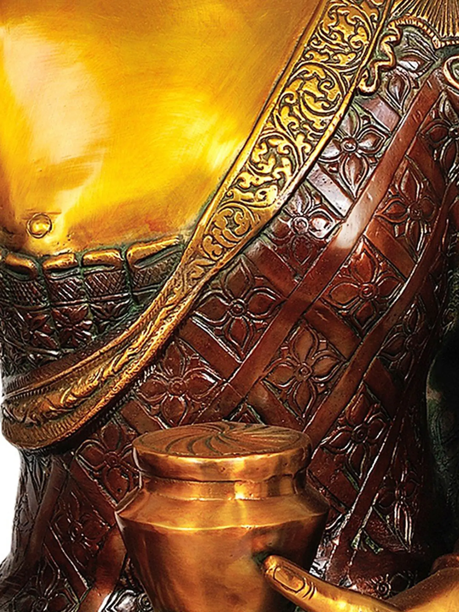 Behold the serene presence of Bhaishajyaguru, the Medicine Buddha, meticulously crafted in brass. In Tibetan Buddhism, Bhaishajyaguru is revered as the embodiment of healing and the dispeller of illness. This statue captures the essence of compassion and offers a visual focal point for meditation and contemplation. Every curve and detail speaks to the devotion and skill of the artisans who have poured their hearts into its creation. The Medicine Buddha is traditionally depicted with a lapis lazuli-colored body, symbolizing purity and healing. While this statue is rendered in brass, the shimmering gold tones evoke the radiance of the healing energy that emanates from Bhaishajyaguru. He sits in the lotus position, a posture of perfect balance and tranquility, his face bearing an expression of profound peace and understanding. This representation invites a sense of calm and serves as a reminder of the potential for inner healing and well-being within each of us.