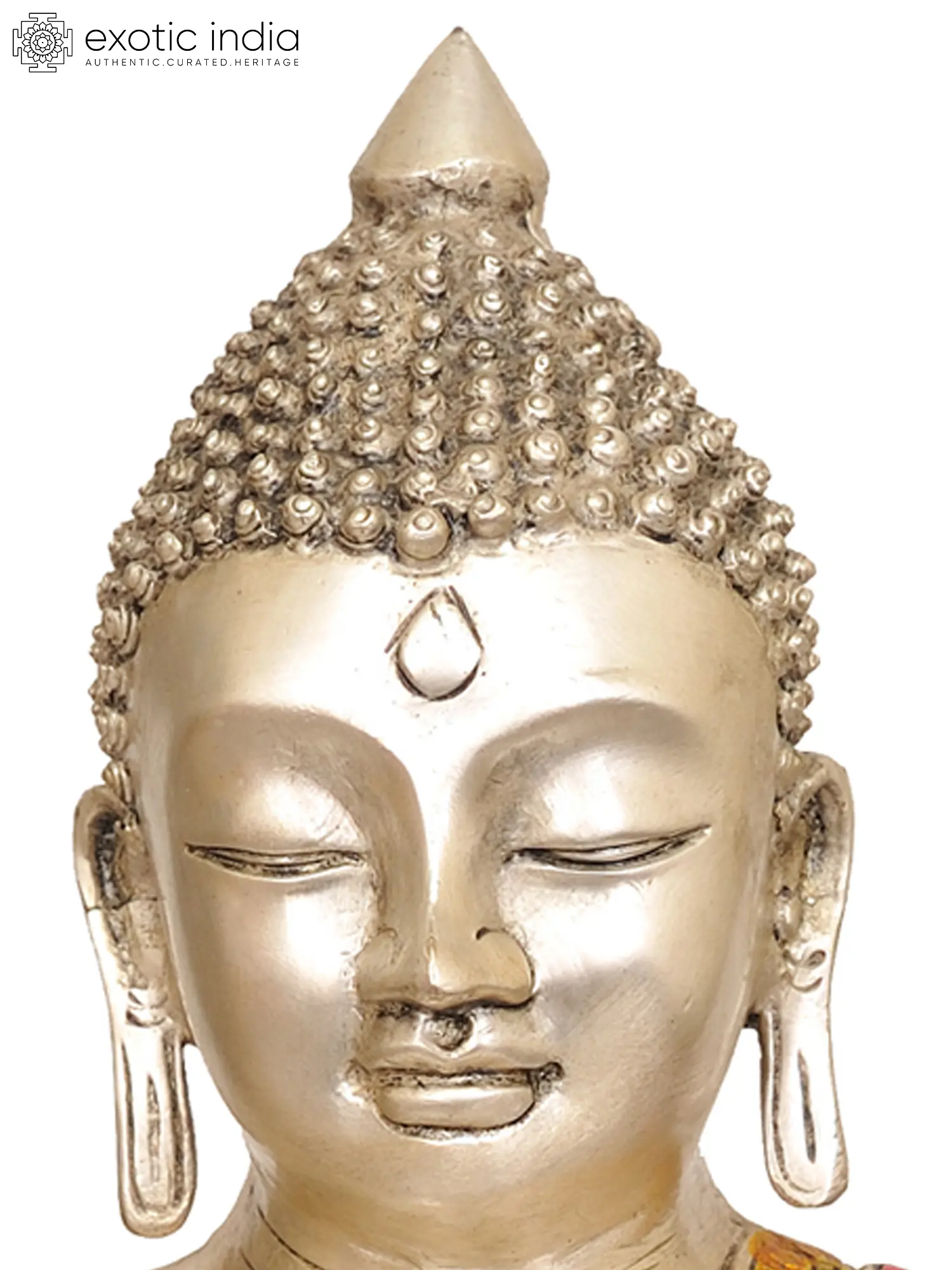 This exquisite brass statue depicts the Medicine Buddha, also known as Bhaisajyaguru, a celestial Buddha embodying the healing aspect of enlightenment. In Buddhist traditions, the Medicine Buddha is revered as a supreme physician who can cure not only physical ailments but also the suffering caused by ignorance, attachment, and aversion. He is the lord of the Eastern pure land of Vaiduryaprabha, or Lapis Lazuli Light, a realm of perfect healing and bliss. The rich blue hues adorning the robe of this representation are evocative of this sacred pure land, immersing the viewer in an aura of tranquility and therapeutic energy.