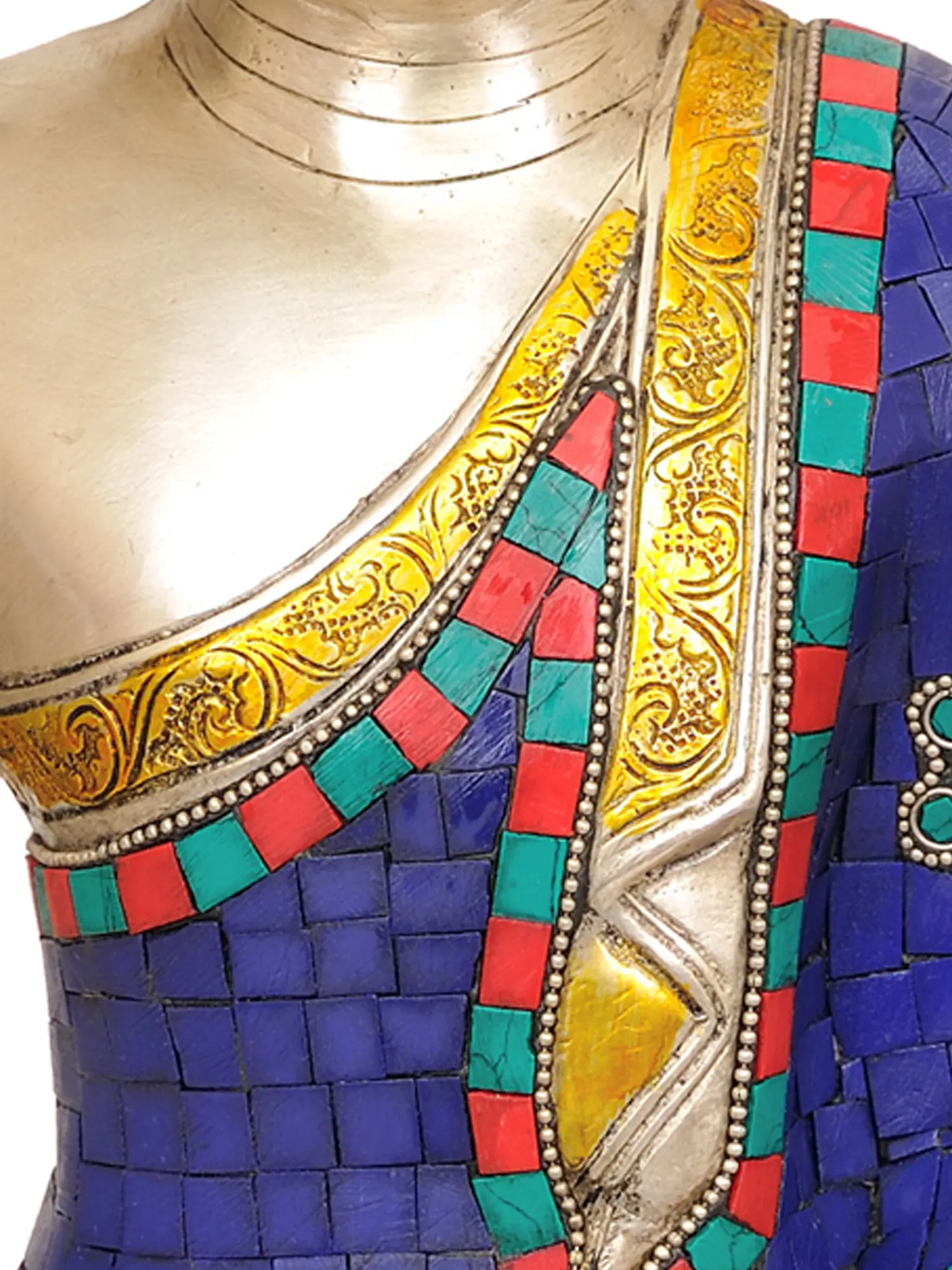 Handcrafted with meticulous attention to detail in India, this 14-inch tall statue is a testament to traditional artistry. The brass body is brought to life with intricate inlay work, featuring vibrant lapis lazuli, carnelian, and other semi-precious stones. These stones are not merely decorative; they carry their own symbolic significance. Lapis lazuli, with its deep celestial blue, is associated with wisdom, truth, and spiritual insight, while carnelian's warm red tones represent vitality, courage, and the life force. The delicate floral motif blooming from the left shoulder is particularly significant. This flower is often identified as the medicinal herb *Artemisia annua*, or sweet wormwood, a plant known for its potent healing properties, symbolizing the Medicine Buddha's boundless capacity to alleviate suffering.