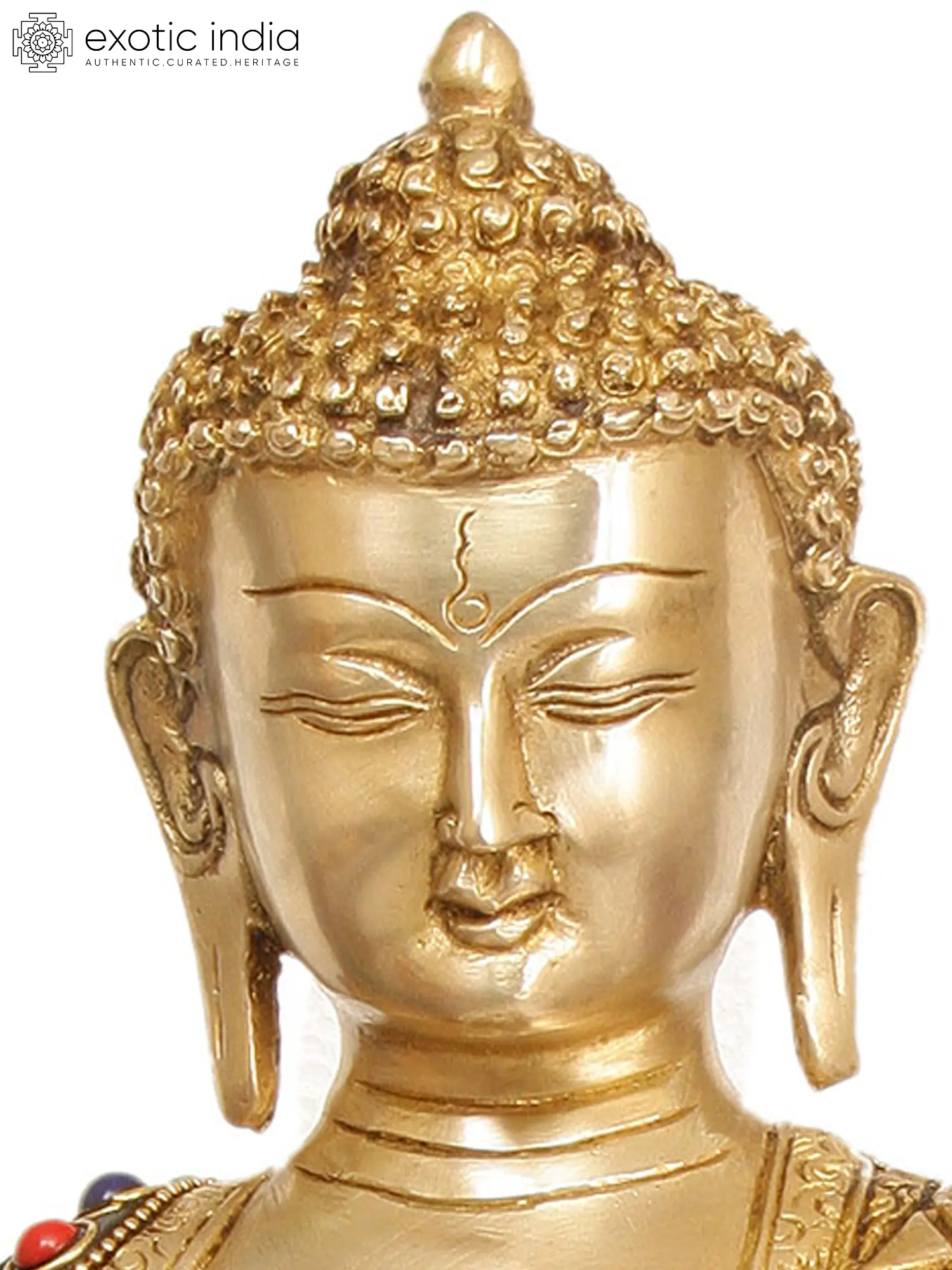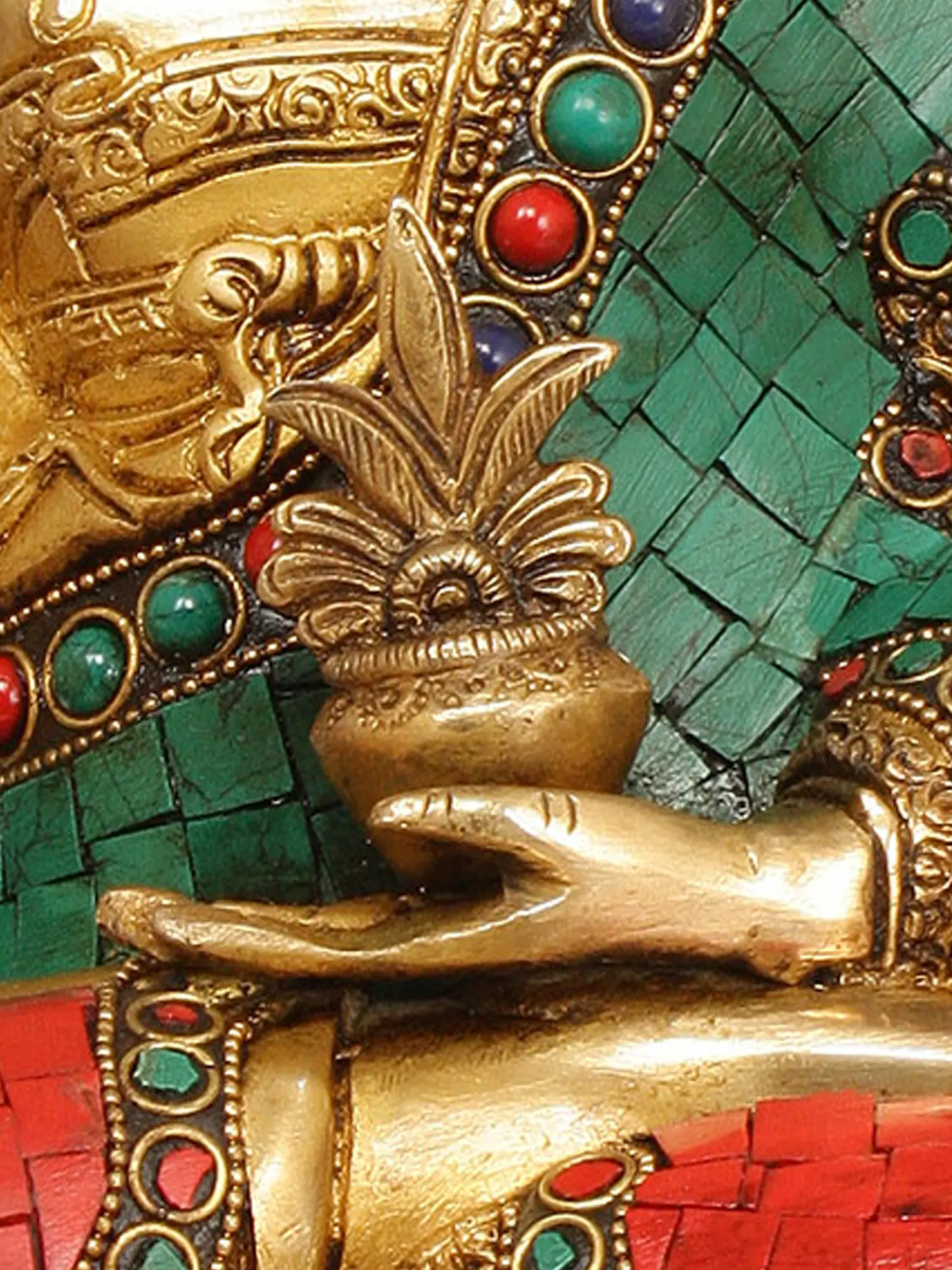 This exquisite brass statue depicts the Medicine Buddha, also known as Bhaisajyaguru, a revered figure in Tibetan Buddhism who presides over the Lapis Lazuli world and is revered as the physician of humanity. In Buddhist lore, he is a manifestation of the Buddha's healing energy, capable of alleviating physical, mental, and spiritual suffering. Legend tells that the Medicine Buddha made twelve vows to help all sentient beings overcome illness and achieve enlightenment. This magnificent representation captures his serene countenance, a symbol of profound peace and wisdom. The statue showcases the Medicine Buddha in a seated posture, symbolizing his grounded presence and unwavering resolve. His right hand is extended downwards, palm open, in the gesture of compassion (varada mudra), offering solace and blessings to all who behold him. In his left hand, resting in his lap, he holds a bowl filled with medicinal herbs, representing his ability to dispense the elixir of life and cure all ailments. The intricate detailing of his robes, adorned with vibrant red and green inlays of semi-precious stones, adds a regal and opulent dimension to the deity's form. These rich colors are often associated with vitality, healing, and auspiciousness in various cultural traditions. The carefully crafted base, also embellished with these colorful stones and intricate patterns, elevates the deity, signifying his elevated status and the sacredness of his presence.