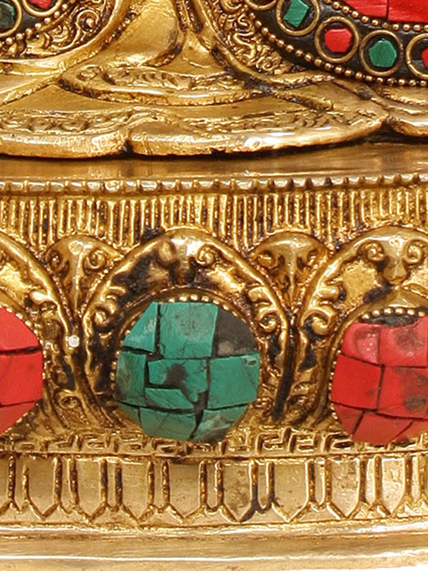 Handmade in India by skilled artisans, this statue is a testament to centuries of traditional metalworking and artistic heritage. The use of brass, a material known for its durability and lustrous appeal, ensures that this piece will endure for generations, becoming a cherished heirloom. The inlay work, meticulously applied by hand, speaks to the dedication and skill involved in its creation, transforming raw brass into a divine and visually captivating work of art. Each stone is carefully selected and placed to create a harmonious and visually stunning effect, reflecting the sacred symbolism of the Medicine Buddha. The rich patina and subtle variations inherent in handmade brass objects lend a unique character and soul to each individual piece, making yours truly one of a kind.