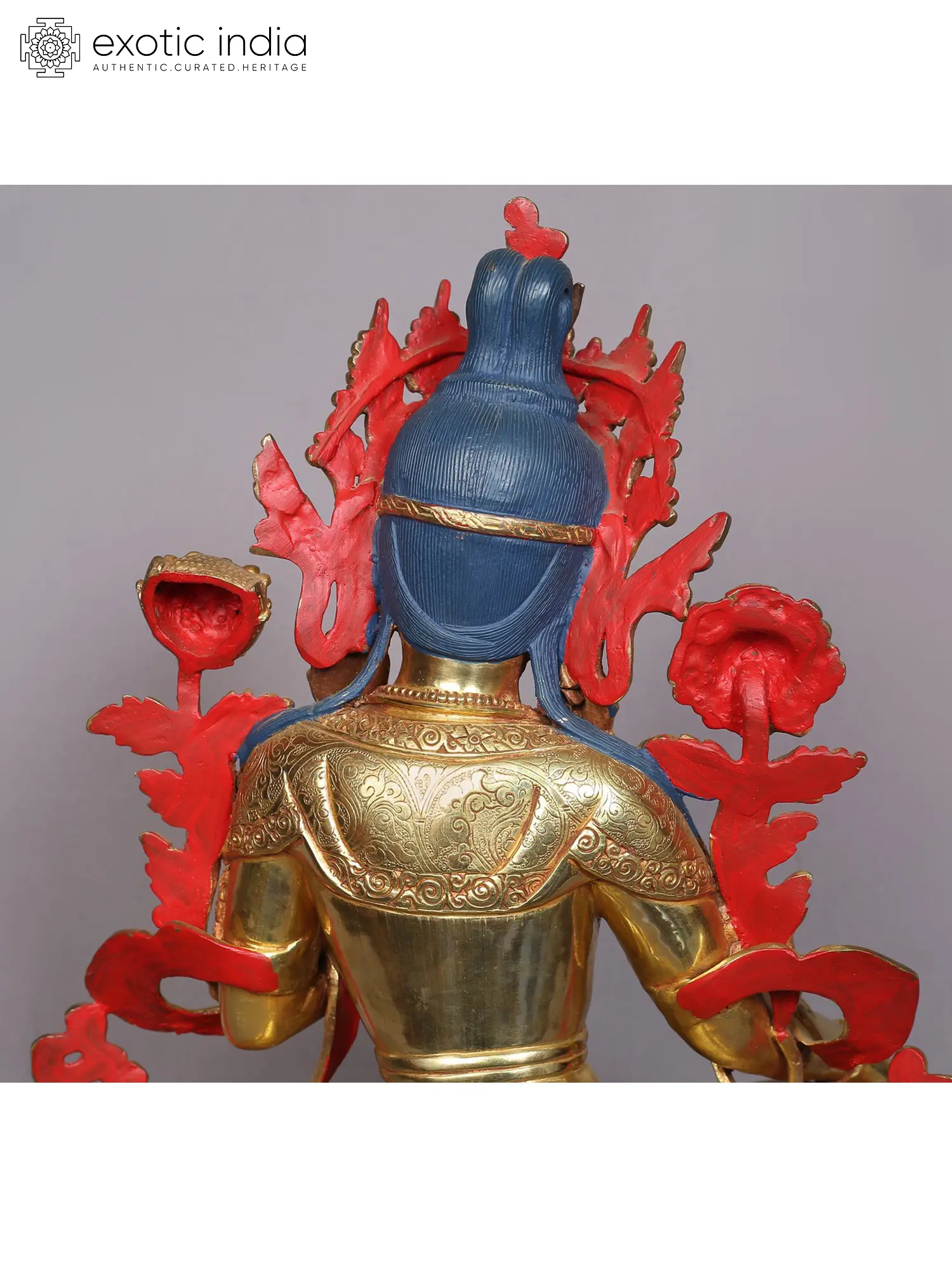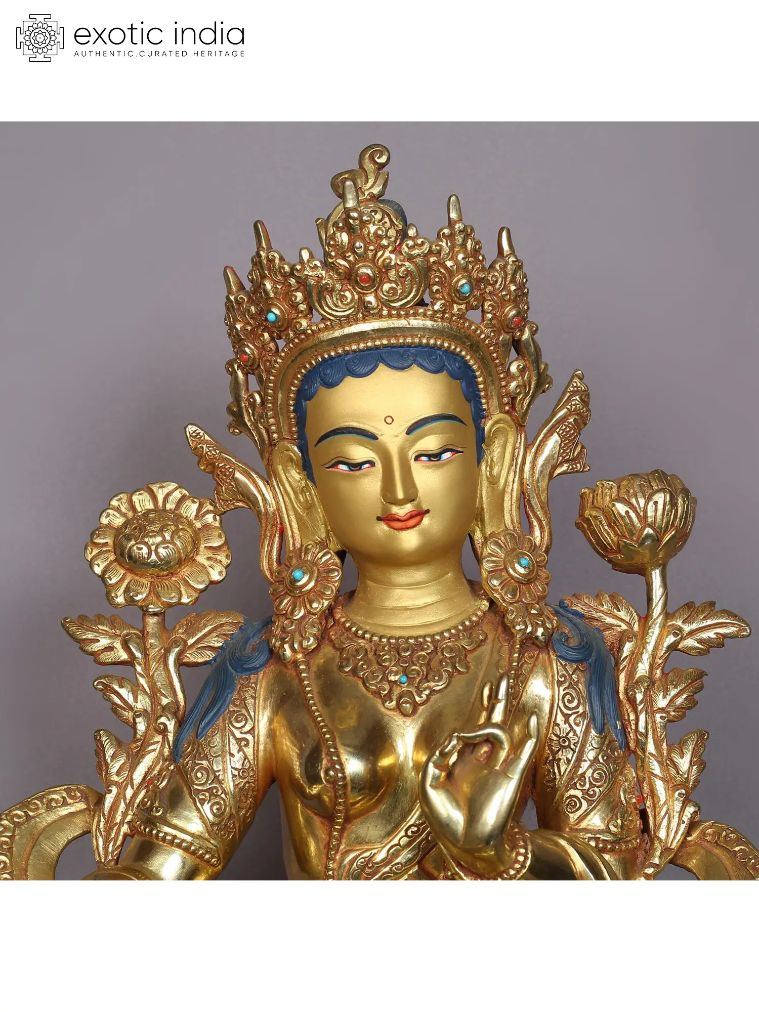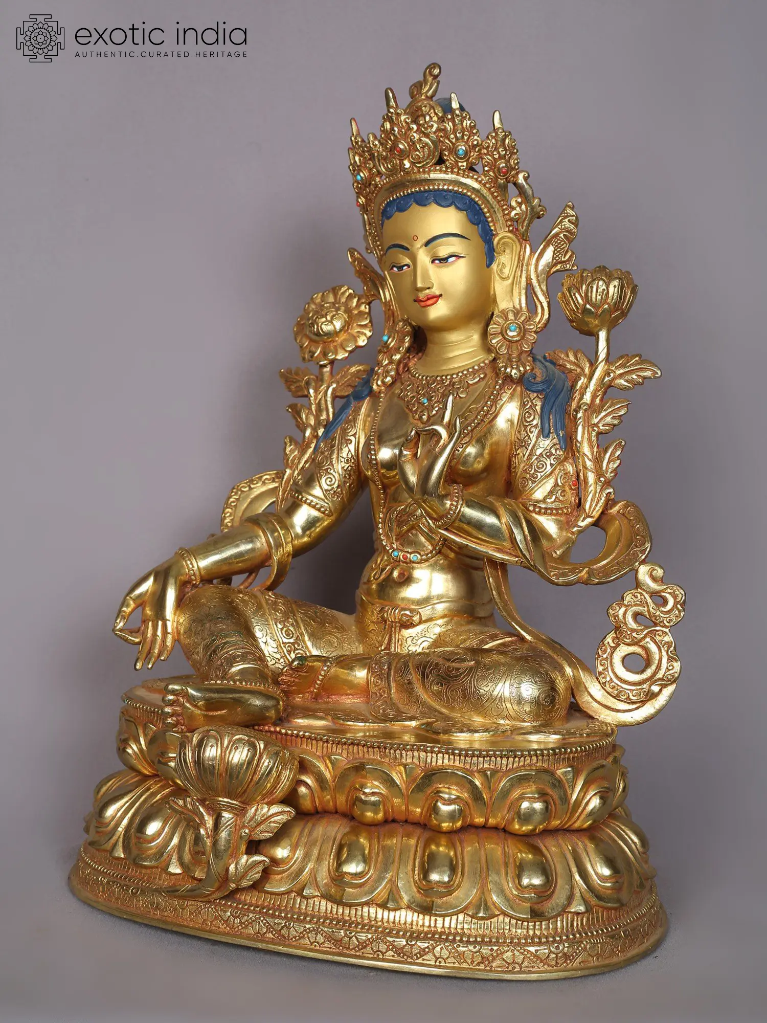 In Tibetan Buddhism, Green Tara is a beloved deity who is worshipped by reciting this mantra. It is a potent invocation that embodies her capacity for compassion and her quick response to alleviate suffering. With her right foot extended and poised to spring into action, Goddess Green Tara represents enlightened activity and protection. The deity's tranquil look and vivid green color are highlighted by the intricately crafted statue, which reflects her affinity with nature and the virtues of courage and compassion. For devotees, this holy image serves as a source of inspiration and a spiritual reminder.