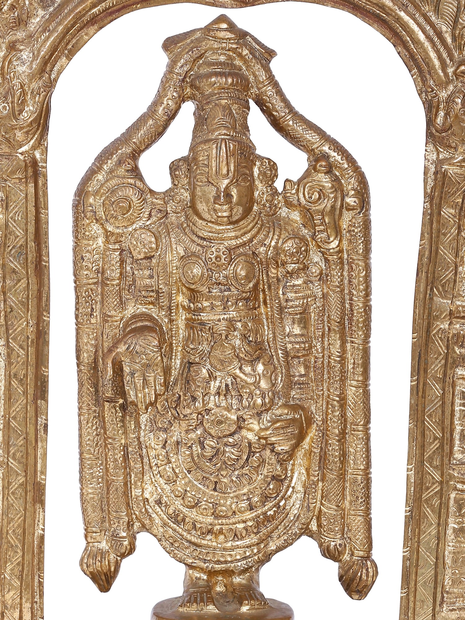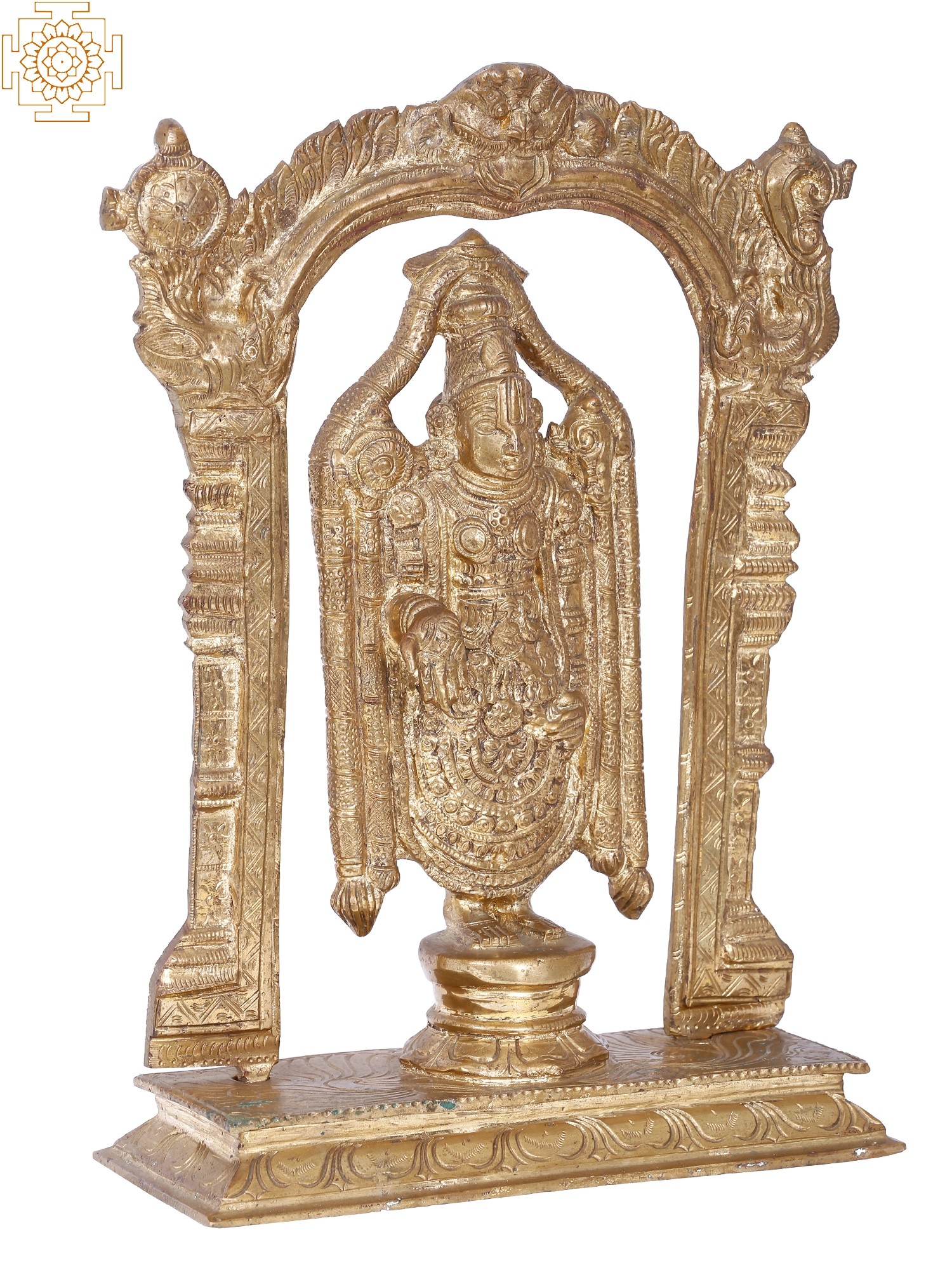 This exquisite statue captures the divine essence of Sri Venkateswara, also known as Balaji, one of the most revered deities in Hinduism. Lord Venkateswara, an avatar of Lord Vishnu, is the presiding deity of the Venkateswara Temple in Tirumala, Andhra Pradesh, a pilgrimage site that draws millions of devotees annually. Legend tells that Lord Venkateswara descended to Earth to help humanity in the Kali Yuga, a time of moral and spiritual decline. His form here, standing serenely within an ornate archway, embodies his benevolent grace and the immense spiritual power he bestows.