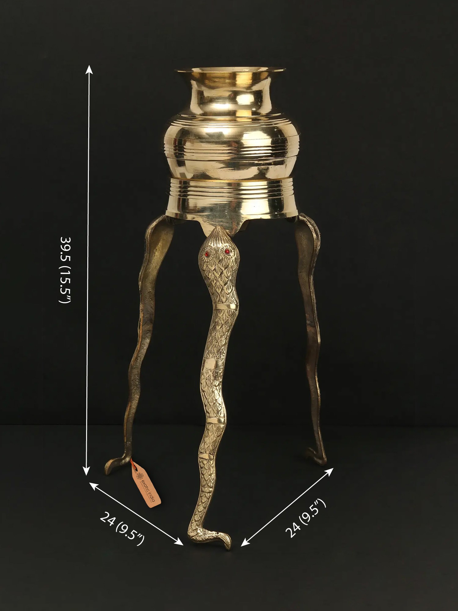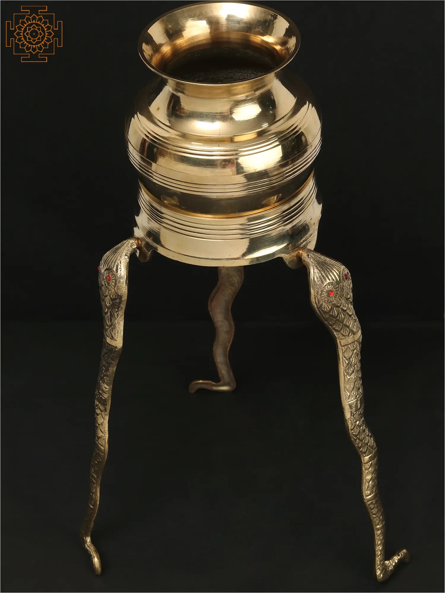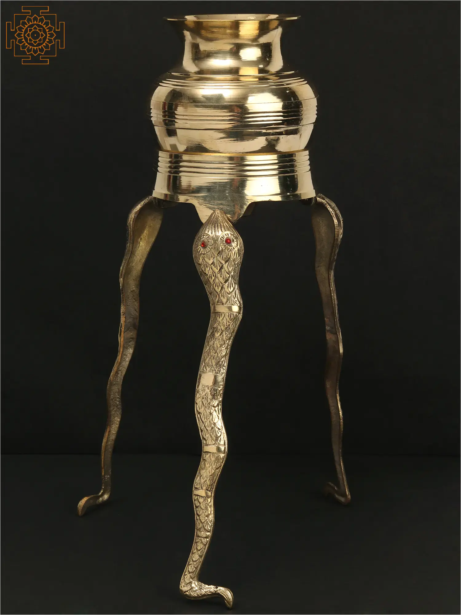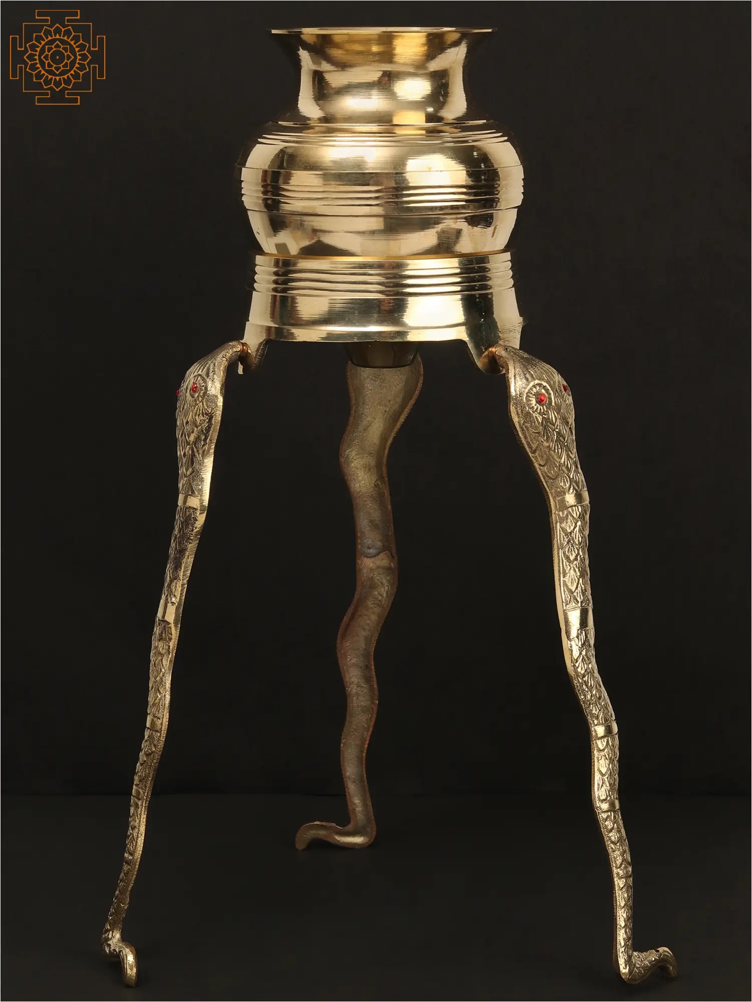 This exquisite brass abhishekam stand is a testament to the artistry and spiritual depth of Indian craftsmanship. Designed to elevate the sacred ritual of abhishek, or ceremonial bathing, of the Shivalinga, this piece brings an aura of reverence and tradition to any space. The stand features a beautifully crafted vessel atop three robust legs, each intricately shaped to resemble the powerful form of a Naga, a celestial serpent. The serpent is a potent symbol in Hinduism, often associated with Lord Shiva himself. Sheshnag, the king of serpents, is famously depicted as the couch upon which Lord Vishnu rests, and it is said that the world rests upon the hoods of Sheshnag. The intricate detailing of the scales and the striking red gem eyes of the Naga legs add a touch of divine splendor, evoking the protective and cosmic energies associated with these mythical beings.