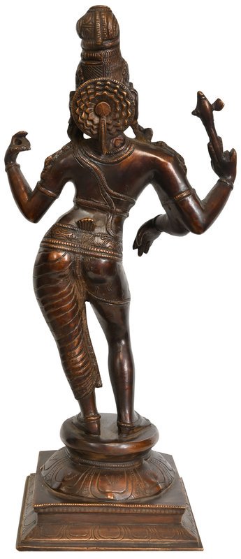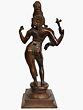 Shiva, as Ardhanarishvara, is in absolute union with Parvati; hence, love is the essence of his being and saumya placidity or lalita beauty, his roop appearance. This Ardhanarishvara image is exceptional in its saumya-roop. The entire figure is in a posture of dance. But for a goad, it does not carry any weapons. Snakes, which are an integral part of his iconography, are missing, and so his garland of skulls and other attributes that are ferocious. In absolute ease his lower right arm appears to be placed on his Nandi. In the statue, two forms united, not to reveal distinction but rather to dilute it completely.