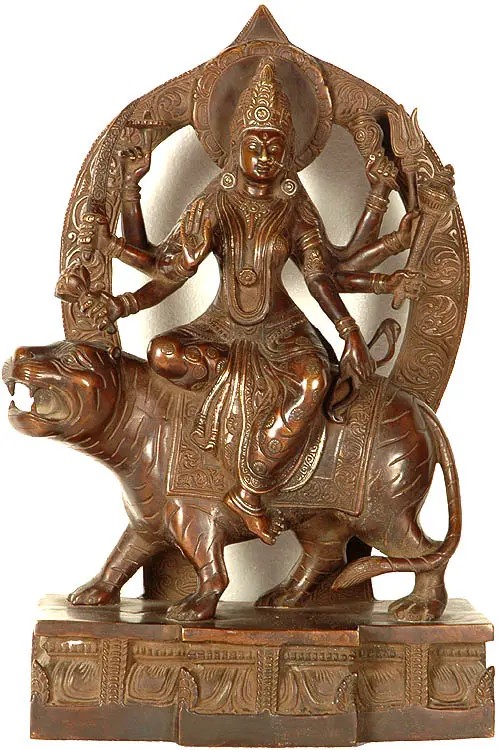 She mounts (vahini) the back of Her simha (lion). The silk of Her dhoti lies in lifelike folds over Her lalitasana legs. Her long, slender torso is bedecked with ample gold jewellery, fit for a queen as powerful as She is.