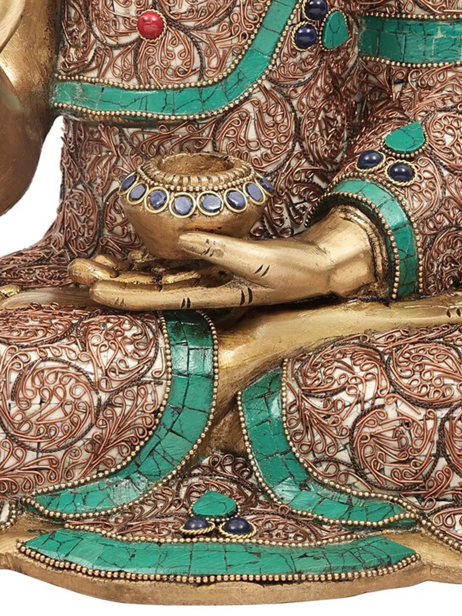 Exotic India presents a brass statue of Lord Buddha with fine inlay work on his robe studded with colorful gemstones.