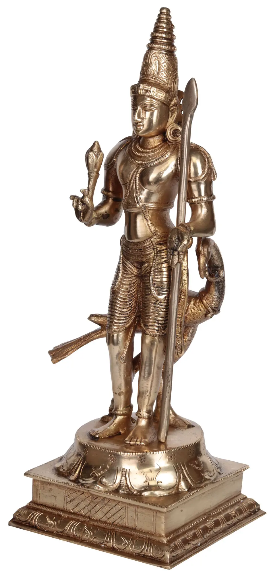 This brass idol of Karttikeya is a masterful artwork, meticulously crafted in durable and corrosion-resistant metal, celebrated for its intricate detailing and lustrous finish. Ideal for capturing the divine beauty of revered deities, it showcases Kartikeya as a warrior, clad in a dhoti, donned with warrior's armor, spear in hand, and a loyal rooster companion.
