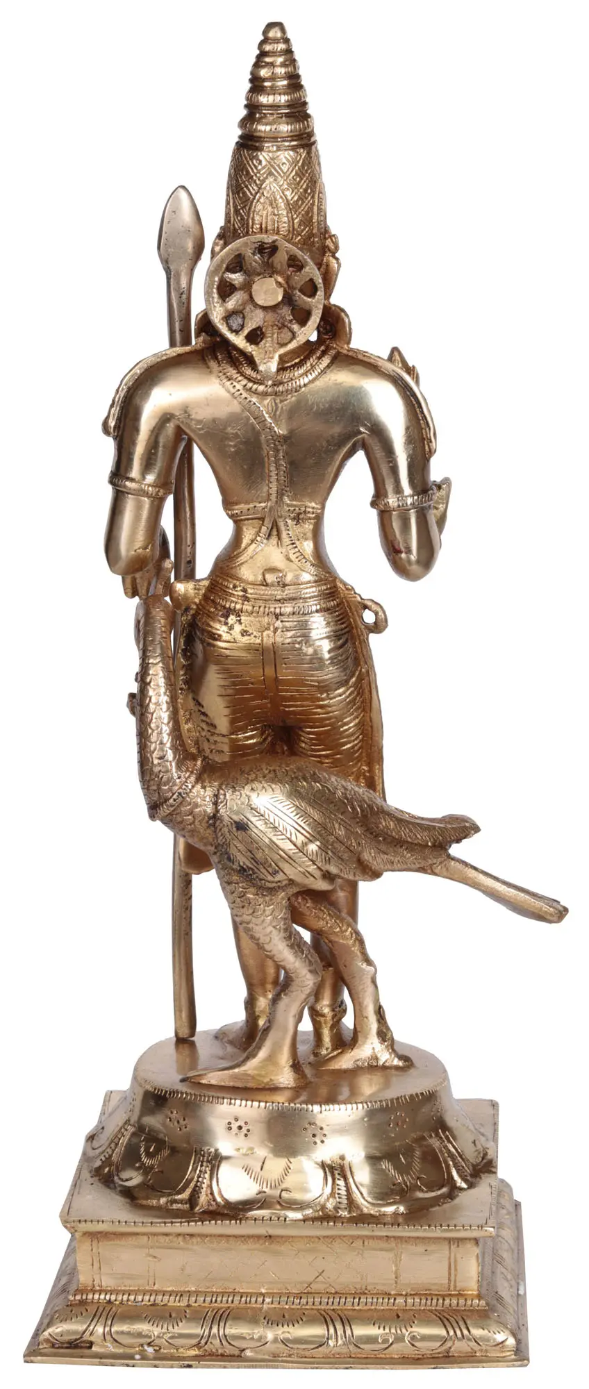 Kartikeya, depicted in his youthful divine form, exudes a warrior's aura, adorned with the emblematic Vel – a sacred spear symbolizing the Kundalini shakti. His weaponry may include a sword, javelin, mace, discus, or bow, yet often, he wields the shakti or spear. Standing by his side is his vahana, the Indian peafowl, called Paravani.
