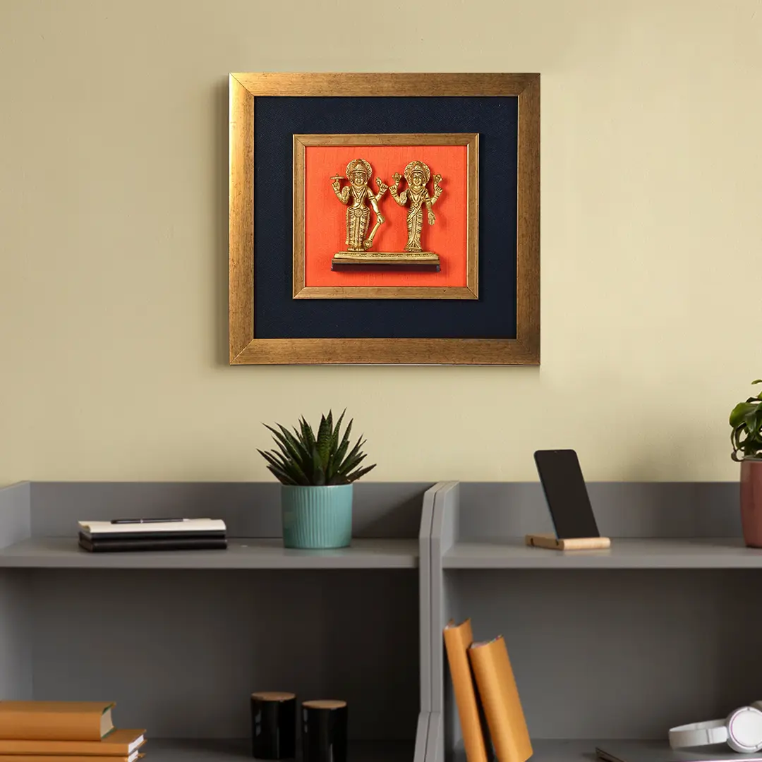 This Brass Lakshmi Narayana Idol in Wooden Framed exemplifies the allure of minimalistic elegance. The brass statue of Lakshmi Narayan, placed on a regal brown dotted fabric, radiates simplicity and grace. This masterpiece is elevated by a white plain cloth framed structure, highlighting a harmonious blend of brown, white, and wood tones.