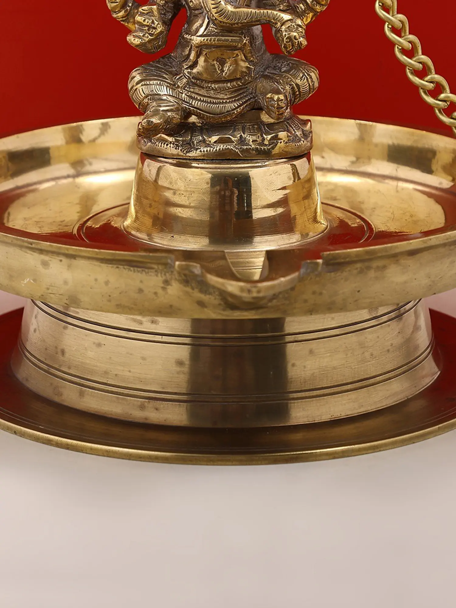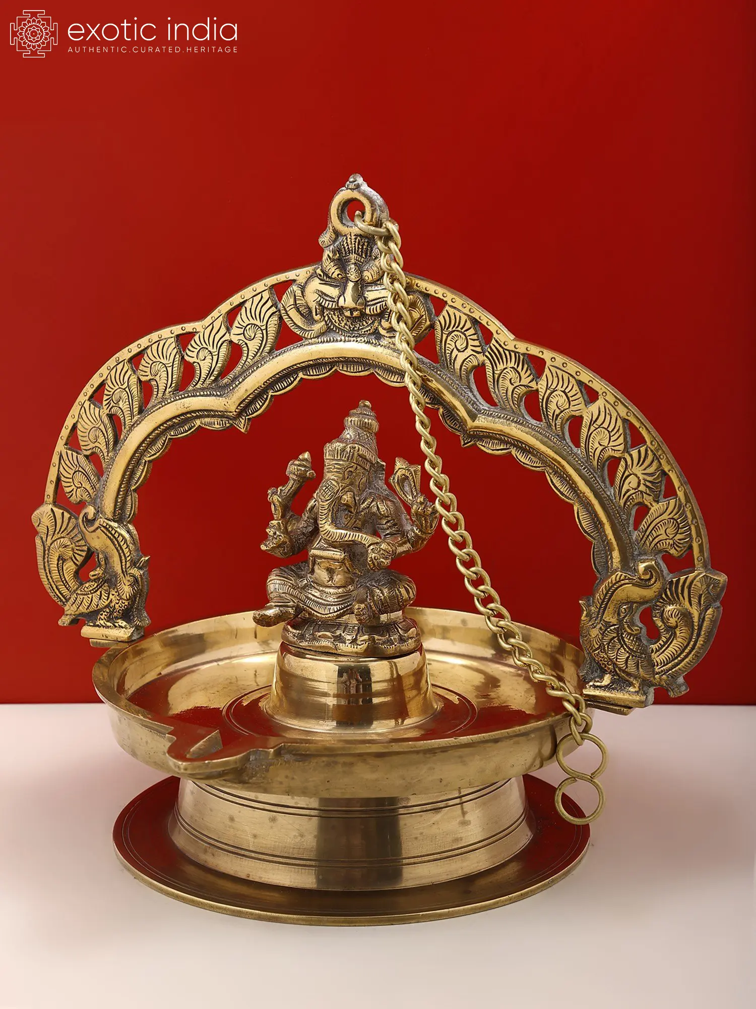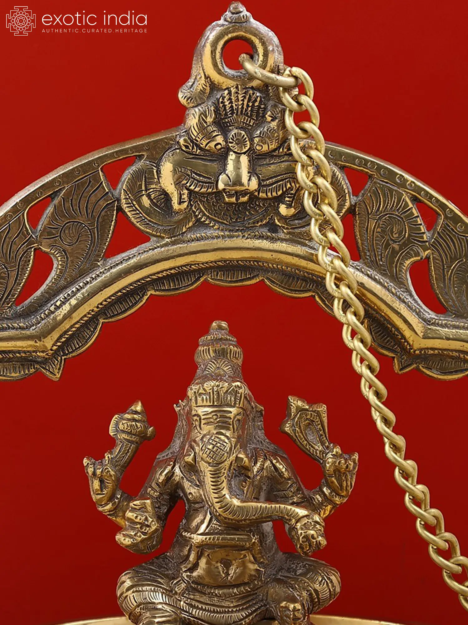 A hanging dia that conveys the blessings of Lord Ganesha. When one thinks of a traditional Indian lamp, the image of a long stem and multi-wick dia trays usually come to mind. The lamp that you see on this page, however, is designed to be hung from a hook in the ceiling.