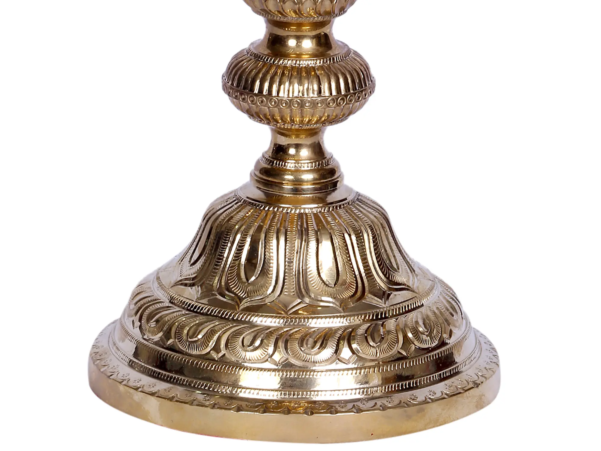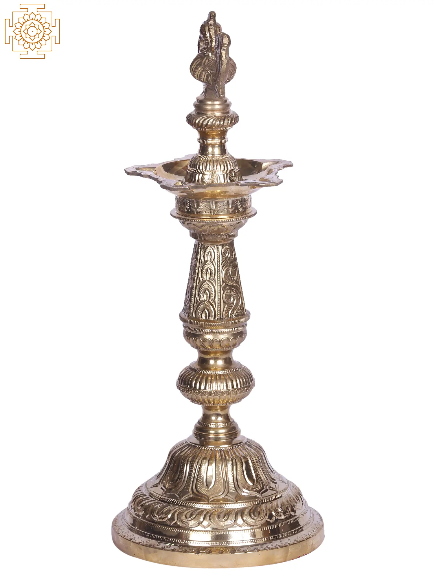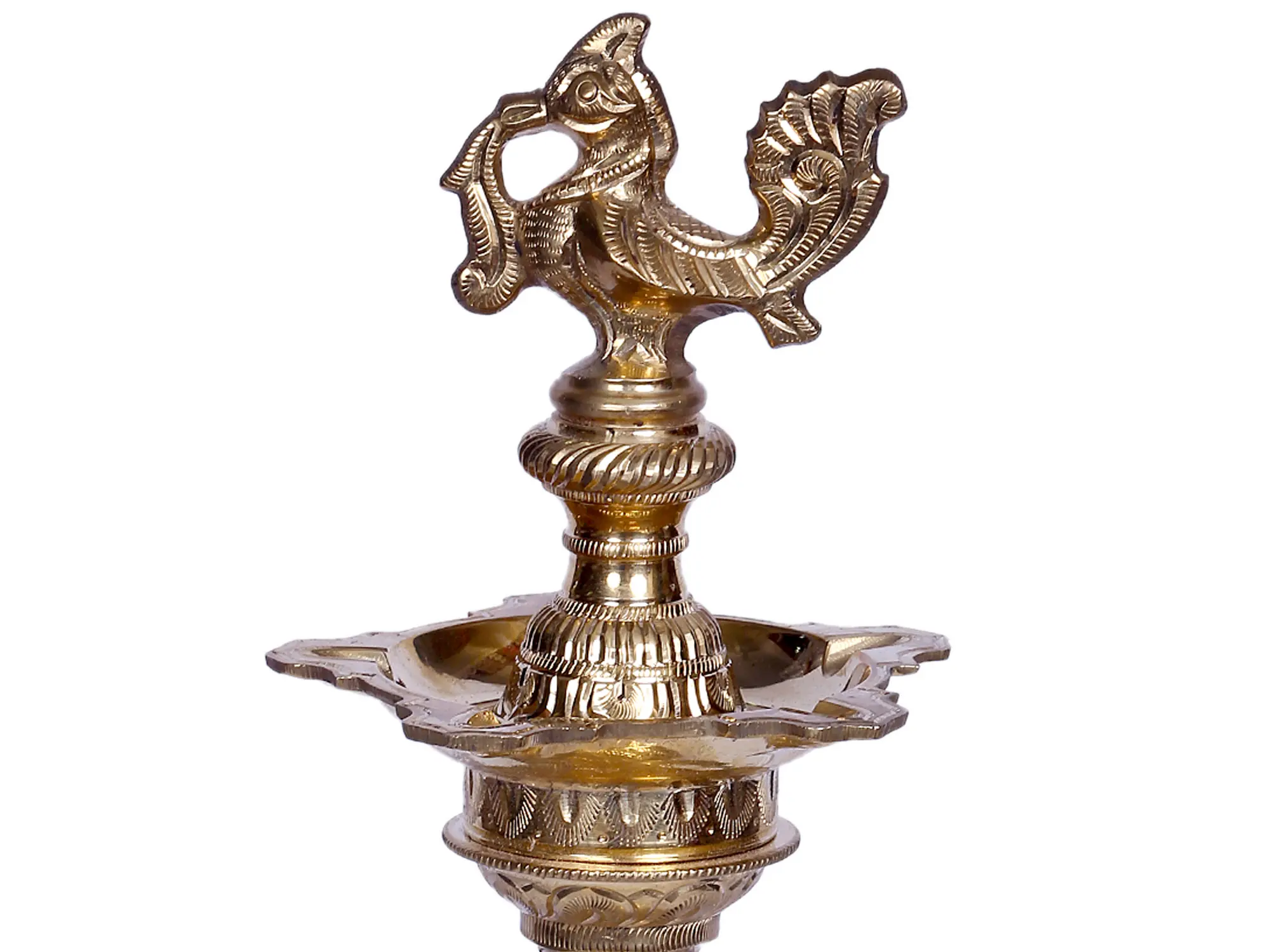 Nila Vilakku, also known as columnar lights, has a long history in Kerala. Deepastambham or Mandapa Vilakku are other names for these lamps. This brass designer oil lamp features a center pattern of a regal peacock clutching a blooming branch in her beak; this is a symbol of riches and royal rank and is frequently favored by powerful families. There are complicated geometric forms such as a square and a ball at equal intervals. This lamp with five wicks indicates wealth and the divine warmth of light dissipates negative energy. This lamp, in addition to being an excellent choice for holiday décor, is capable of attracting the blessings of the deities when lit with devotion.