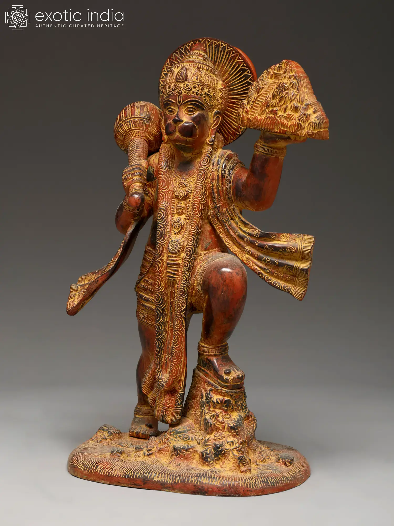 Enter the world of divine devotion and unwavering strength with this brass sculpture of Lord Hanuman carrying the sacred Sanjeevani Mountain. Handcrafted by skilled artisans in India, this idol captures the moment when Hanuman flew across the skies to retrieve the life-saving herb to save Lord Lakshmana. This depiction of Lord Hanuman's supreme devotion and selflessness is a symbol of courage and unwavering faith. As you place this sculpture in your home, you invite the blessings of Hanuman, fostering an atmosphere of bravery, protection, and faith in the face of adversity.