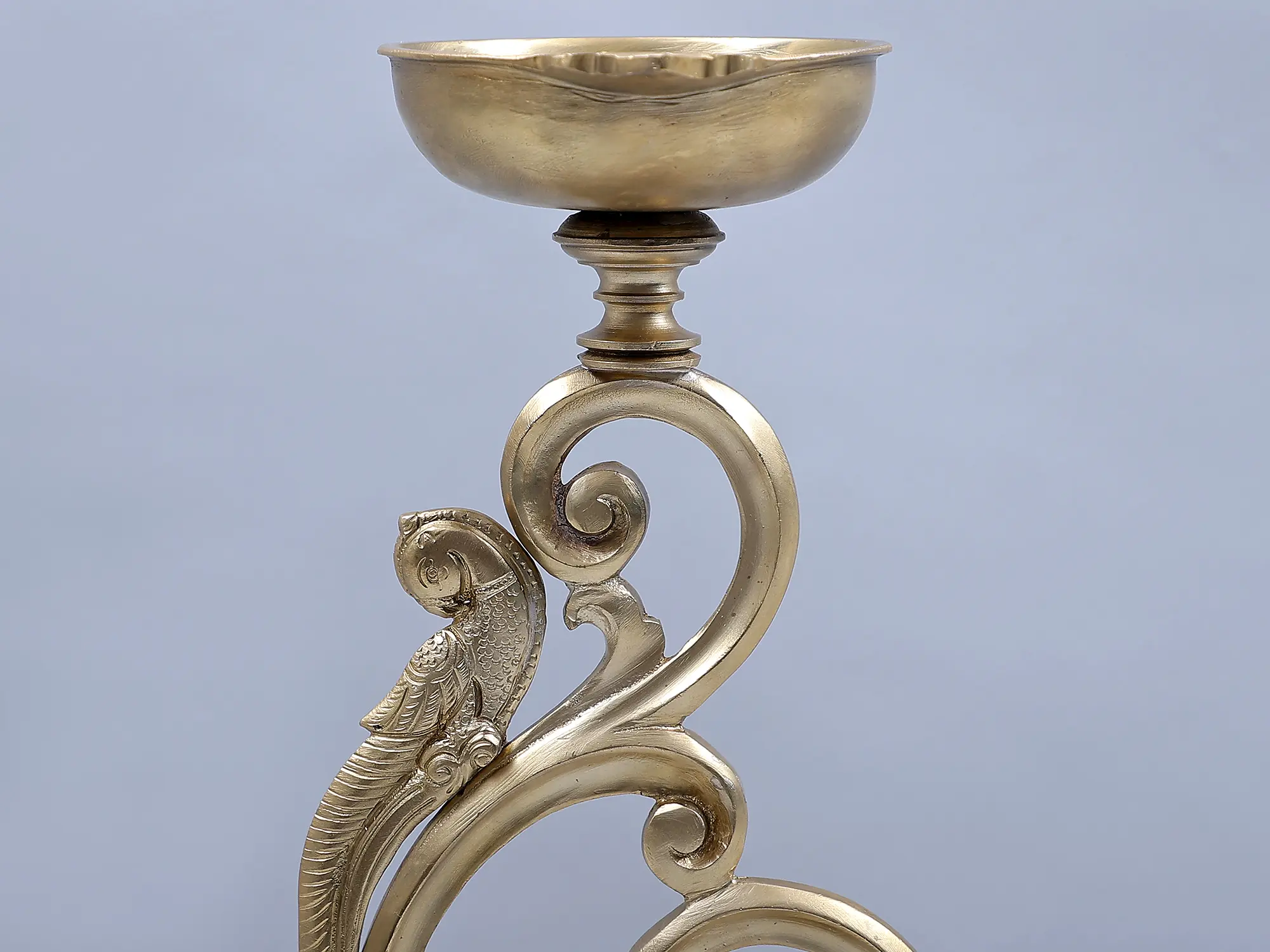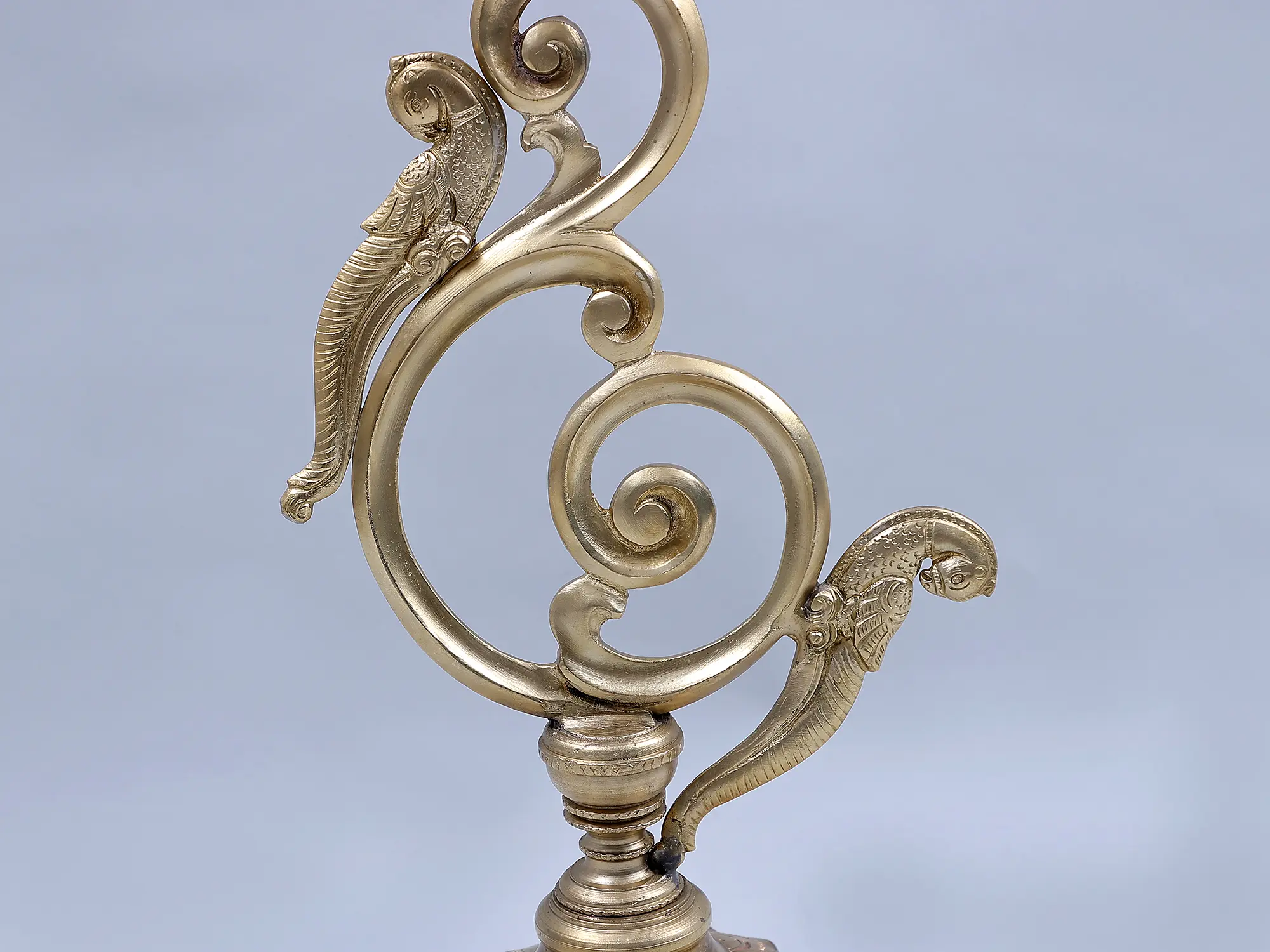I salute (namaskar) the light/lamp that provides auspiciousness; success, good health, abundance of money and riches, and the annihilation of the intellect's enemy. This superbly constructed bronze lamp (Hoysala Style), with an elevated single wick oil light at the top and two nicely created parrots accentuating the attractiveness of the lamp, is an homage to nature's beauty and the sacred warmth of a candle. In Indian culture, the parrot is a symbol of courting, love, and passion. When lighted with full dedication, this lamp adorned with parrot designs is said to bring the bird's divine properties. Because of its distinct design, this piece is also ideal for home décor.