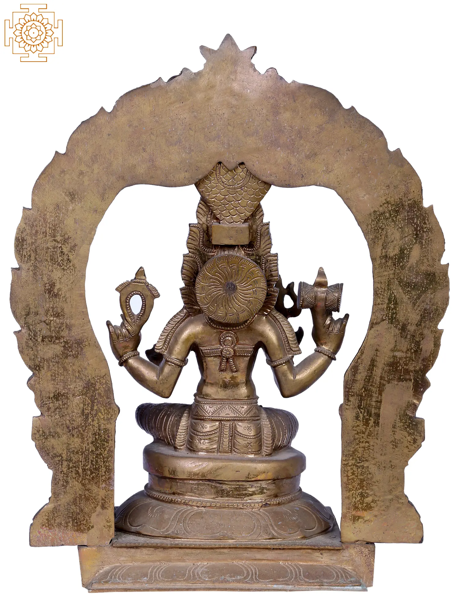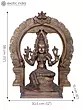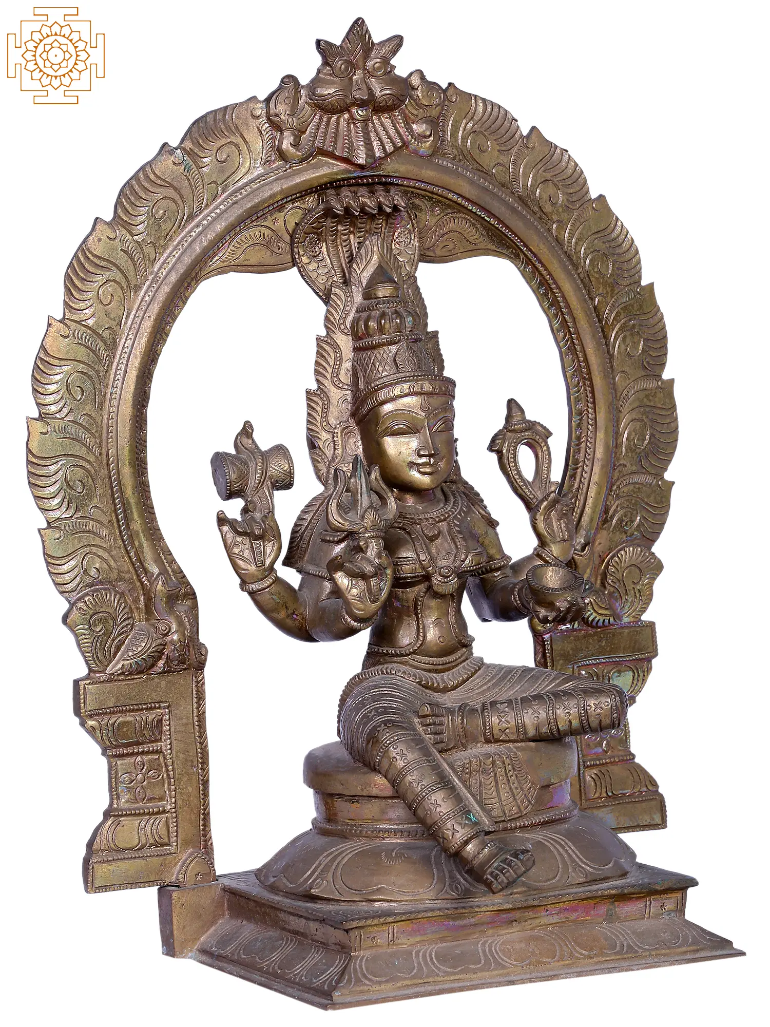 In the divine tapestry of Hindu mythology, Goddess Mariamman, the radiant embodiment of Goddess Durga”, graces the Kritimukha (the Face of Glory) in the enchanting Lalitasana posture. Cloaked in regal splendour, she wields a celestial dance of creation with a Damaru, a cobra elegantly coiled around its rhythmic beat. With a “Trident (Trishul)”,Kapala”, and “a Noose” in her hands, she manifests as a cosmic symphony, balancing destruction, creation, and preservation. As a beautiful young deity, her allure transcends mortal comprehension. This mesmerizing artwork, crafted from Panchaloha bronze from Swamimalai”, symbolizes the cosmic dance of life’s cycles, a harmonious ballet where Mariamman guides souls through the eternal rhythm of existence, enveloping all in the cosmic embrace of divine grace.