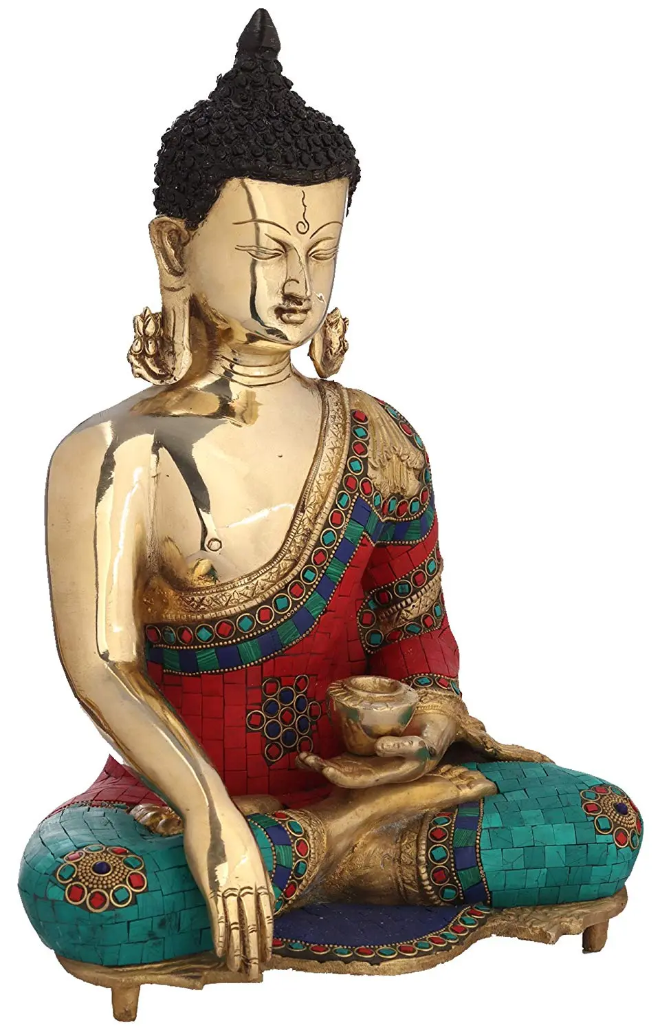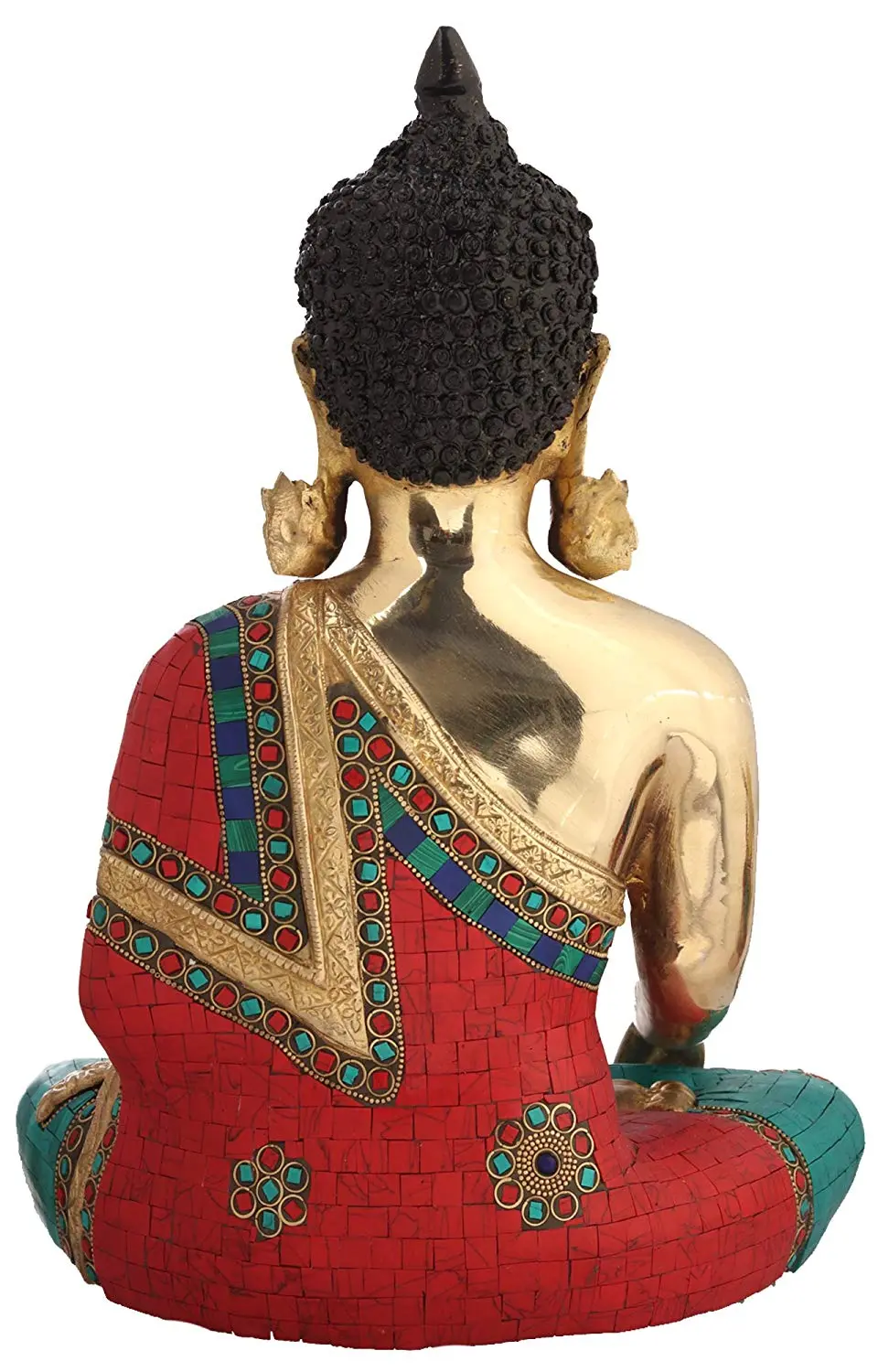 In this sculpture, Gautam Buddha sits in Bhumisparsha Mudra (also known as Earth-touching gesture) with his right hand touching the ground, symbolizing the moment of enlightenment. This gesture embodies steadfastness, enlightenment, and the triumph over ignorance. In his left hand, He carries an alms bowl, representing the path of humility and compassion. Adorned in an ornate Sangati with exquisite inlay work, Buddha represents spiritual opulence. The elongated earlobes signify his detachment from worldly desires, while the Ushnisha, a cranial bump, symbolizes his profound wisdom. This divine brass creation of Buddha inspires you to embrace the path of wisdom, compassion, and selflessness.