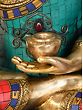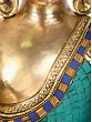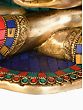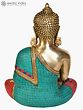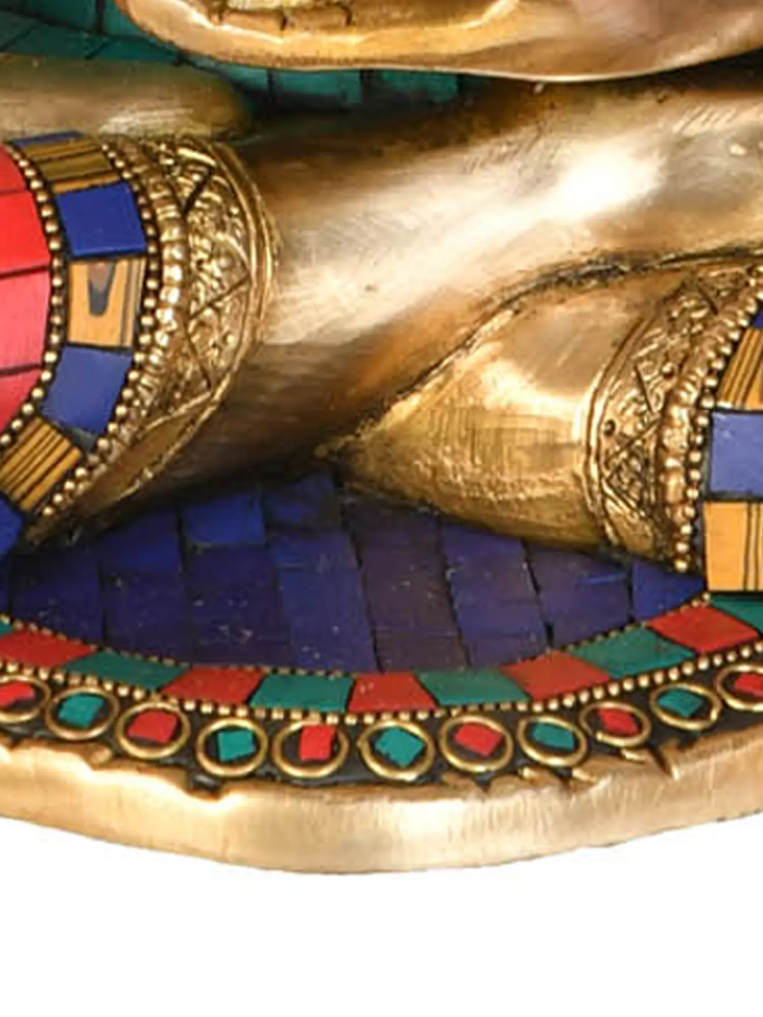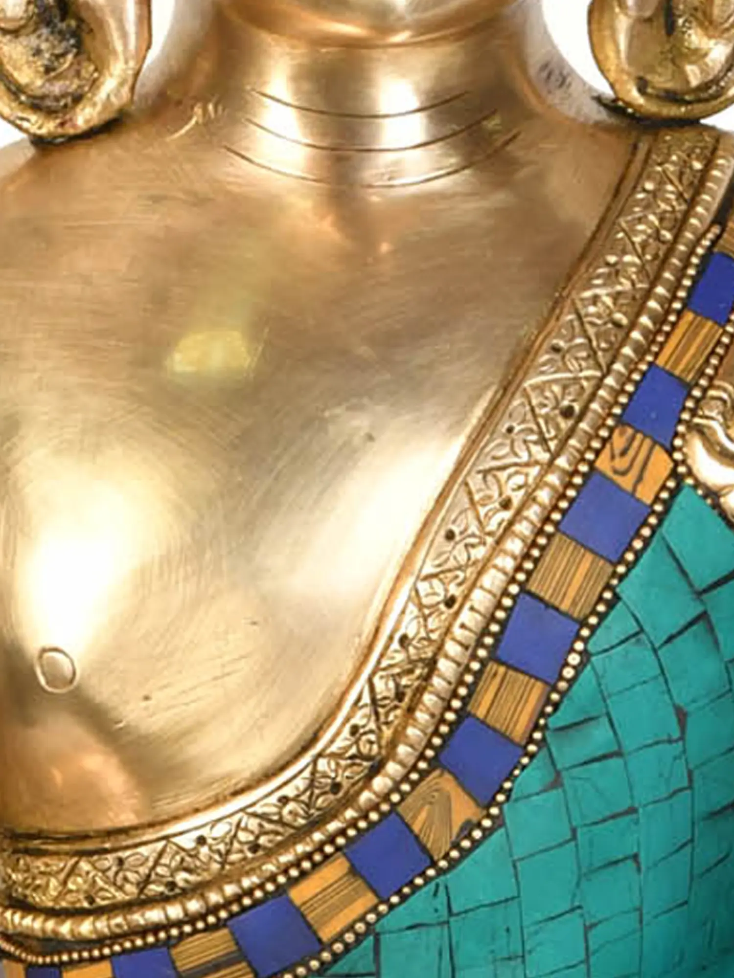 Crafted with meticulous care by skilled artisans in India, this substantial statue is a testament to centuries of artistic tradition and deep spiritual devotion. The lustrous brass forms the core of the sculpture, providing a sense of enduring strength and divine presence. The robes of the Buddha are adorned with intricate inlay work, a vibrant mosaic of turquoise and red hues, interspersed with flashes of royal blue. These colors are not merely decorative; they often carry symbolic meanings in Buddhist art. Turquoise is associated with healing, wisdom, and protection, while red can represent passion, life force,, and compassion. The rich detailing on the robes, from the cascading folds to the ornate borders, speaks volumes about the dedication of the craftsman who brought this sacred image to life.