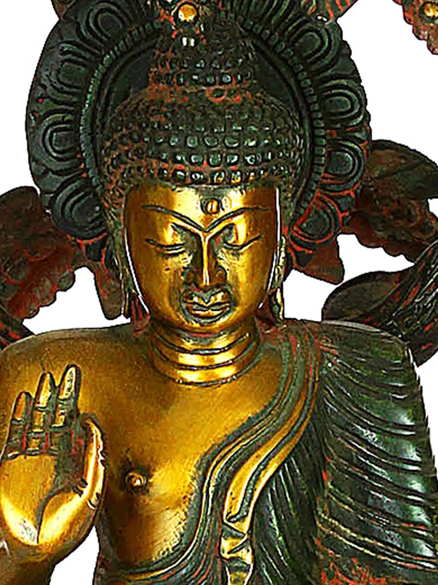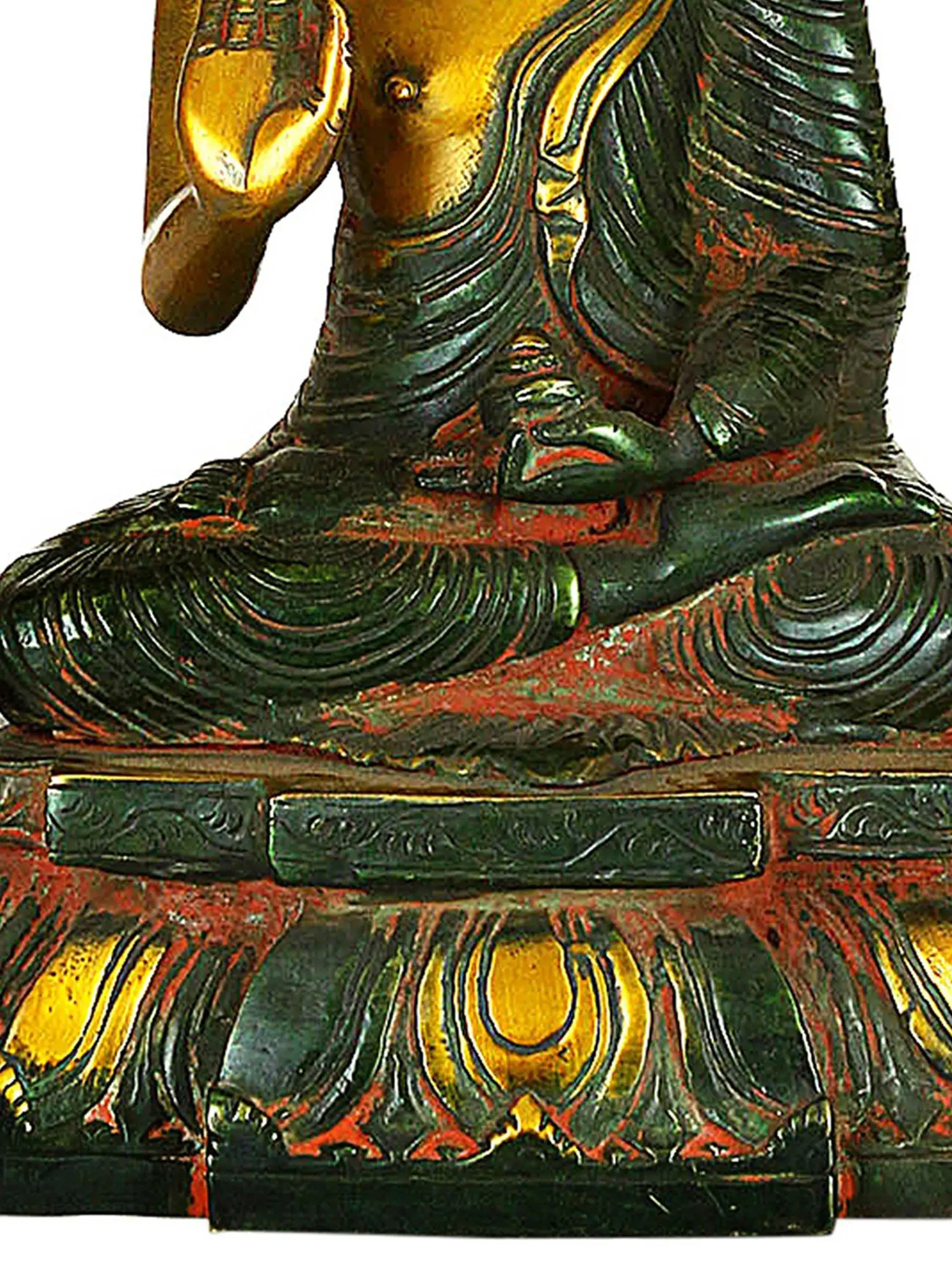 Crafted in the heart of India, this brass sculpture captures a pivotal moment in the life of Siddhartha Gautama, the man who would become known as the Buddha. It is a moment of profound transformation, of awakening and understanding under the sacred Bodhi tree. Every curve and detail, brought to life through meticulous handcraftsmanship, invites contemplation and peace. The sculpture portrays Buddha in a meditative pose, seated on an ornate base, the right hand raised in the Abhaya Mudra, a gesture that symbolizes protection, peace, and the dispelling of fear.