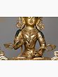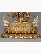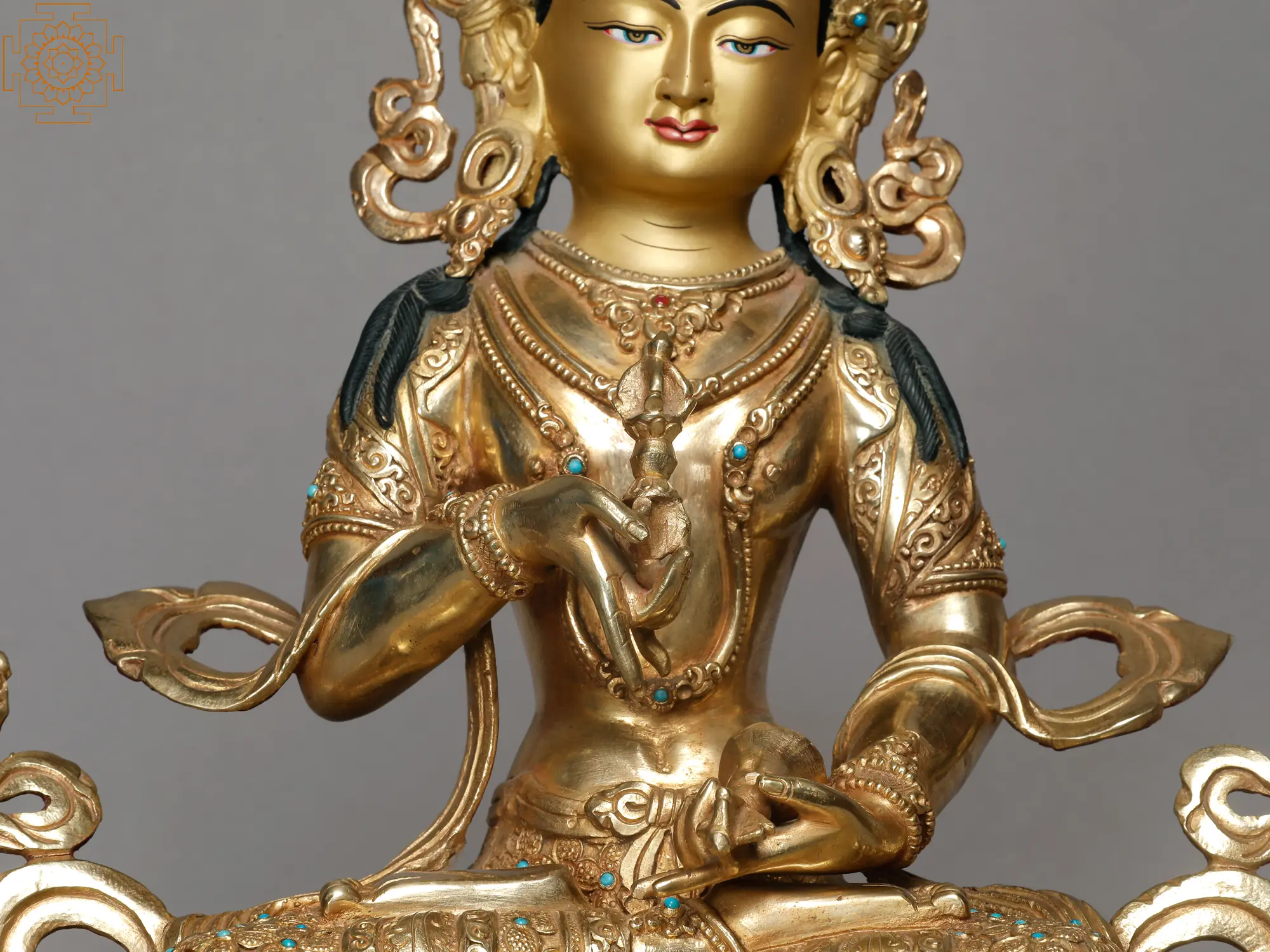 The distinctive attribute held by Vajrasattva is the vajra, symbolizing indestructible enlightenment, and a bell, representing wisdom. These implements highlight the harmonious integration of wisdom and skillful means on the path to awakening.