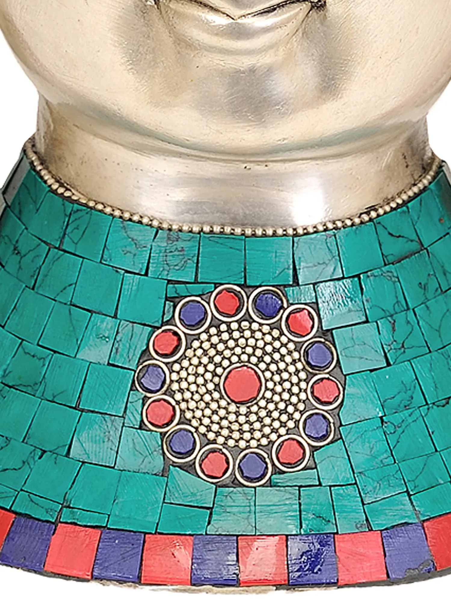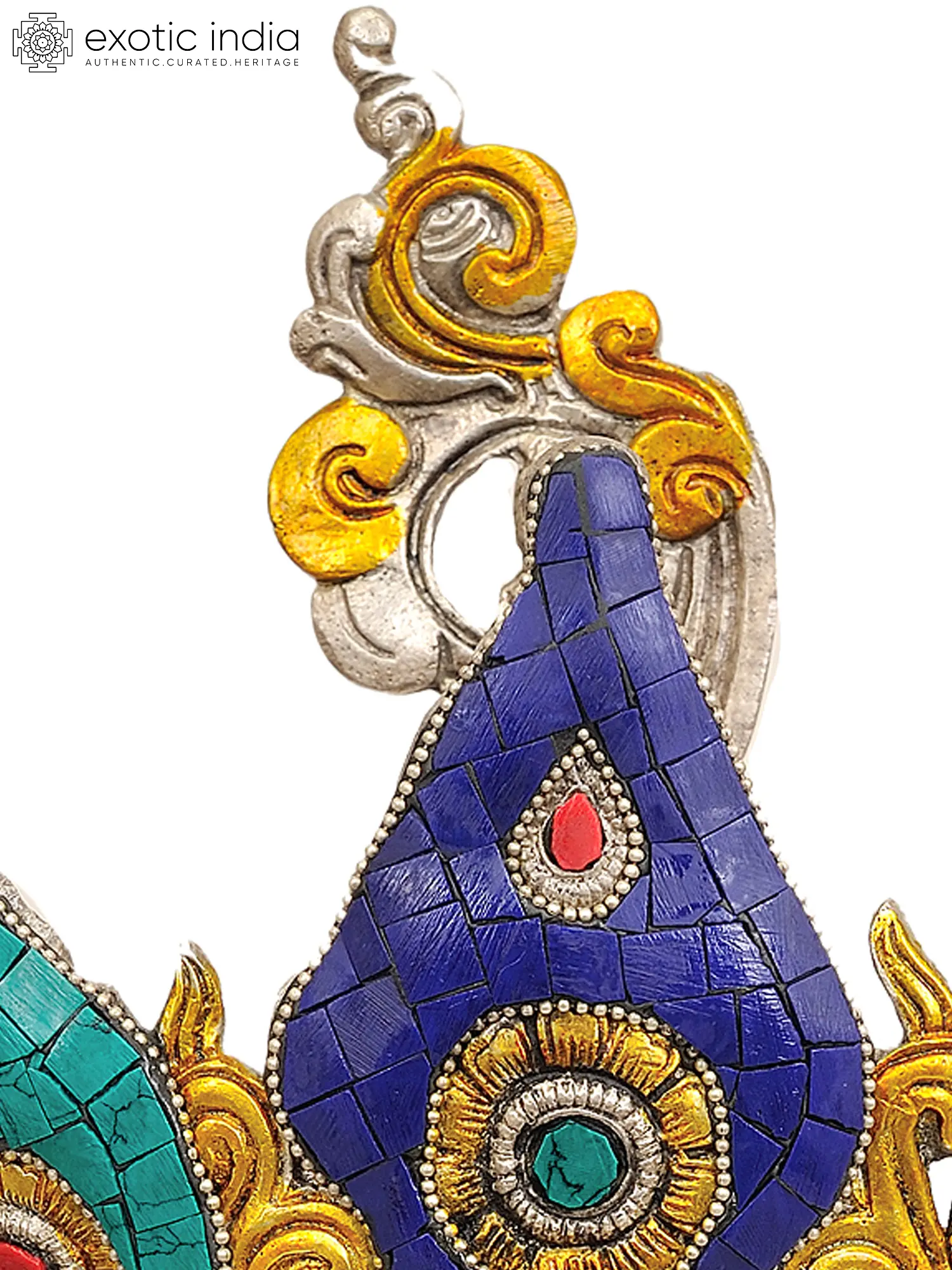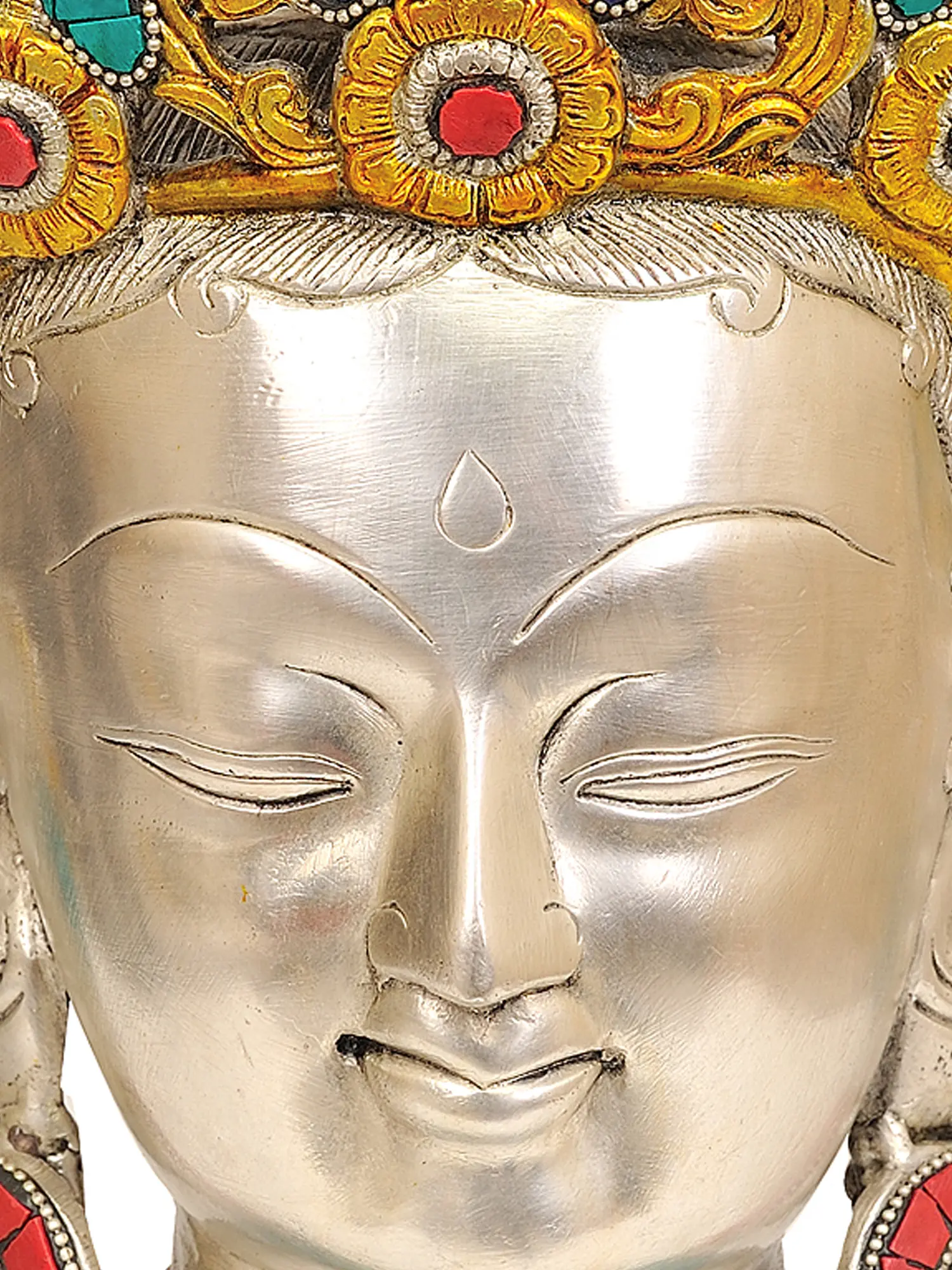 The elaborate crown itself is a testament to the deity's supreme status and multifaceted nature. The vibrant inlay work, featuring shades of deep blue, vivid turquoise, and rich red, evokes the precious jewels of the spiritual path. These colors are not merely decorative; they carry deep symbolic meaning. Blue often represents the wisdom of emptiness, turquoise embodies the boundless sky and freedom from suffering, and red signifies compassion and skillful means. The intricate golden accents suggest the radiant light of enlightenment, guiding devotees through the darkness of ignorance. The meticulous inlay technique, a hallmark of traditional Indian craftsmanship, transforms the brass into a canvas of spiritual storytelling, each tiny piece painstakingly placed to create a harmonious and captivating whole.