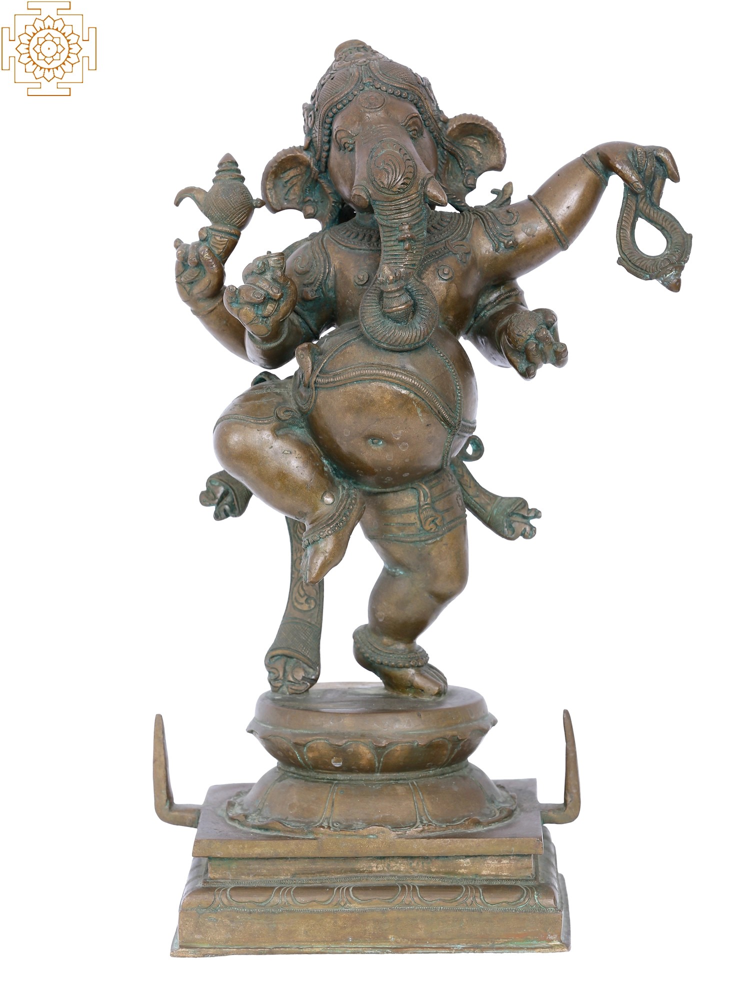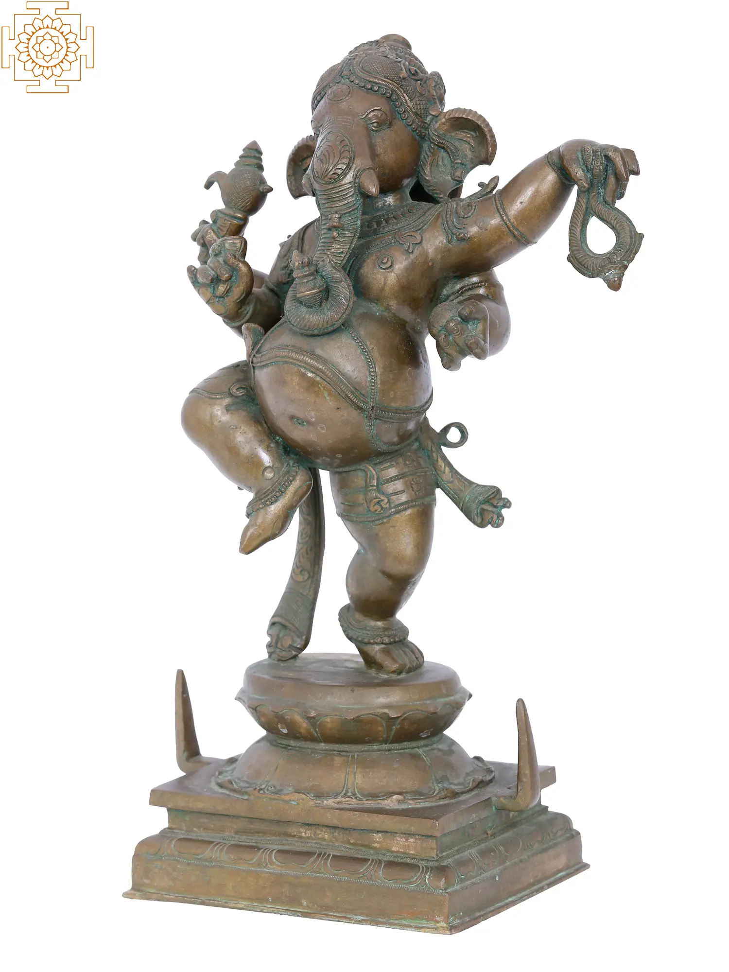 Behold a magnificent bronze representation of Lord Ganesha, the remover of obstacles and patron of arts and sciences, captured in a vibrant, dynamic dance. This exquisite piece, crafted using the ancient Madhuchista Vidhana (lost-wax) method in Swamimalai, a region renowned for its bronze casting heritage, embodies the spirit of movement and divine joy. The Panchaloha bronze, a sacred alloy of five metals, imbues the sculpture with a timeless aura and a rich, enduring patina. The joyous 'Nataraja' Ganesha is depicted in mid-dance, a pose that symbolizes the cosmic dance of creation and destruction. In one hand, he gracefully holds a modak, his favorite sweet, representing the rewards of devotion and intellectual pursuit. In another, he clutches a conch shell, the sound of which is believed to dispel negativity and herald auspicious beginnings. The energetic posture, with one leg lifted and the other firmly planted, conveys a sense of unstoppable momentum and joyful abandon. The delicate detailing of his ornaments, the tusks, and the serene expression on his elephant face speak to the immense skill of the artisans.