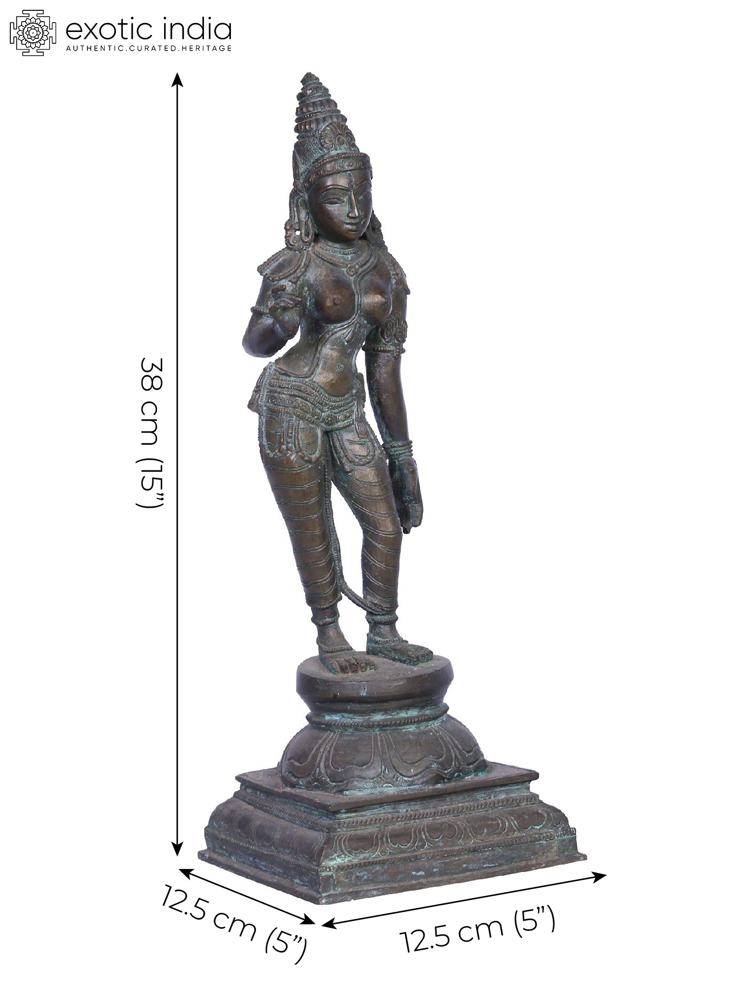Observing and marveling at a Panchaloha bronze Uma statue like the one we have here, is a complete lesson on the ancient iconographic treatise and their rules on molding the perfect feminine form. Being a part of Shiva shrines, a Uma bronze is a pious and deific presence, which is always sculpted with a fitting platform of inverted lotus.