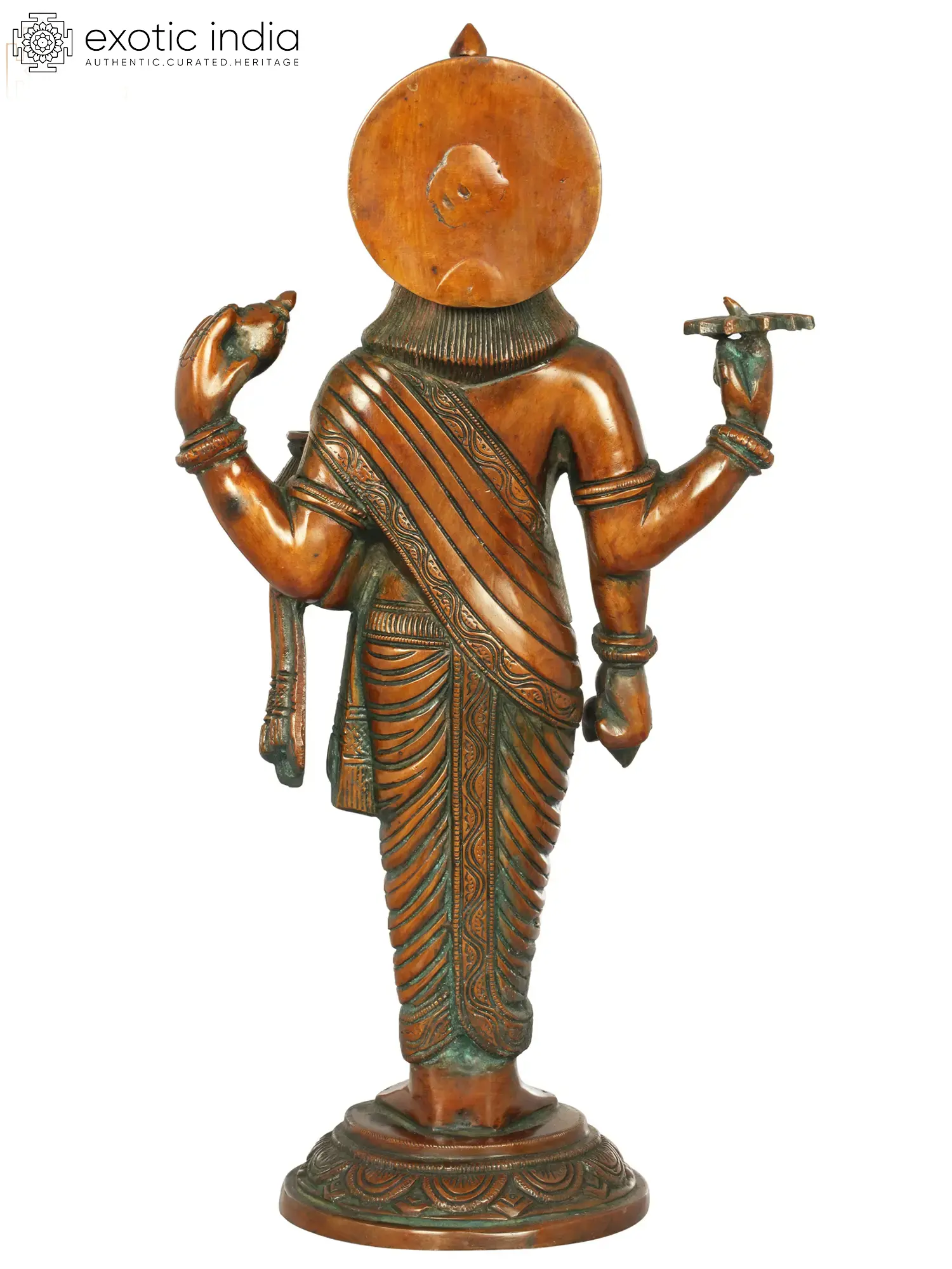 An incarnation of Adi Narayana - Dhanvantri is the physician of the heavens in the Hindu tradition. According to ancient legends, he is said to have emerged during the churning of the milk ocean (Samudra Manthan) and is credited as the inspirational source of Ayurvedic practice. Cast in the durable brass, here Dhanvantri stands up straight on a disc-shaped pedestal as Chaturbhujadhari (four-armed) holding a chakra, conch, medicinal herb (vanaspati), and the pot of elixir representing healing and longevity.