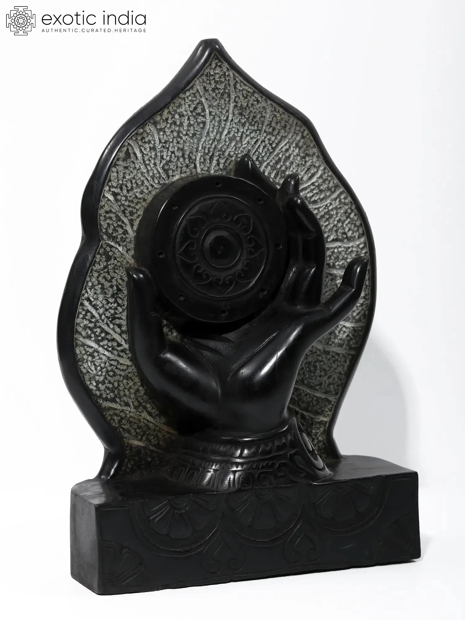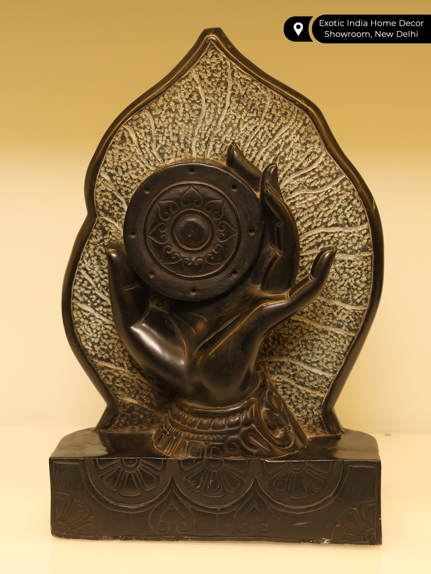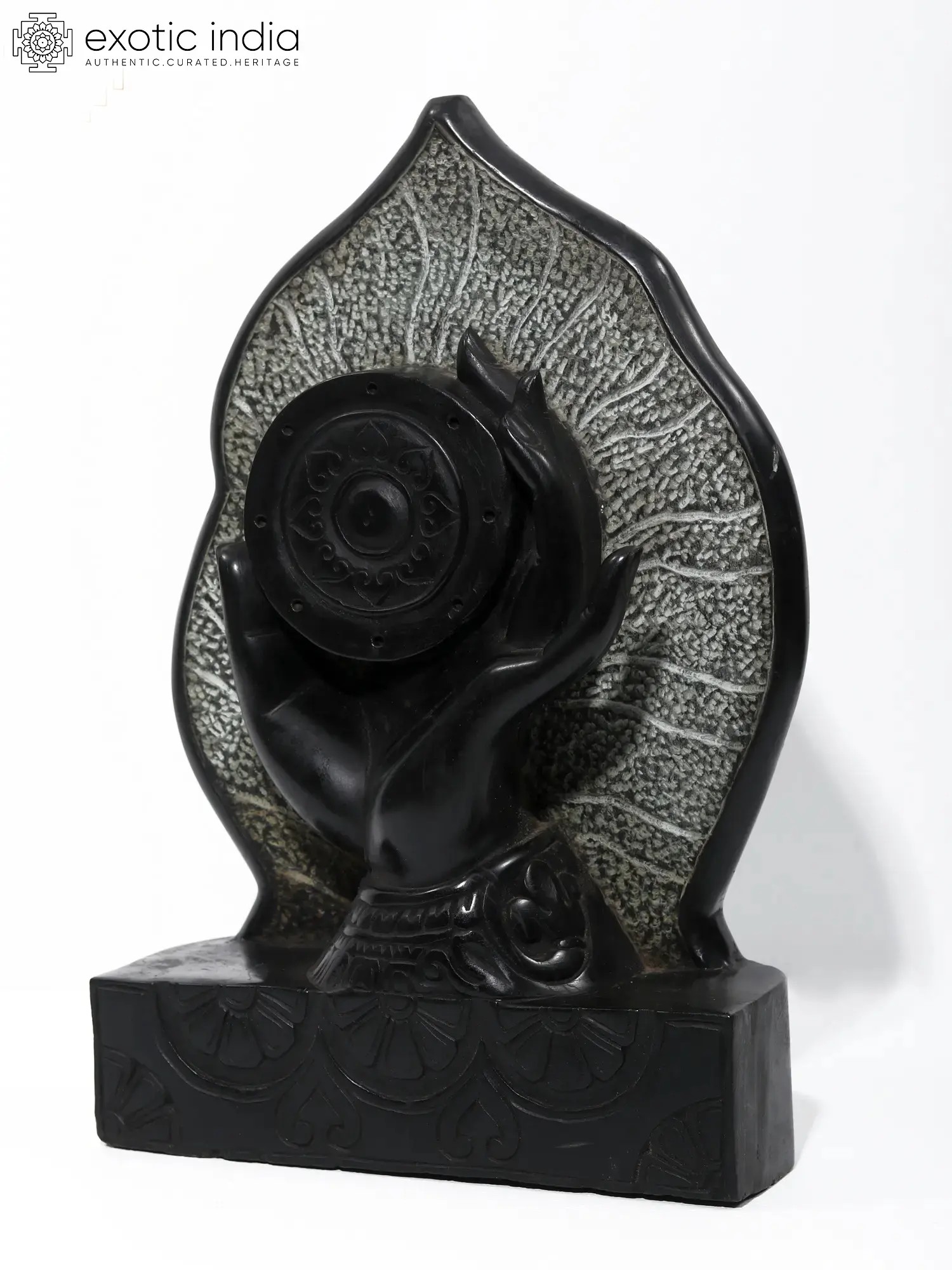 "Dharma Chakra in Buddha Hand" in Black Marble is a captivating modern art piece that fuses ancient symbolism with contemporary aesthetics. The sculpture depicts a sleek, minimalist rendition of a Dharmachakra (wheel of law) held within a sculpted hand representing the Buddha. The artwork draws inspiration from Buddhist teachings and symbolizes the eternal cycle of life, enlightenment, and the path to liberation. The innovative design incorporated reflects the evolution of modern art, merging traditional iconography with a contemporary artistic approach. This piece not only serves as a visual representation of Buddhist philosophy but also encourages viewers to contemplate timeless wisdom and seek inner harmony in the modern world.