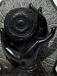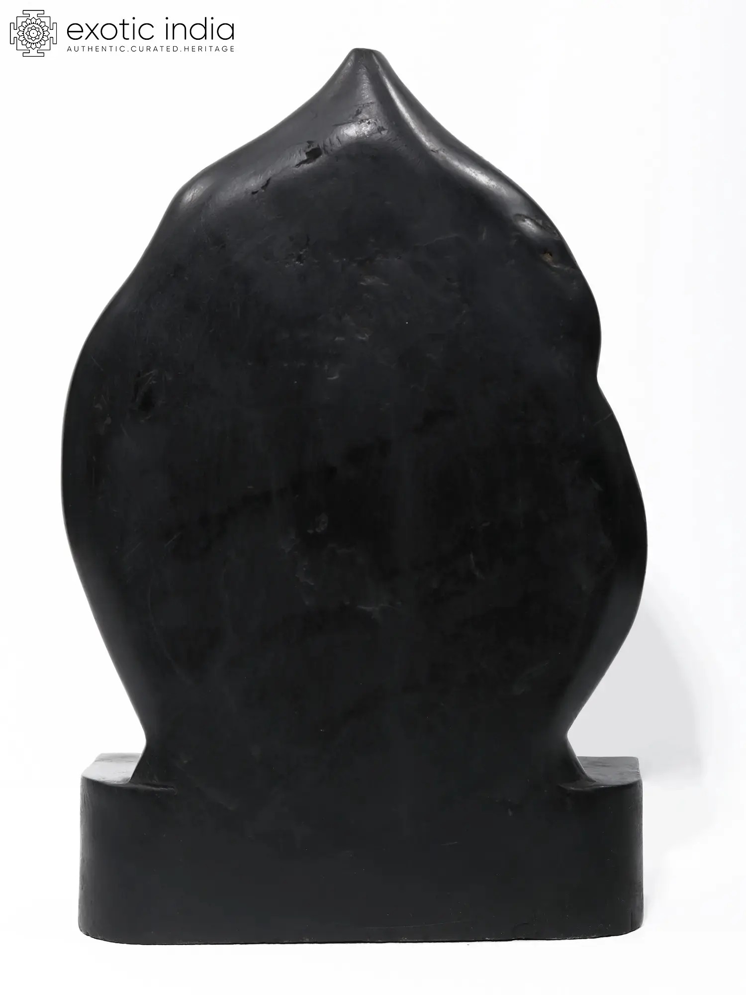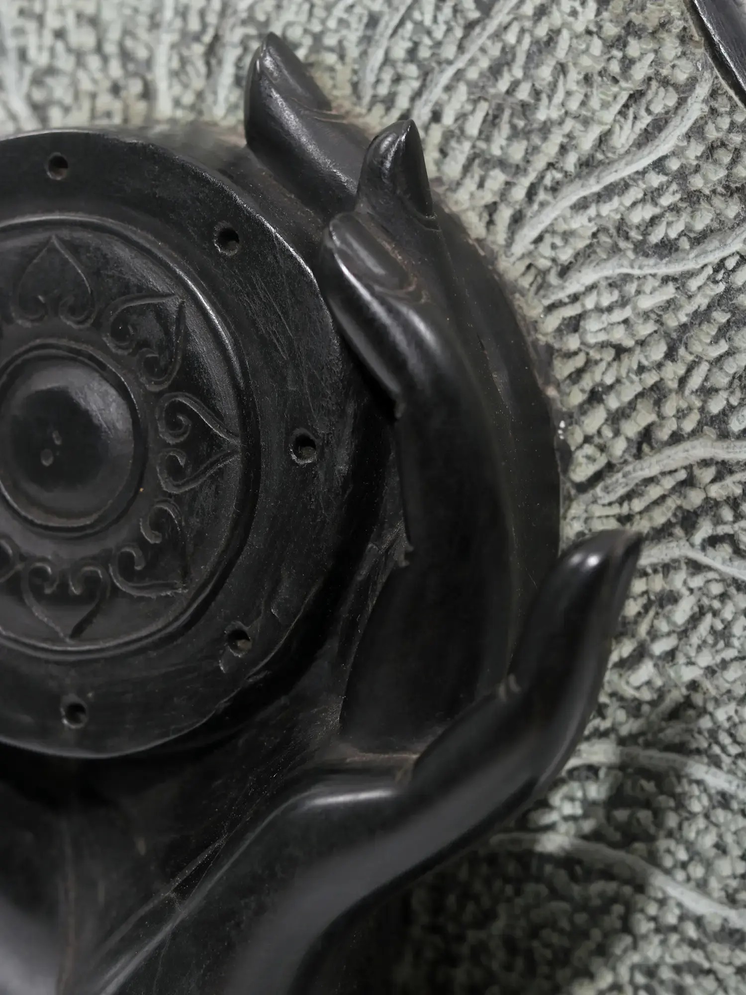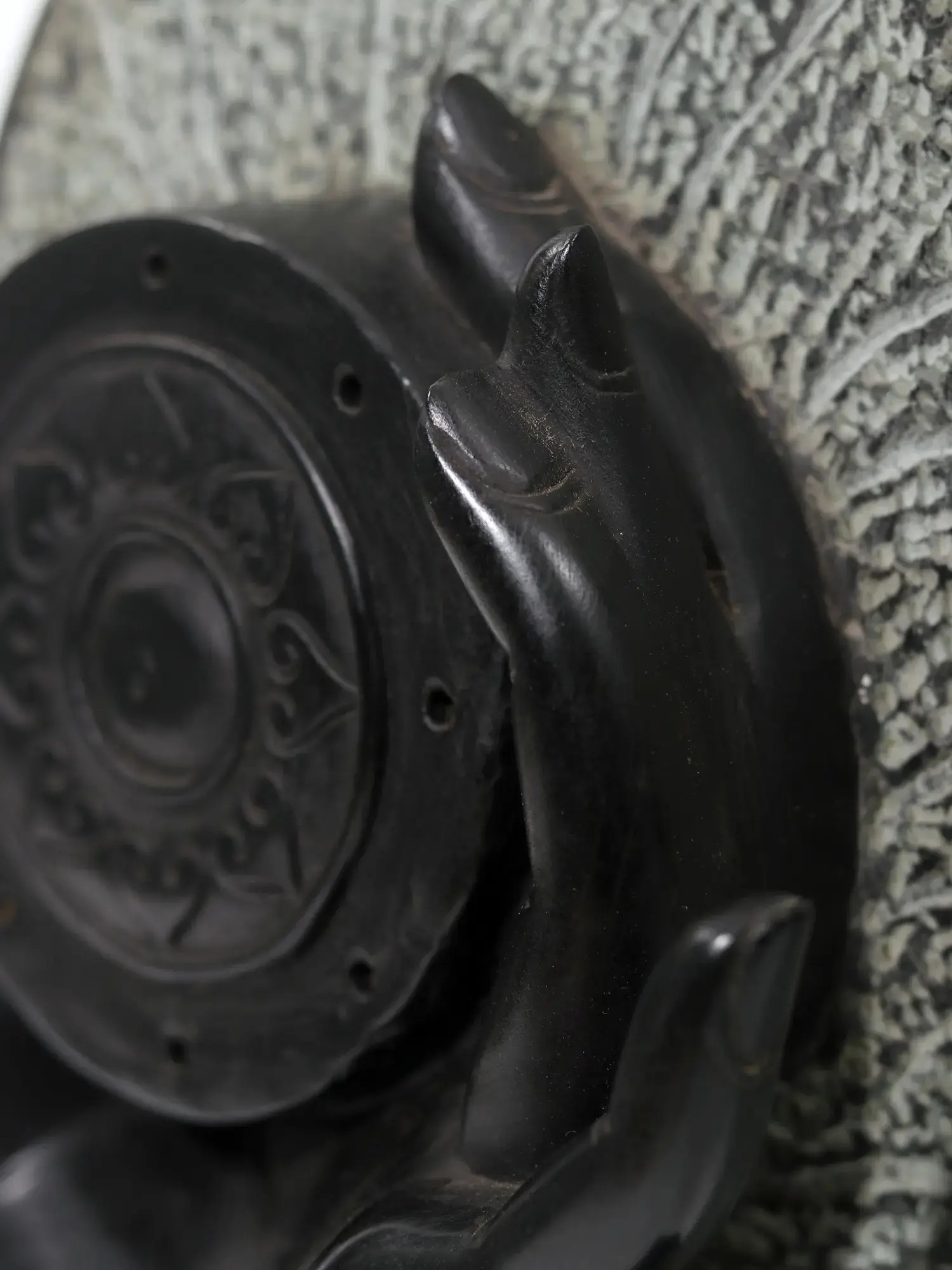 "Dharma Chakra in Buddha Hand" in Black Marble is a captivating modern art piece that fuses ancient symbolism with contemporary aesthetics. The sculpture depicts a sleek, minimalist rendition of a Dharmachakra (wheel of law) held within a sculpted hand representing the Buddha. The artwork draws inspiration from Buddhist teachings and symbolizes the eternal cycle of life, enlightenment, and the path to liberation. The innovative design incorporated reflects the evolution of modern art, merging traditional iconography with a contemporary artistic approach. This piece not only serves as a visual representation of Buddhist philosophy but also encourages viewers to contemplate timeless wisdom and seek inner harmony in the modern world.