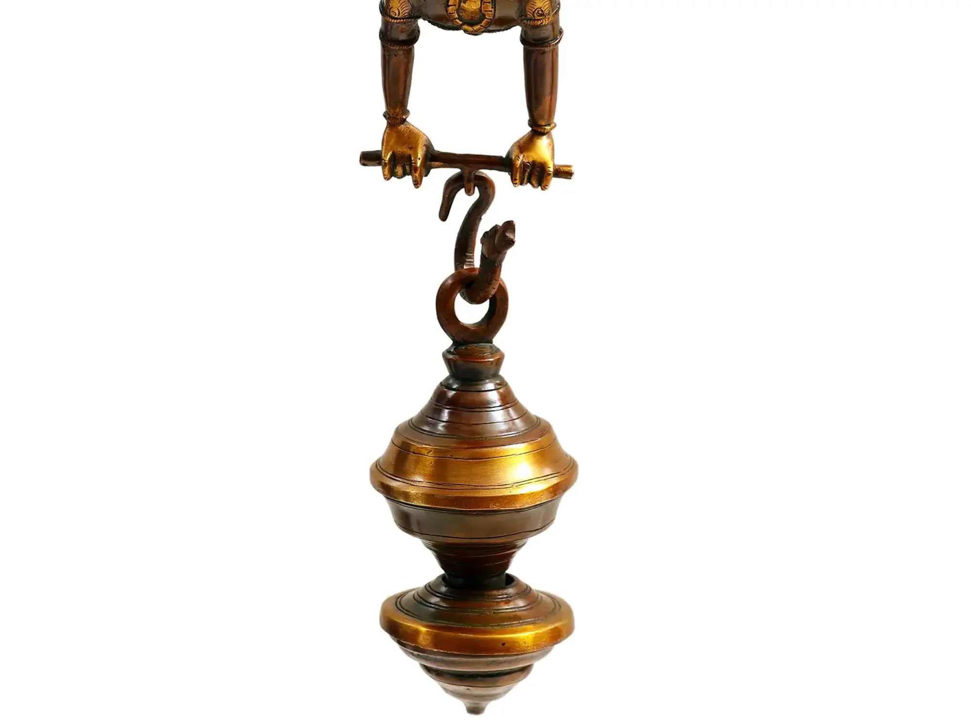 This Female Acrobat Oil Lamp in brass is a monument to the lamp manufacturers' astute skill. In the crown picture, a female acrobat balances her hands with her feet and legs high over her head. The chain is tied to the female's back, and beneath her is a Kindi Vilakku light. The lamp's pot-shaped body also serves as an oil reservoir. There is only one wick that recharges via the oil pot. This light has no spiritual value and is mainly used as a decorative object.