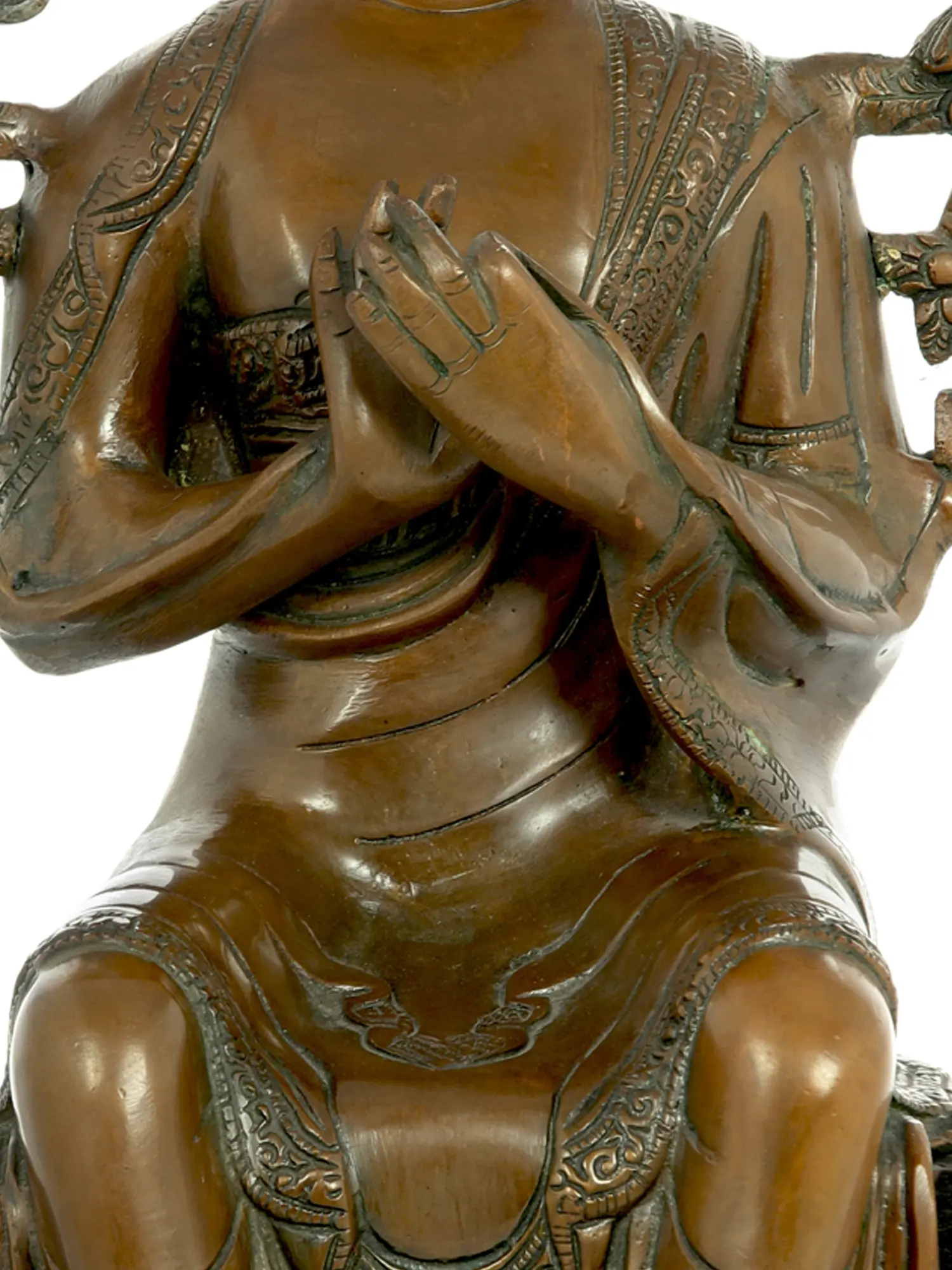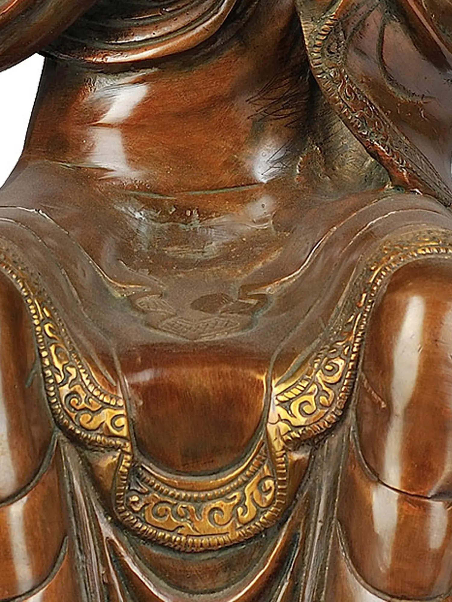 This exquisite brass statue depicts Maitreya, the future Buddha, a figure of profound hope and serenity in Buddhist tradition. Maitreya is revered as the successor to Gautama Buddha, destined to appear on Earth in the distant future to inaugurate a new era of enlightenment. He is a symbol of universal compassion, wisdom, and the unfolding of spiritual potential for all beings. This artwork captures the essence of his benevolent nature, inviting contemplation and spiritual upliftment. The posture of the statue, with hands joined in the gesture of preaching or teaching, signifies his role as a guide and spiritual leader. The serene expression, the gentle curve of the lips, and the downcast eyes convey a sense of deep wisdom and inner peace. The intricate detailing of his monastic robes, flowing with graceful folds, showcases the masterful craftsmanship involved in its creation. Each pleat and drape is rendered with meticulous attention, imbuing the figure with a sense of lifelike presence and artistic sophistication.