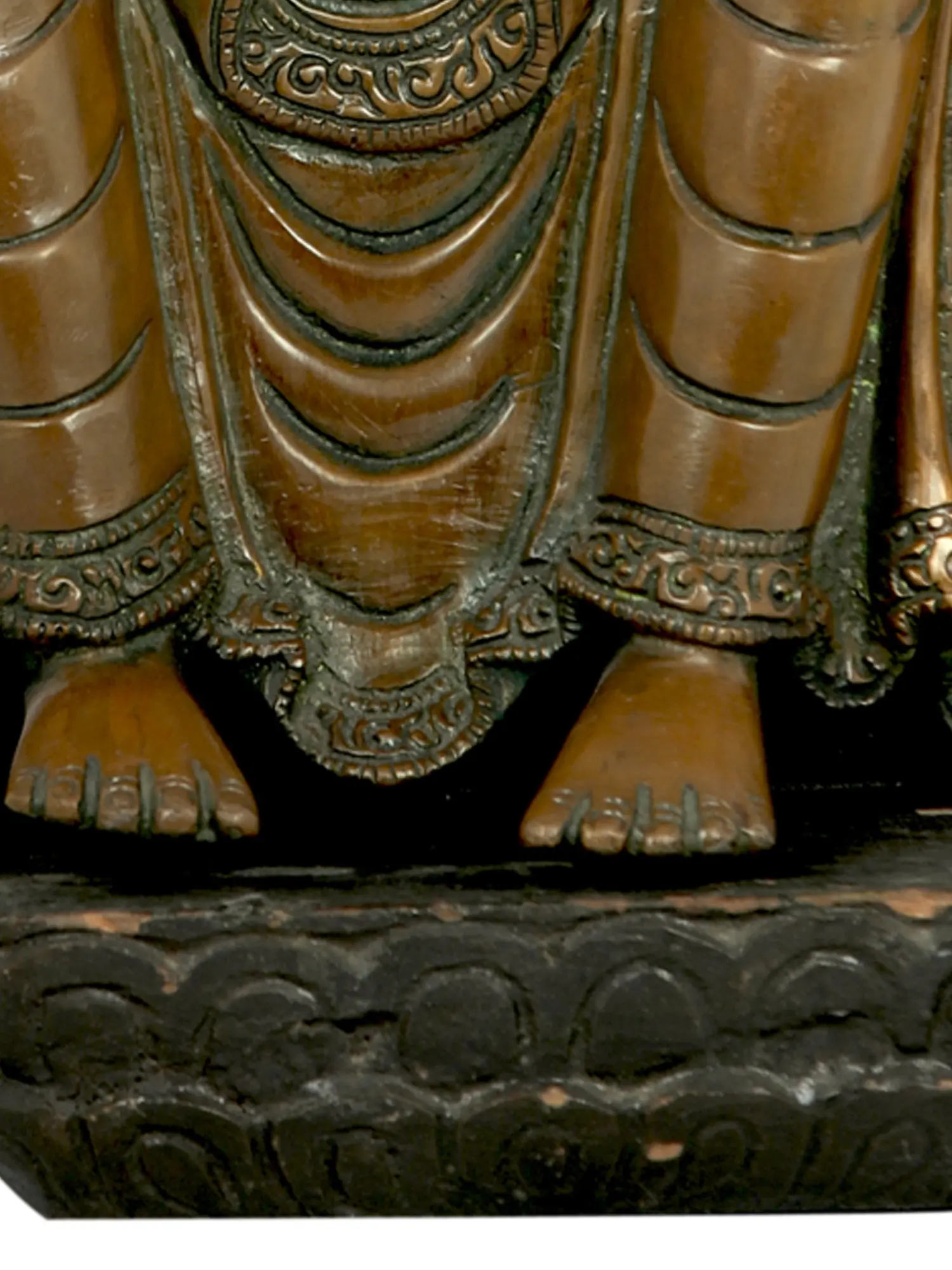 Flanking Maitreya are two emblematic elements. To his left, the Dharma Chakra, the Wheel of Law, represents the Buddha's teachings and the path to liberation. This ancient symbol, often depicted with eight spokes, embodies the Noble Eightfold Path, the core principles for achieving enlightenment. On his right, a stupa, a dome-shaped reliquary containing sacred relics, symbolizes the physical presence of the enlightened and the enduring legacy of Buddhist teachings. These symbols, intricately rendered in brass, further enrich the spiritual narrative of the sculpture, reinforcing Maitreya's role in perpetuating the Dharma. The presence of these iconic Buddhist motifs underscores the significance of Maitreya as the custodian and future propagator of the Buddha's wisdom.