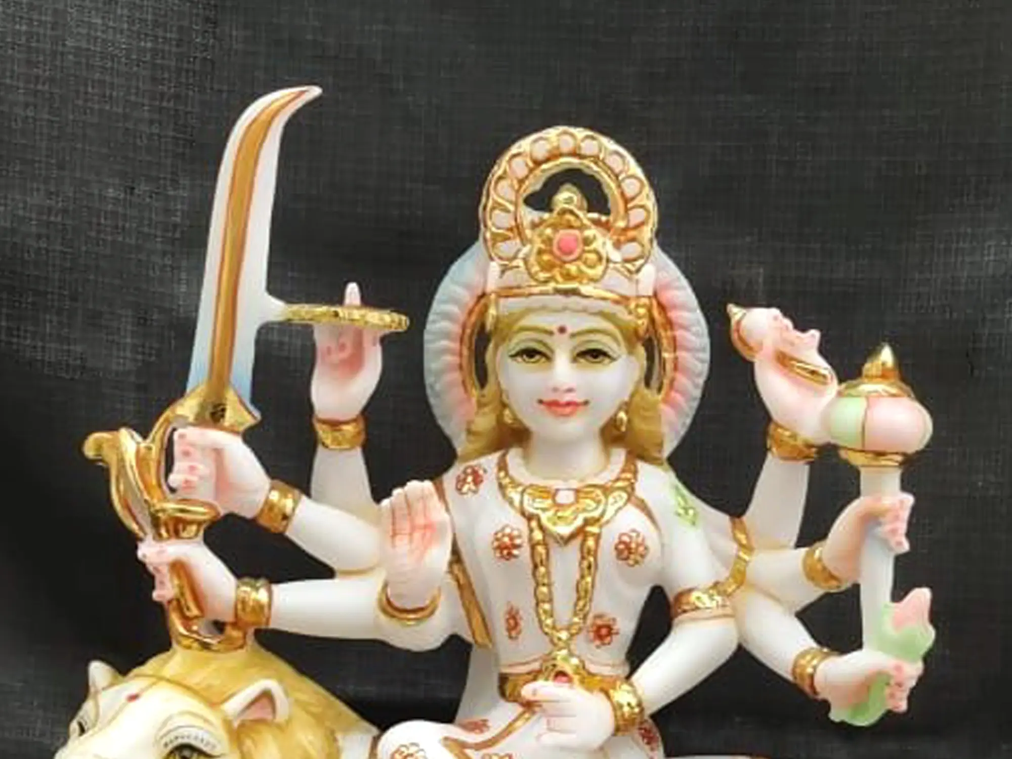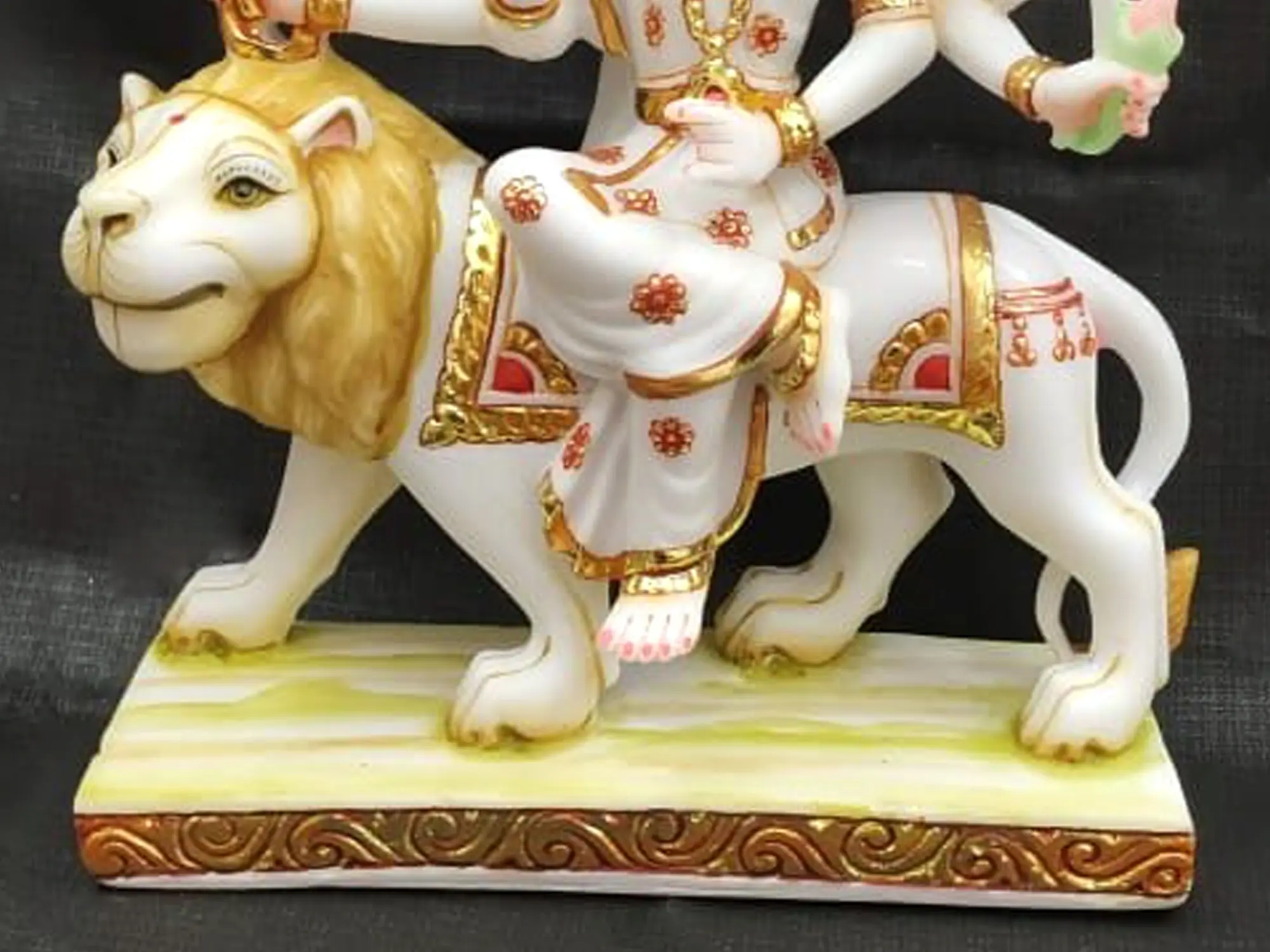 This exquisite statue captures the awe-inspiring presence of Goddess Durga, the powerful Hindu deity revered as the vanquisher of evil and the mother of the universe. Seated majestically upon her lion vahana, a symbol of strength, courage, and royalty, this rendition embodies Durga's fierce compassion and her unwavering resolve to protect her devotees. The intricate craftsmanship, rendered in pristine Vietnam marble, brings to life the divine aura of the goddess and her mighty steed. The goddess is depicted with her characteristic multiple arms, each holding an emblem of her divine powers. In one hand, she holds a shining sword, ready to strike down negativity and ignorance. Another hand showcases a disc, representing the cyclical nature of time and the goddess's omnipresence. Her serene yet determined expression reflects her boundless grace and her role as the ultimate protector, a maternal figure who safeguards humanity from all forms of suffering and malevolence. The delicate painting and the subtle gold accents further enhance the divine beauty, drawing the viewer into a realm of spiritual reverence.