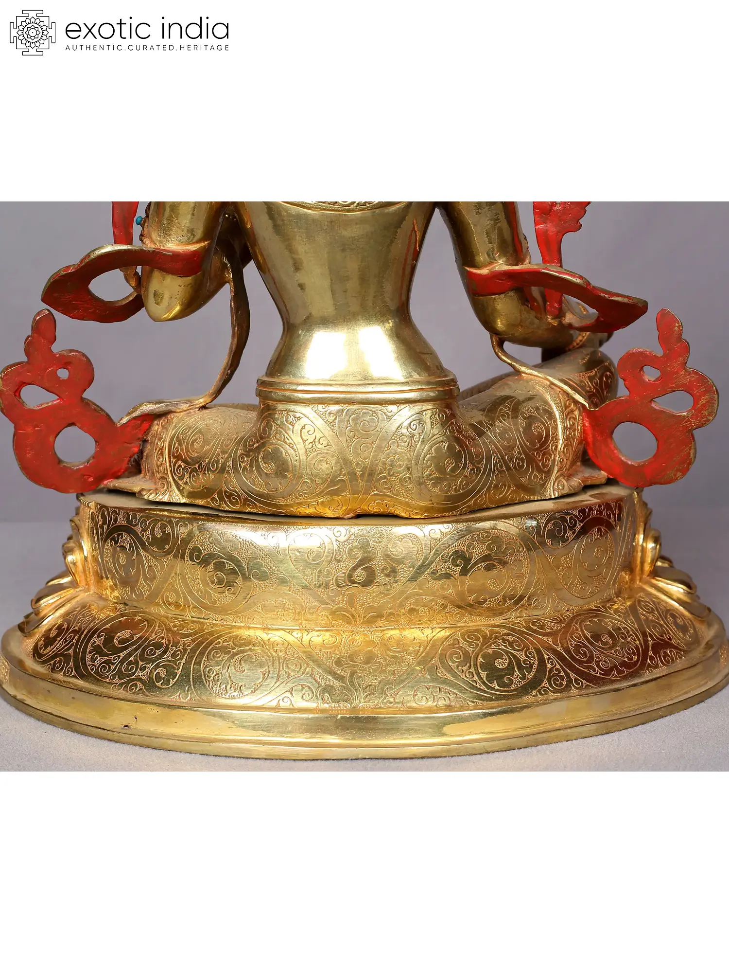 Holding the wish-fulfilling jewel in her right hand and the gesture of giving boons in her left, Green Tara is brought to us in this beautiful gilded copper Nepalese statue. A lotus is the seat of the deity, who carries two lotuses whose stalks are charmingly wrapped around her delicate hands. The distinctive Nepalese jewelry- five-pronged crowns, three necklaces, and circular earrings are offered to the Bodhisattva. Tara extends her right leg outside her throne, as a symbol of her readiness to answer the evocations of her practitioner.