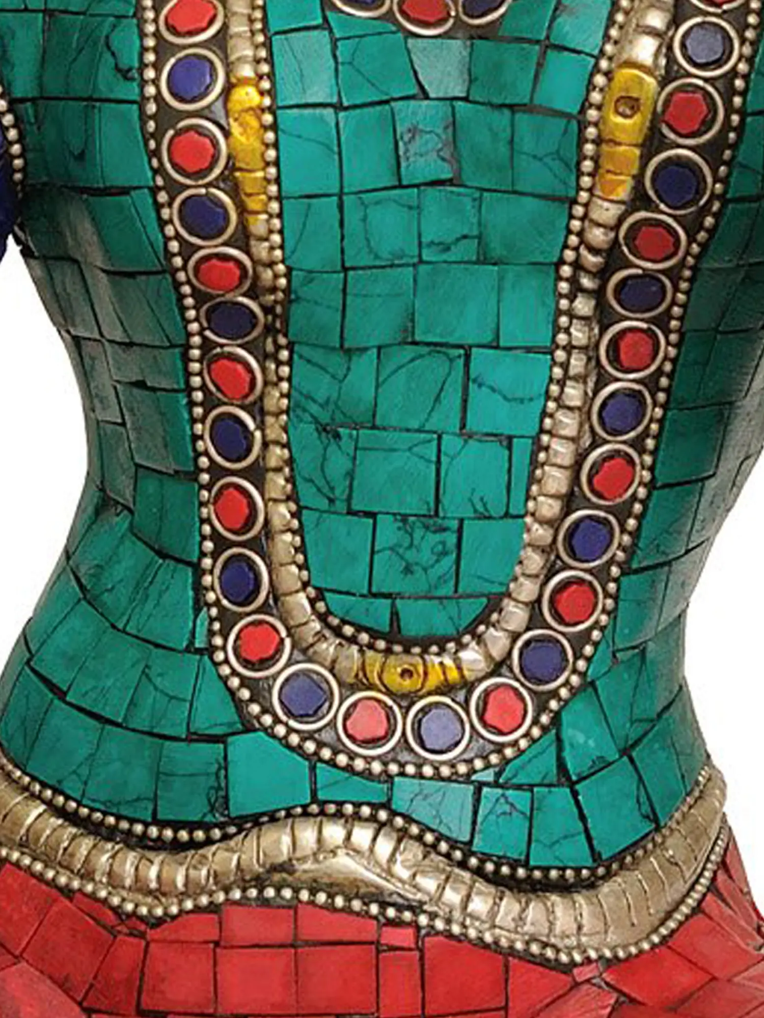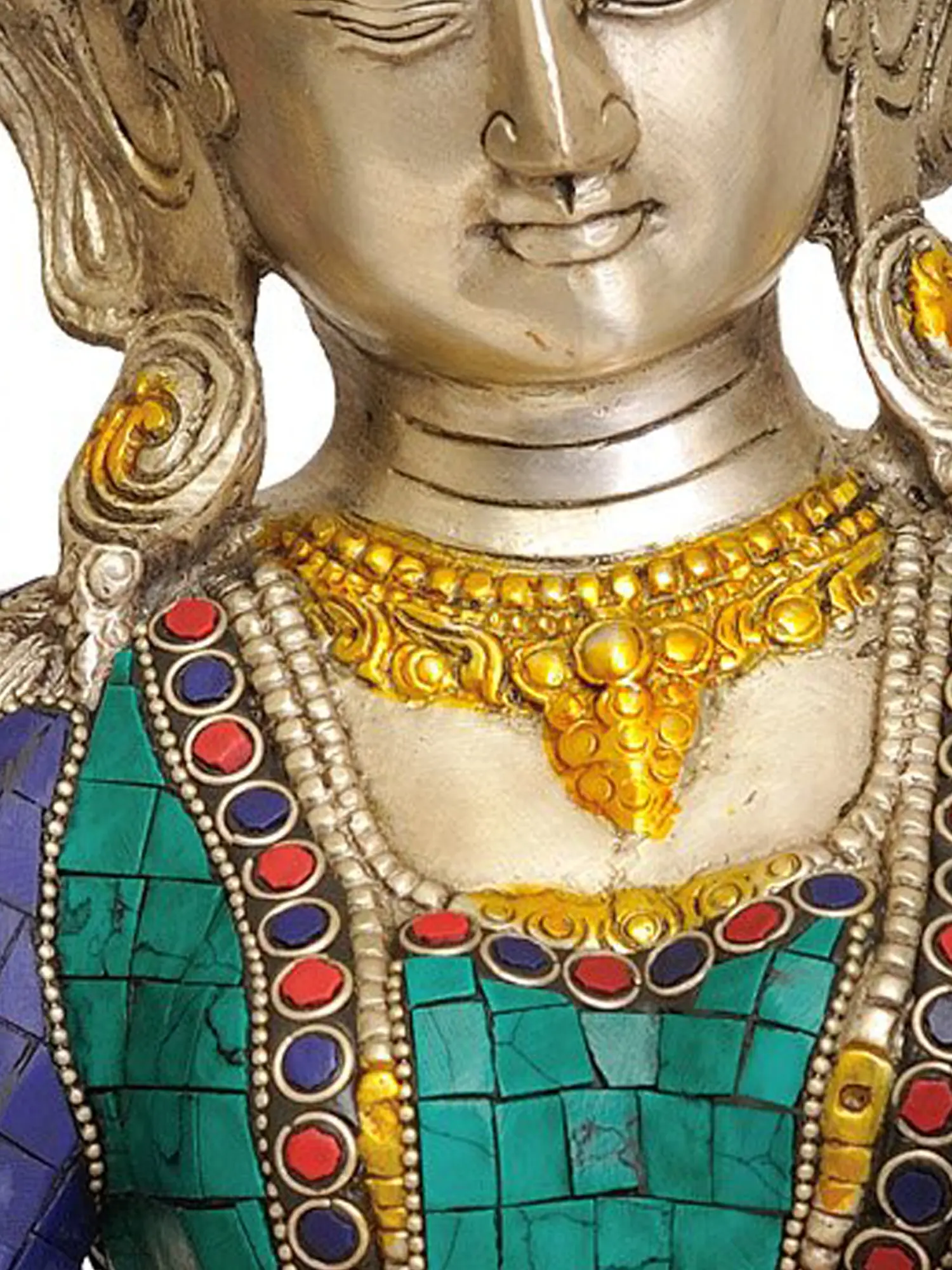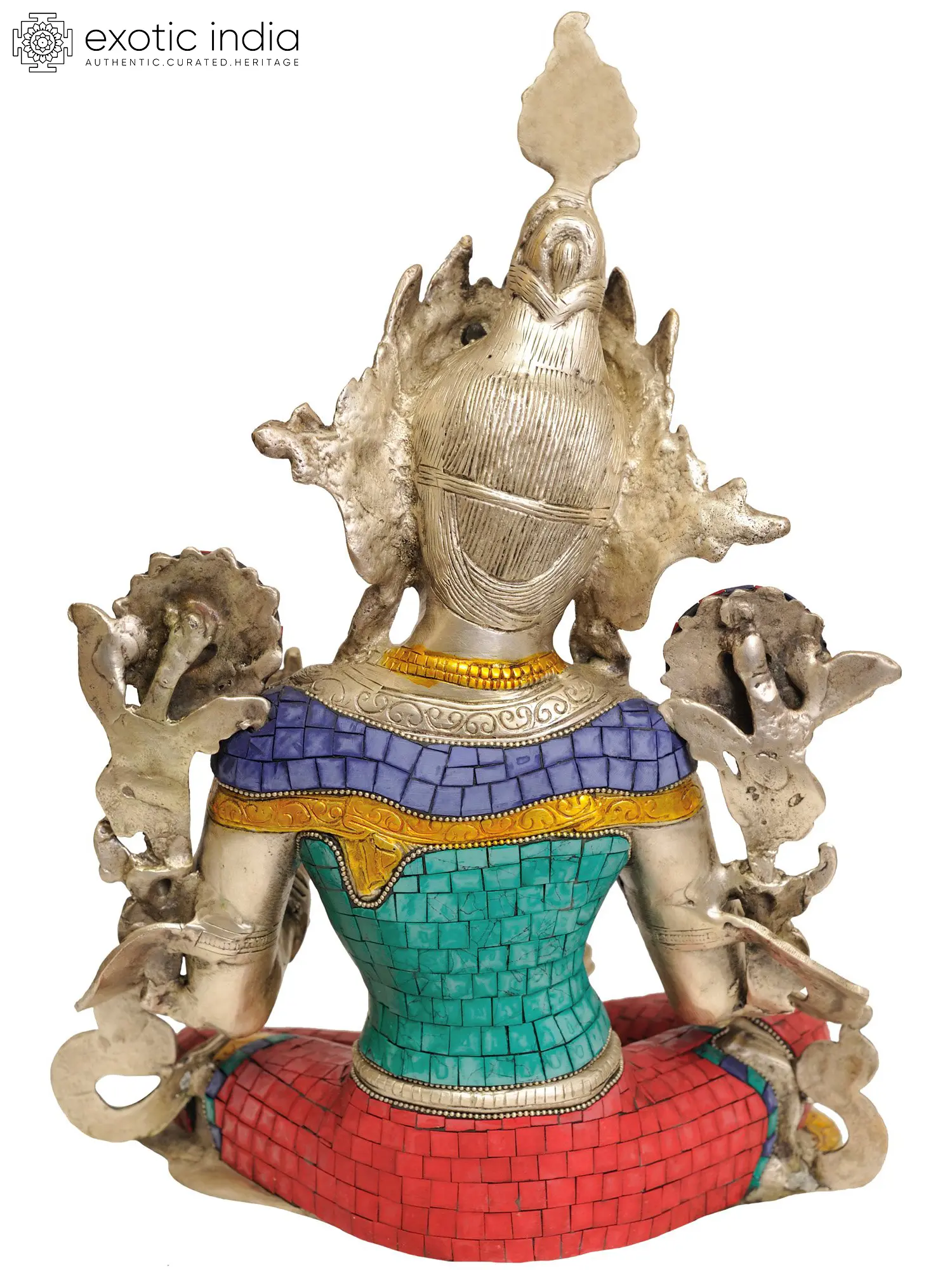 The statue depicts Green Tara seated in the lotus position, her posture radiating tranquility and grace. Her right hand is held in the *abhaya mudra*, the gesture of fearlessness and protection, while her left hand rests on her lap, holding the stem of a lotus flower, a symbol of purity and enlightenment. The intricate details of her serene face, with eyes closed in meditation, invite a sense of peace and contemplation. Adorned with a magnificent crown and elaborate jewelry, she embodies divine royalty and celestial beauty. The rich inlay work, featuring vibrant turquoise and coral-colored stones interspersed with the silvery gleam of the brass, adds a layer of opulence and symbolic depth. ––––––––––––––––––