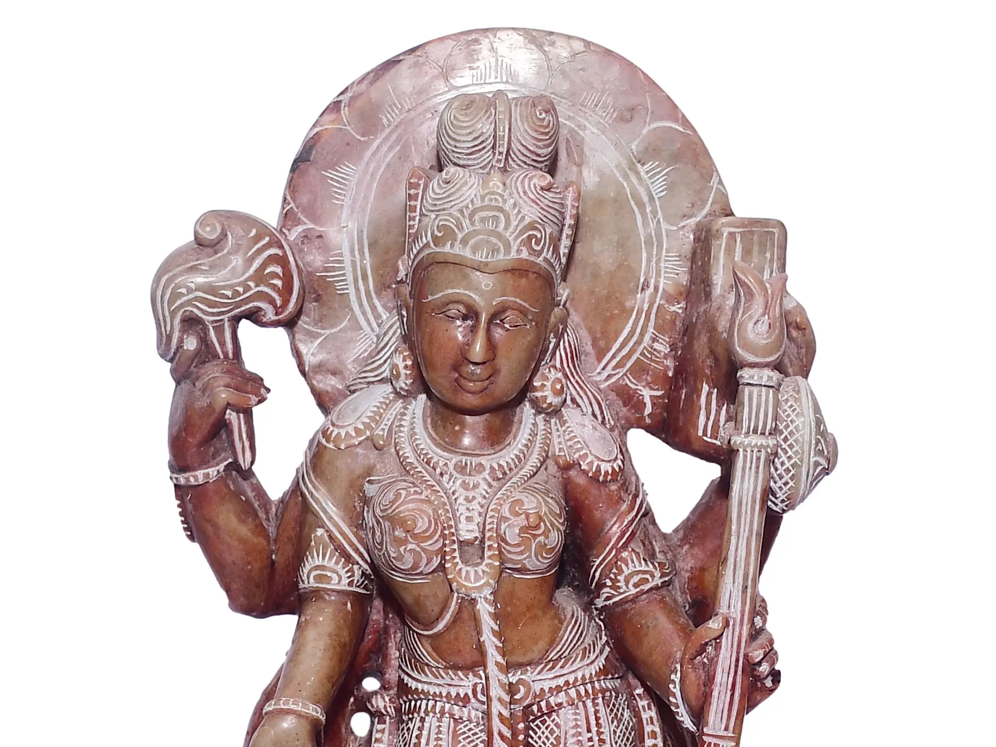 8" Goddess Saraswati Holding Veena | Red Stone Statue | Hand Carved