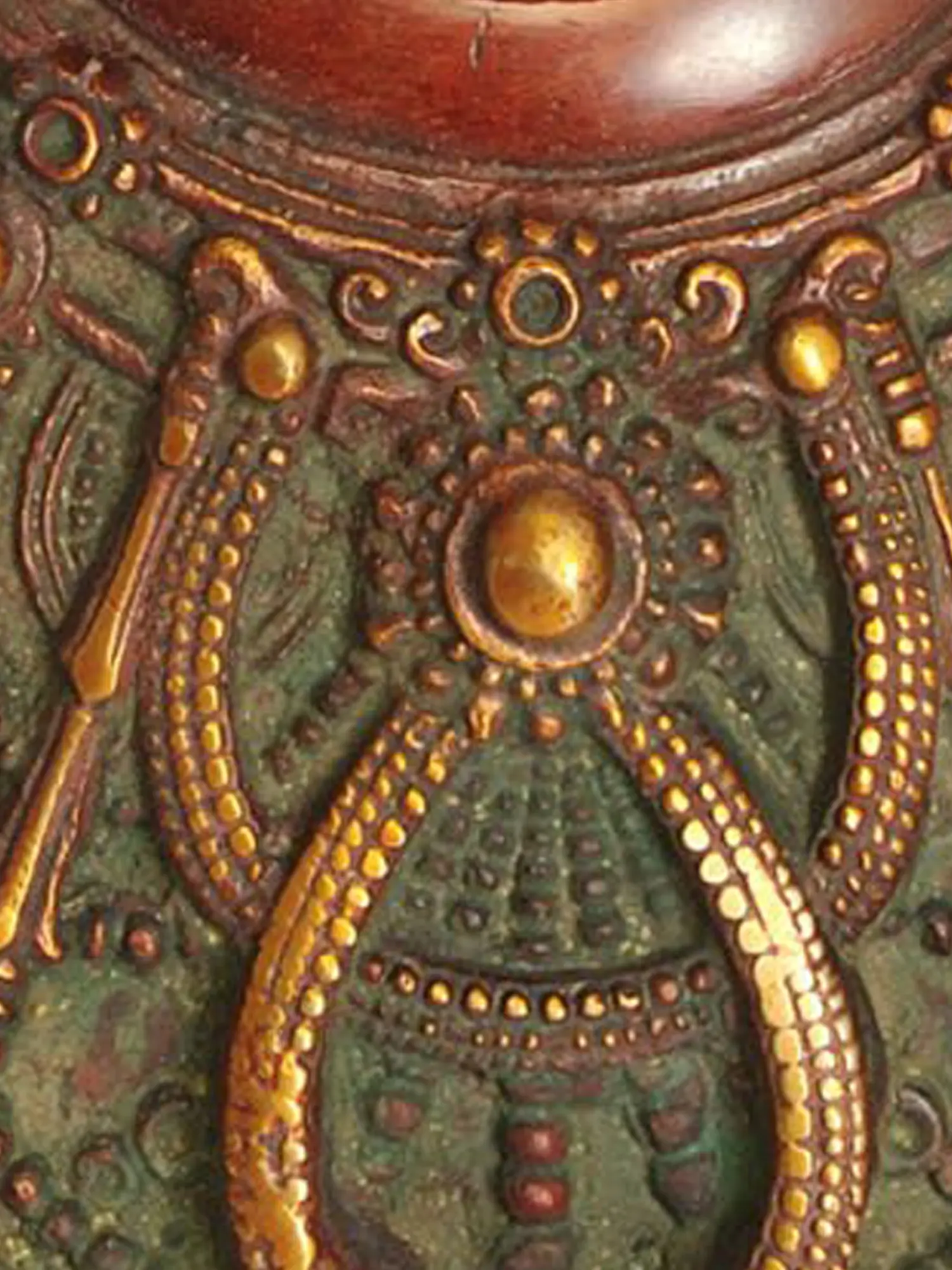 Expertly made from brass, the Goddess Green Tara Wall Hanging Mask exudes a celestial aura that enriches any setting. Green Tara is revered in Buddhism as the mother of all Buddhas and the embodiment of absolutedivinity. Her spirit is exquisitely captured in this wall hanging, which features her eyes in a peaceful glance and is embellished with fine embellishments, with a detailed and enchanting ornamentation of her hairdo and intricate detailing of her necklace.