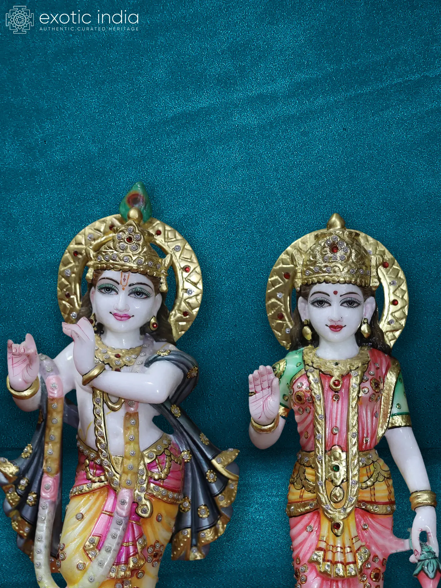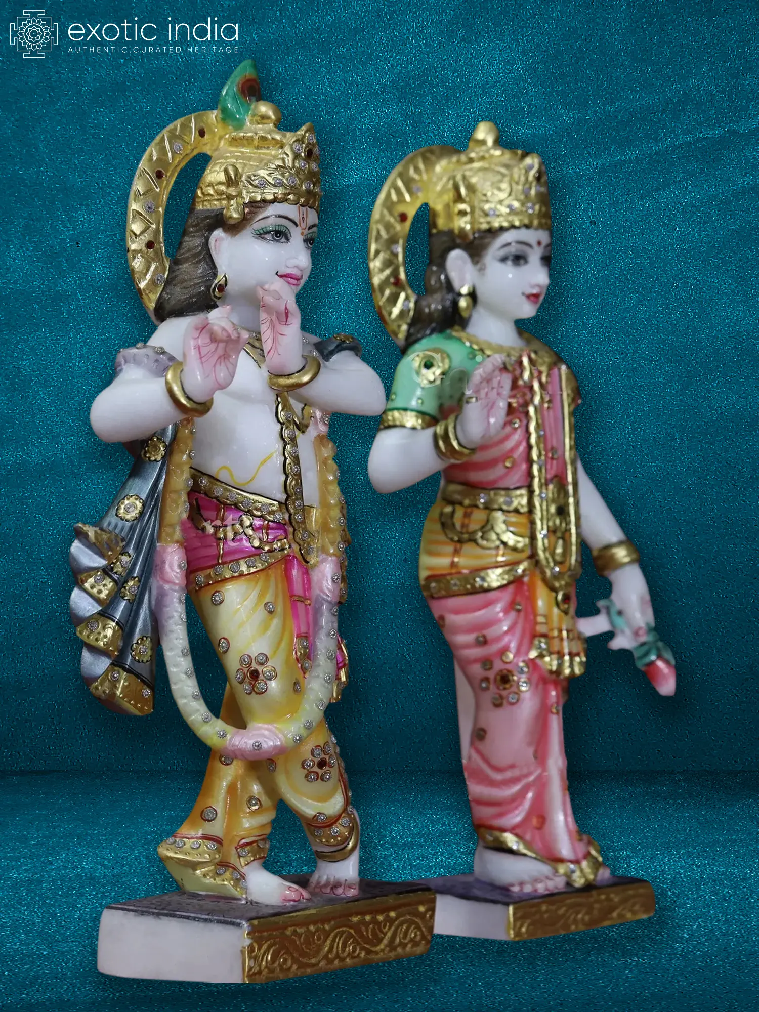 This 15-inch hand-painted statue of Radha and Krishna is a breathtaking masterpiece, sculpted from the finest Super White Makrana marble. Makrana marble, quarried from Rajasthan, India, is renowned for its purity and luminous quality, making it the perfect medium to capture the ethereal beauty of this iconic divine couple. The intricate detailing and vibrant colors bring the legendary lovers to life, making this a truly captivating addition to any home or sacred space. The statue showcases Radha and Krishna in a moment of serene togetherness, a testament to their enduring love and devotion, celebrated throughout Indian culture and mythology.