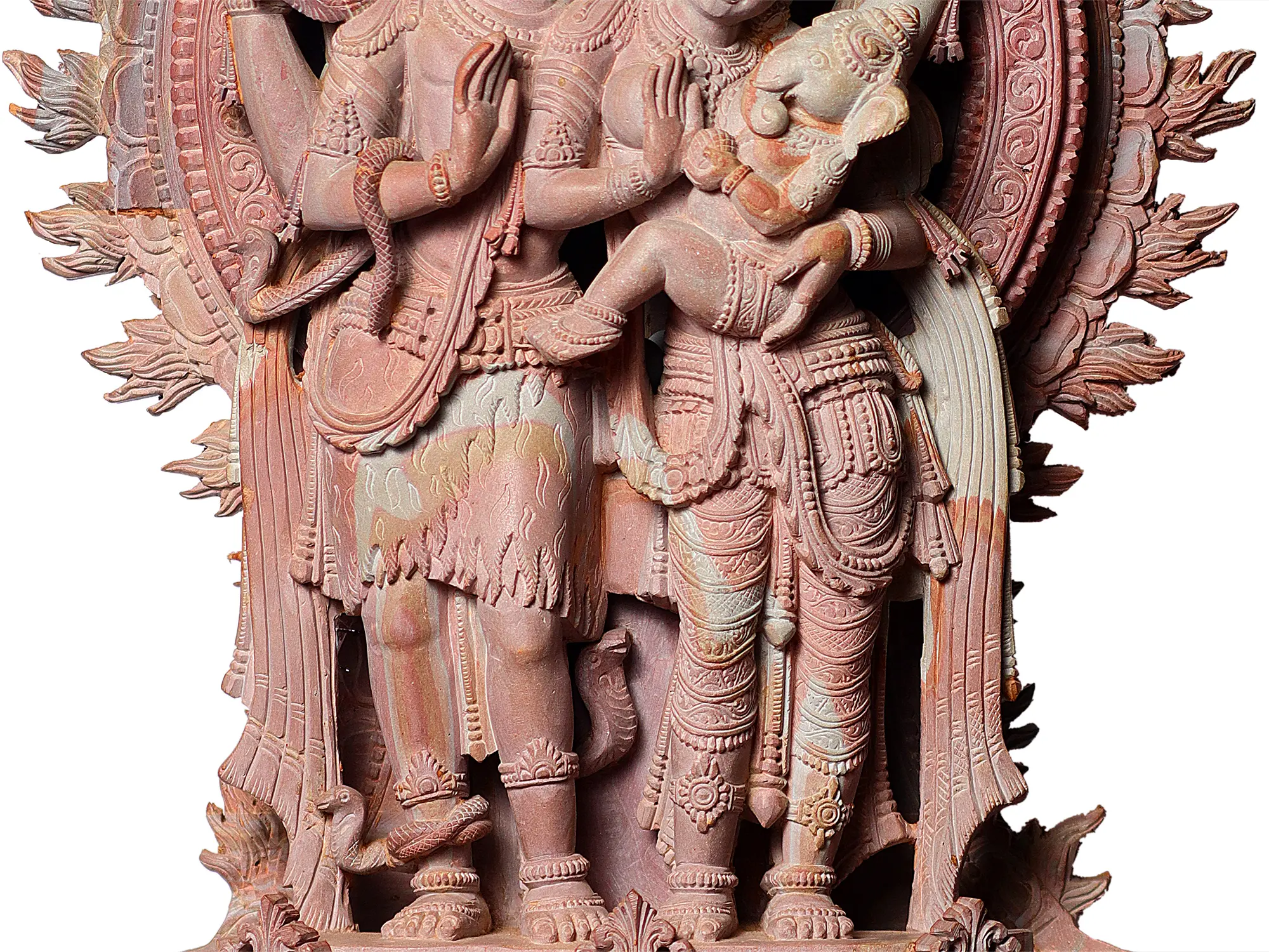 The imagery in this stone statue is the perfection of the universe, the pinnacle of auspiciousness, that manifests in the form of Ganesha, and originates from the union of Shiva and Shakti, the supreme father and mother.