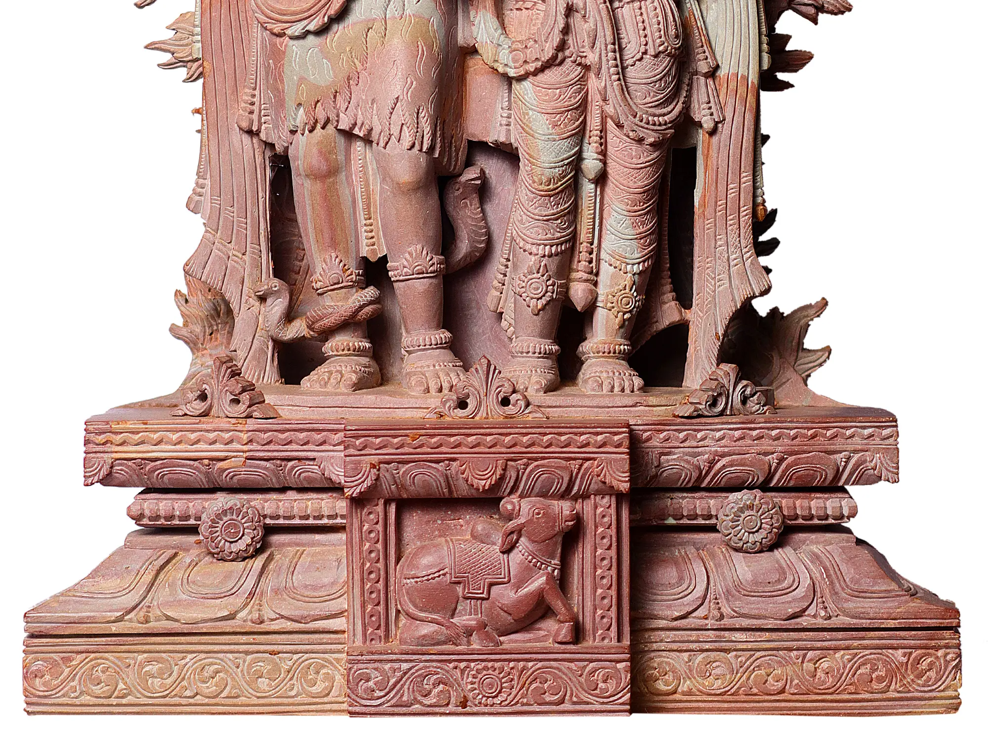 Chaturbhuja or four-armed Shiva is awe-inspiringly adorned with Naagabhushan (serpent ornaments) from head to toe, a tiger hide garment, and the crescent moon in his tresses, while Uma is beautified by a lovely hairdo, jeweled ornaments, an intricately patterned dhoti, and an ornate girdle. This glorious scene is outlined by the sculptor with a grand aureole, embellished with lotus petals, purifying flames, and a striking Kirtimukha or face of glory- the demon who devoured himself to prove his devotion to Shiva. On the lotus pedestal, Nandi, Shiva’s mount sits, as a powerful emblem of Shaivism.