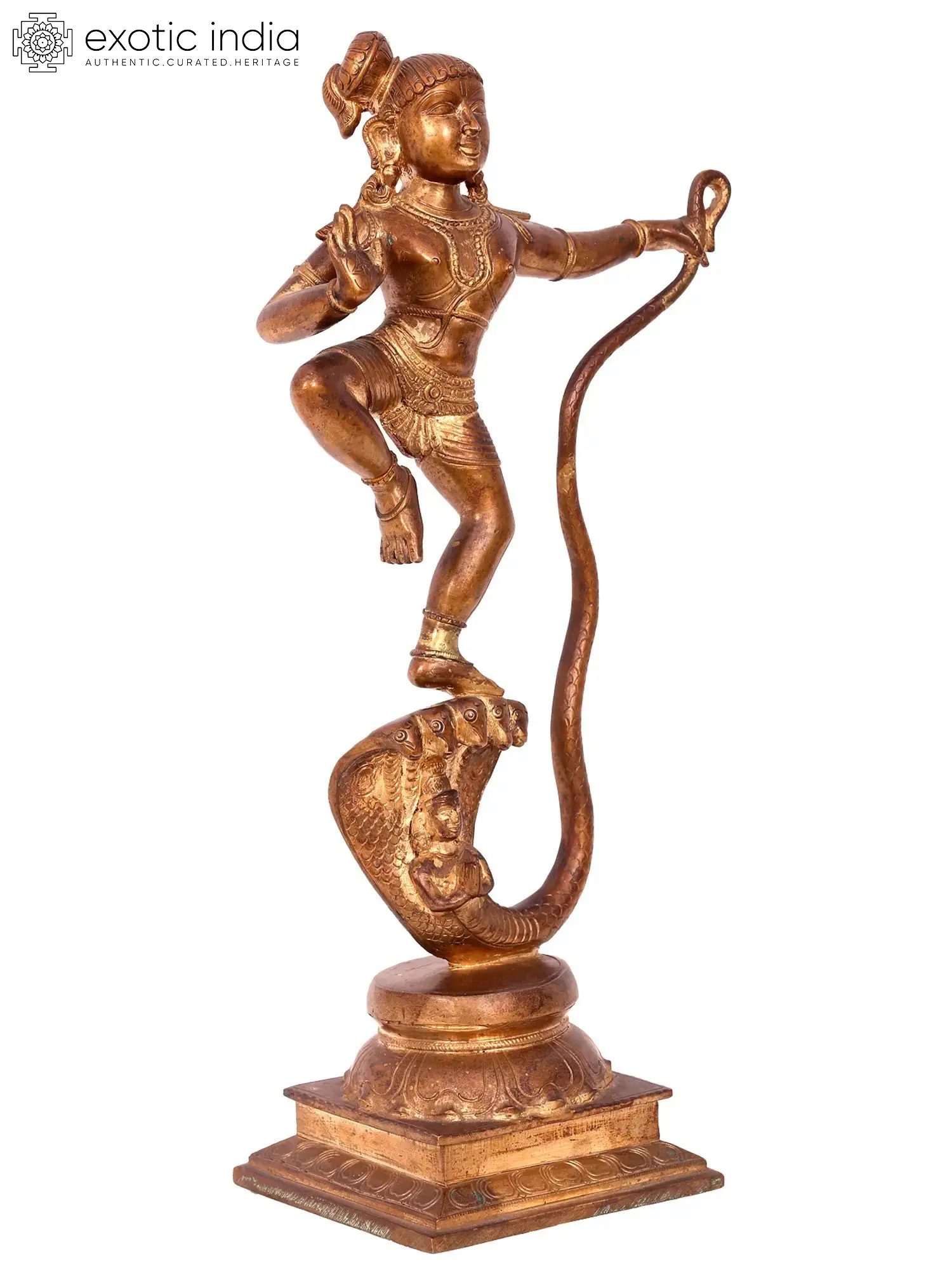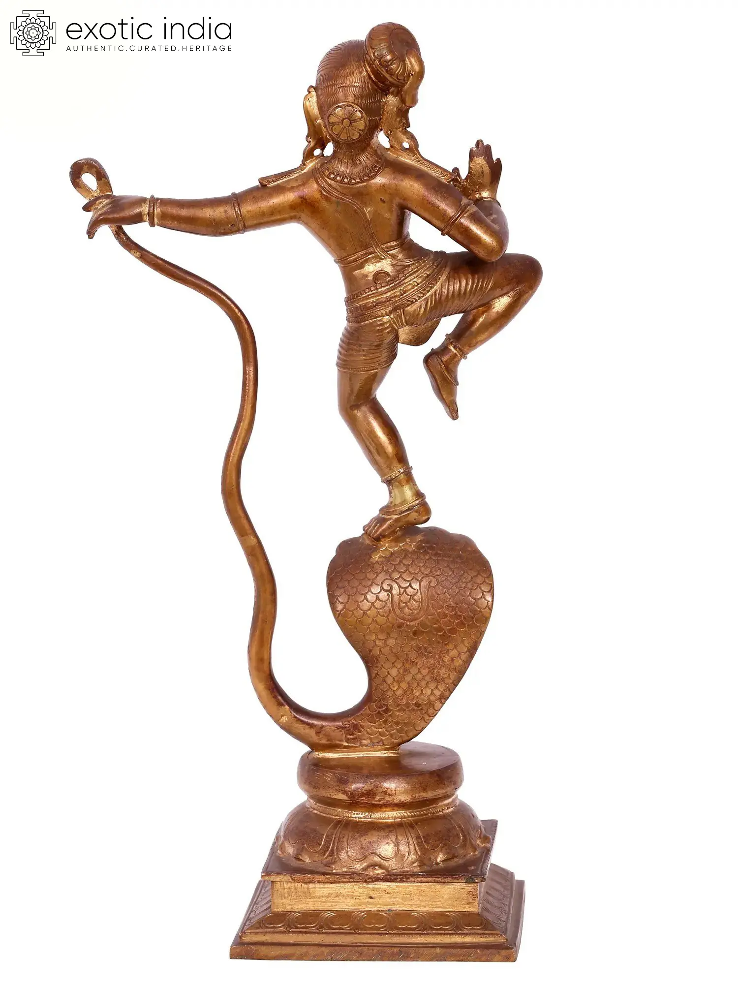 In the cosmic ballet of divine grace, Lord Krishna, the eternal flutist, embraced the turbulent coils of Kaliya, a venomous serpent that tainted the sacred Yamuna. The ethereal dance unfolded as Krishna, with resplendent courage, engaged in a celestial duel. His nimble feet glided effortlessly across the serpent’s multiple hoods, subduing the toxic menace. In the crescendo of this cosmic symphony, Krishna, the cosmic dancer, seized the tail of Kaliya, orchestrating a sublime victory. With his right hand held high in Abhaya Mudra, the gesture of fearlessness, Krishna bestowed tranquillity, signifying the triumph of divine love over adversity.